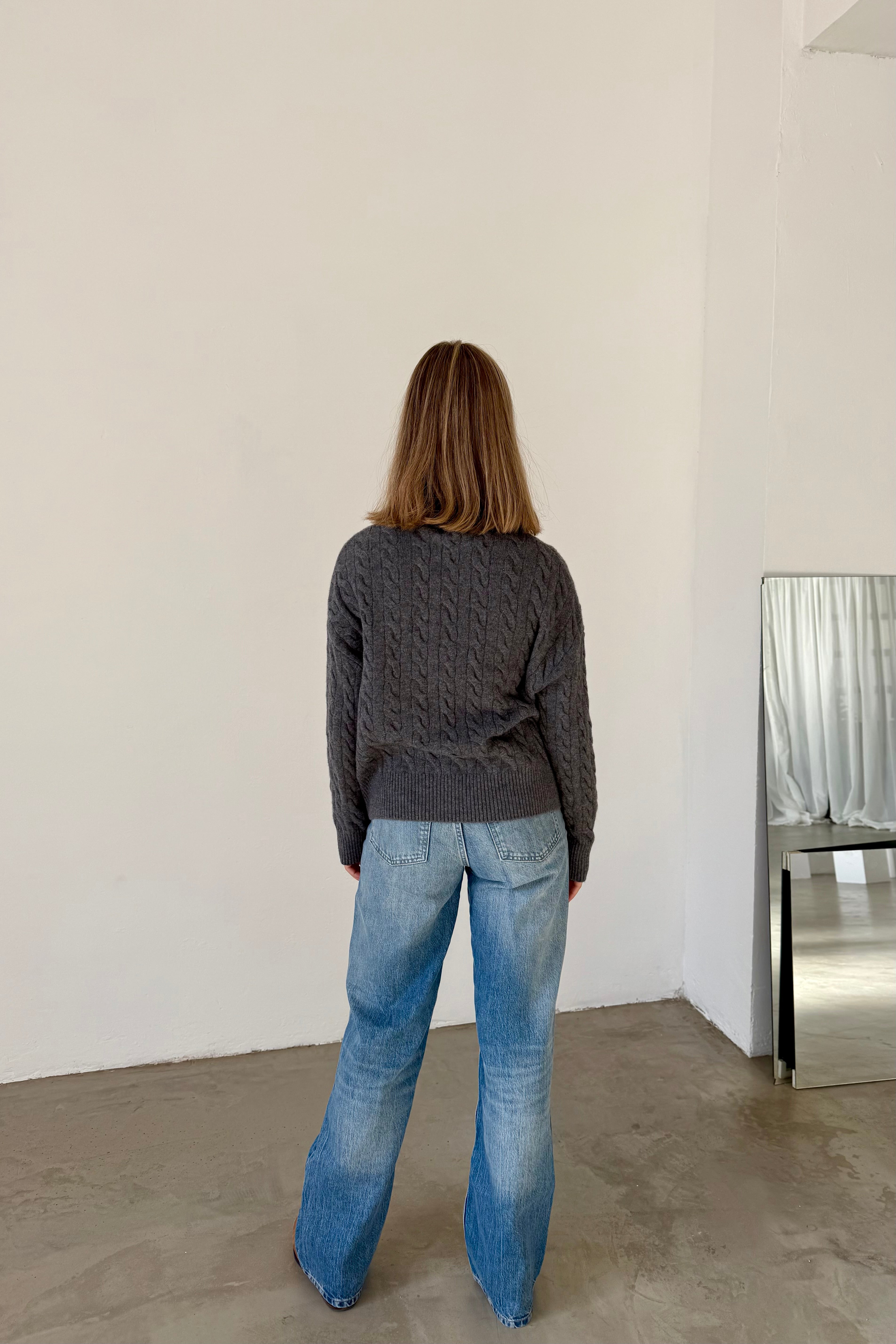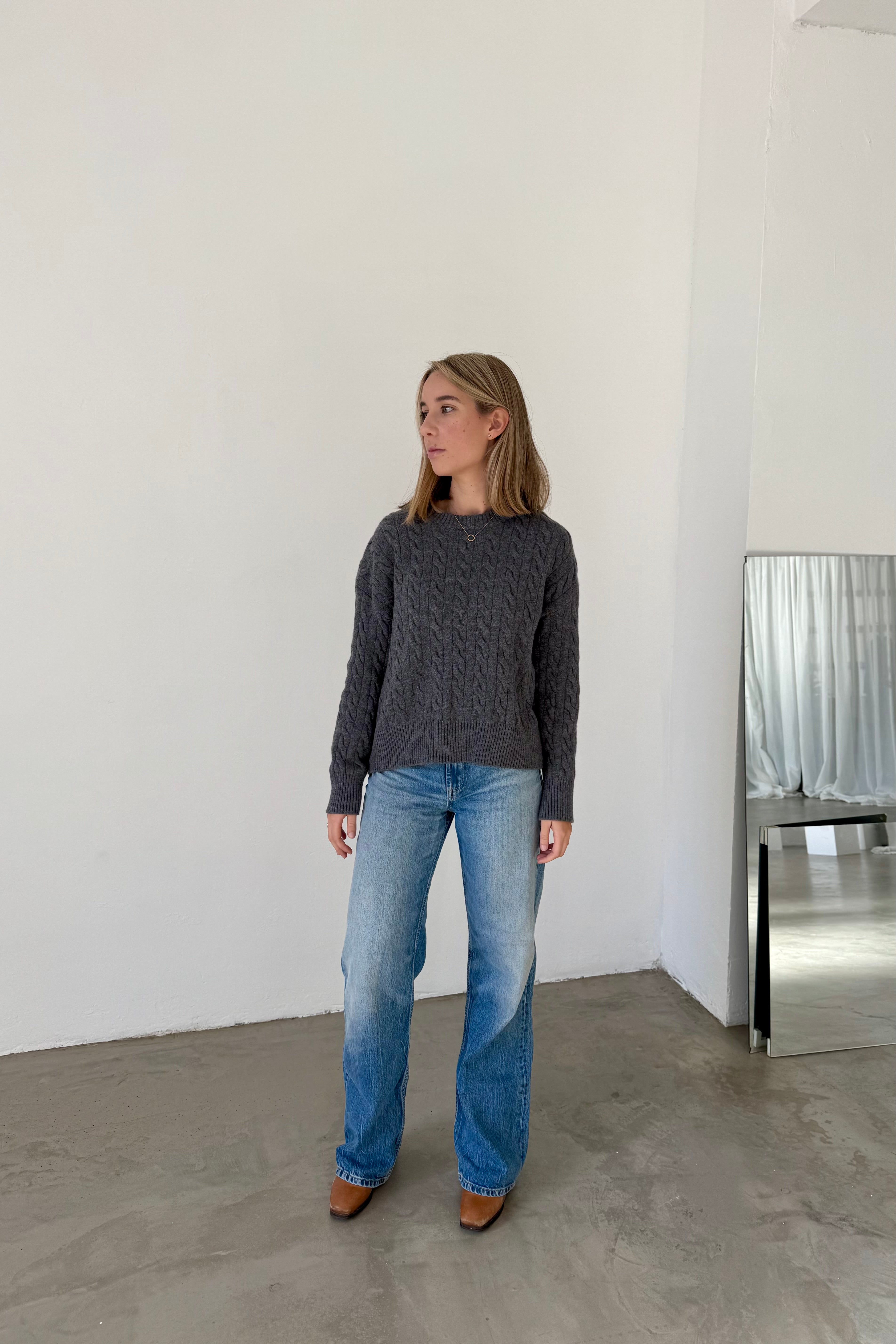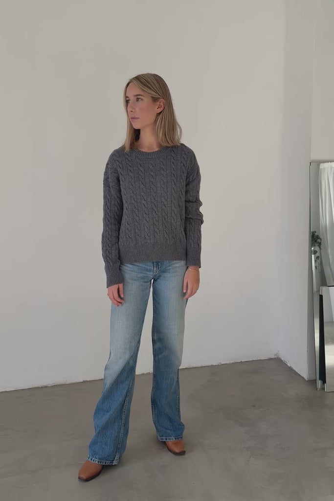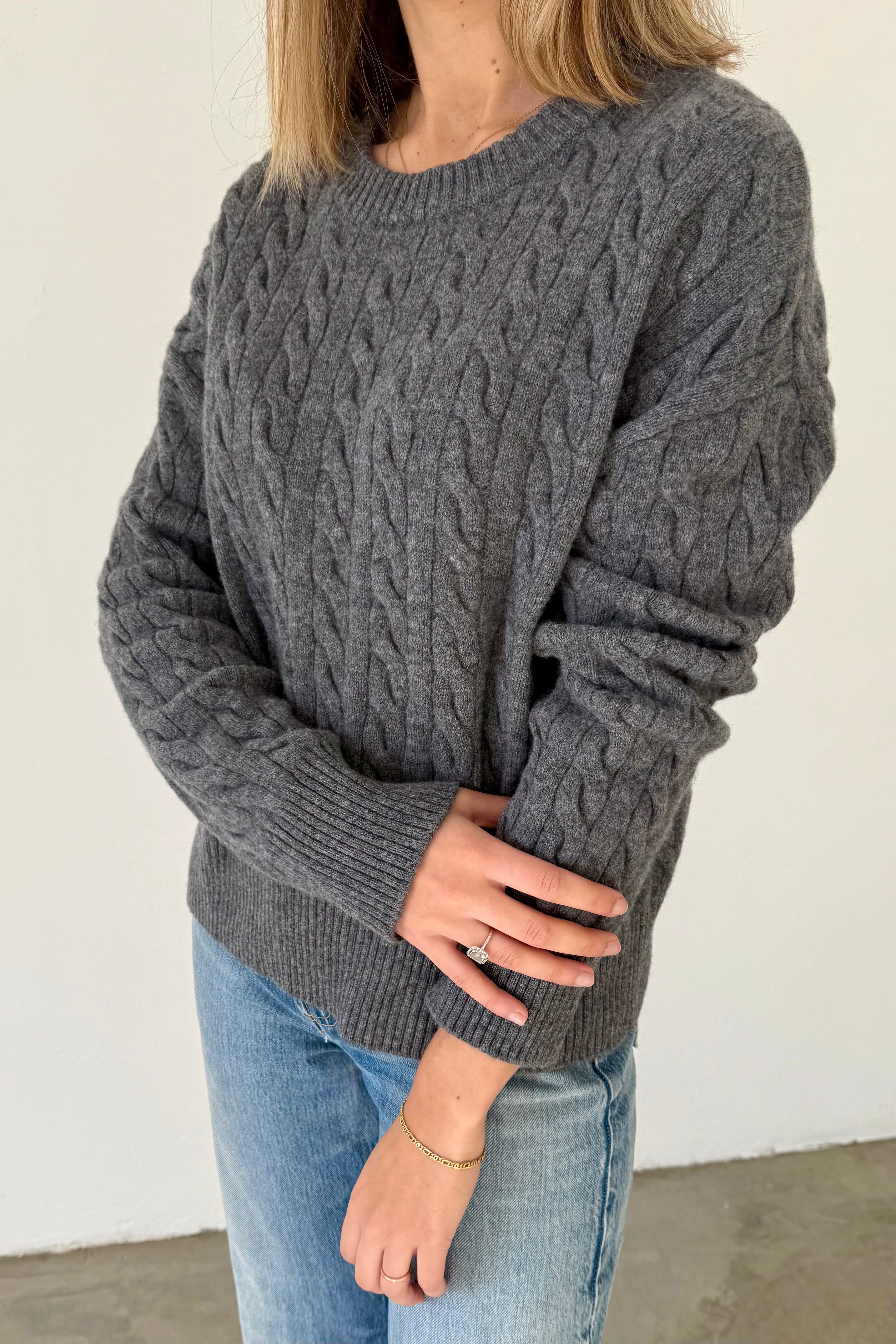 Chunky-knit sweater with an all-over cable design. Features a ribbed crew neckline, ribbed cuffs and hem, and classic long sleeves. Finished in a mid-grey tone with a soft hand feel and dense structure.