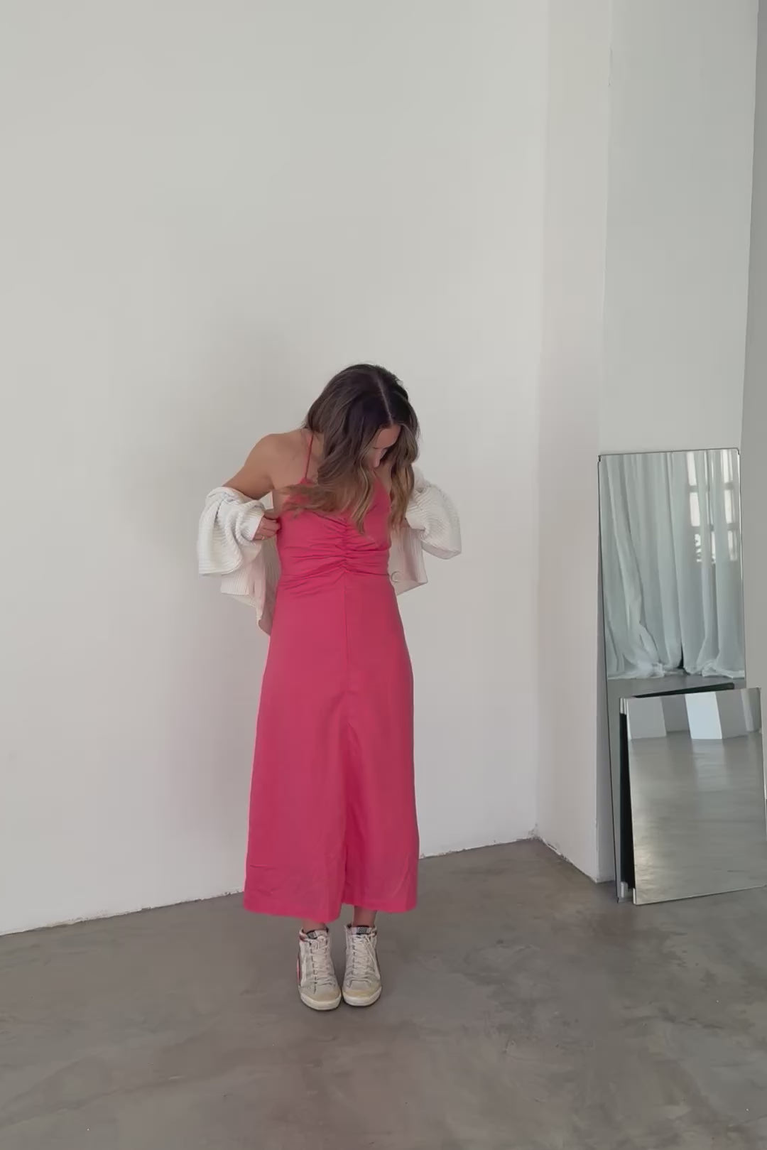 Midi dress with thin straps, a V-neckline, and a central front ruching detail. Designed with an integrated short sleeve for added structure. Lightweight fabric with a pink micro gingham check. Features a concealed back zip and a small slit at the hem.