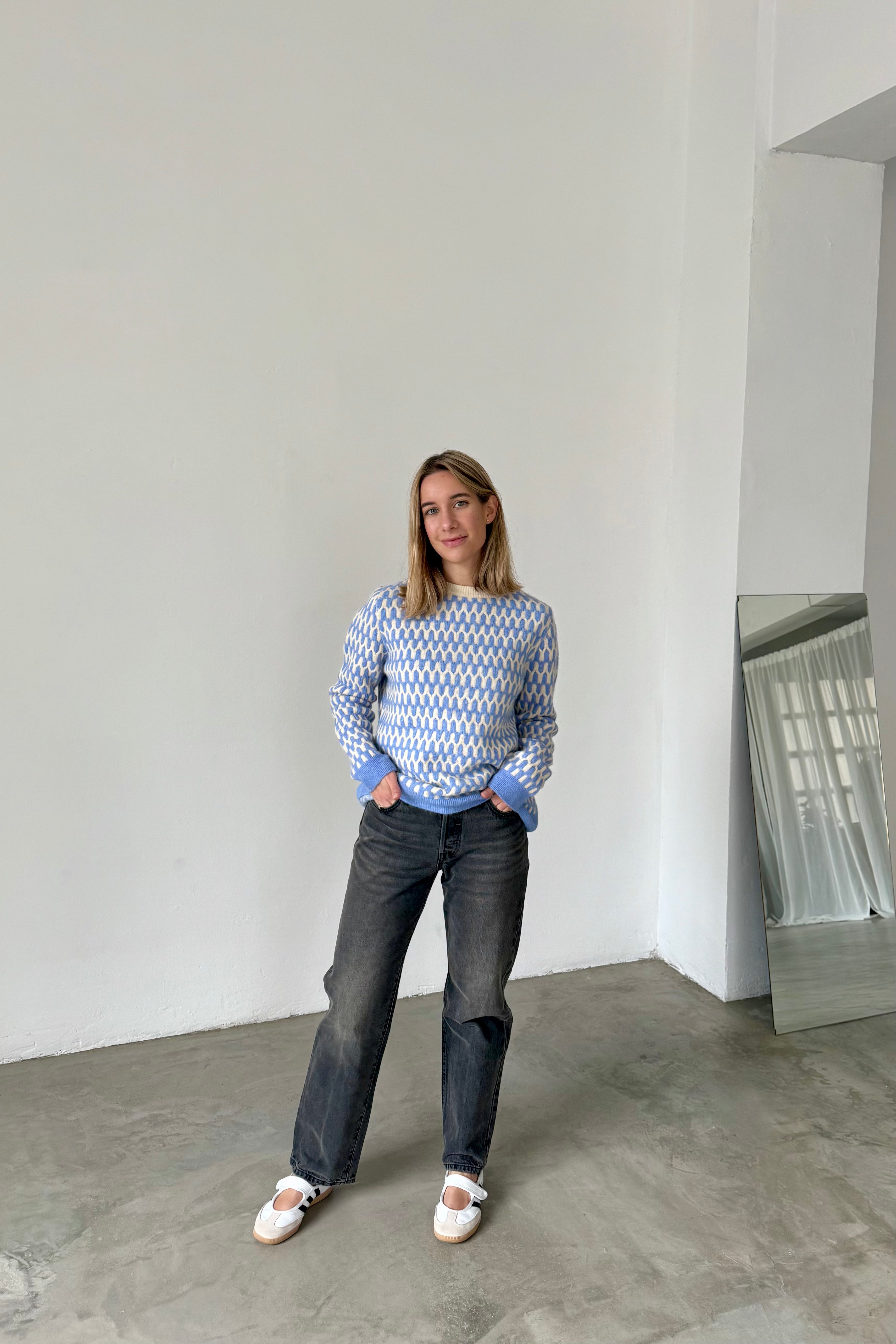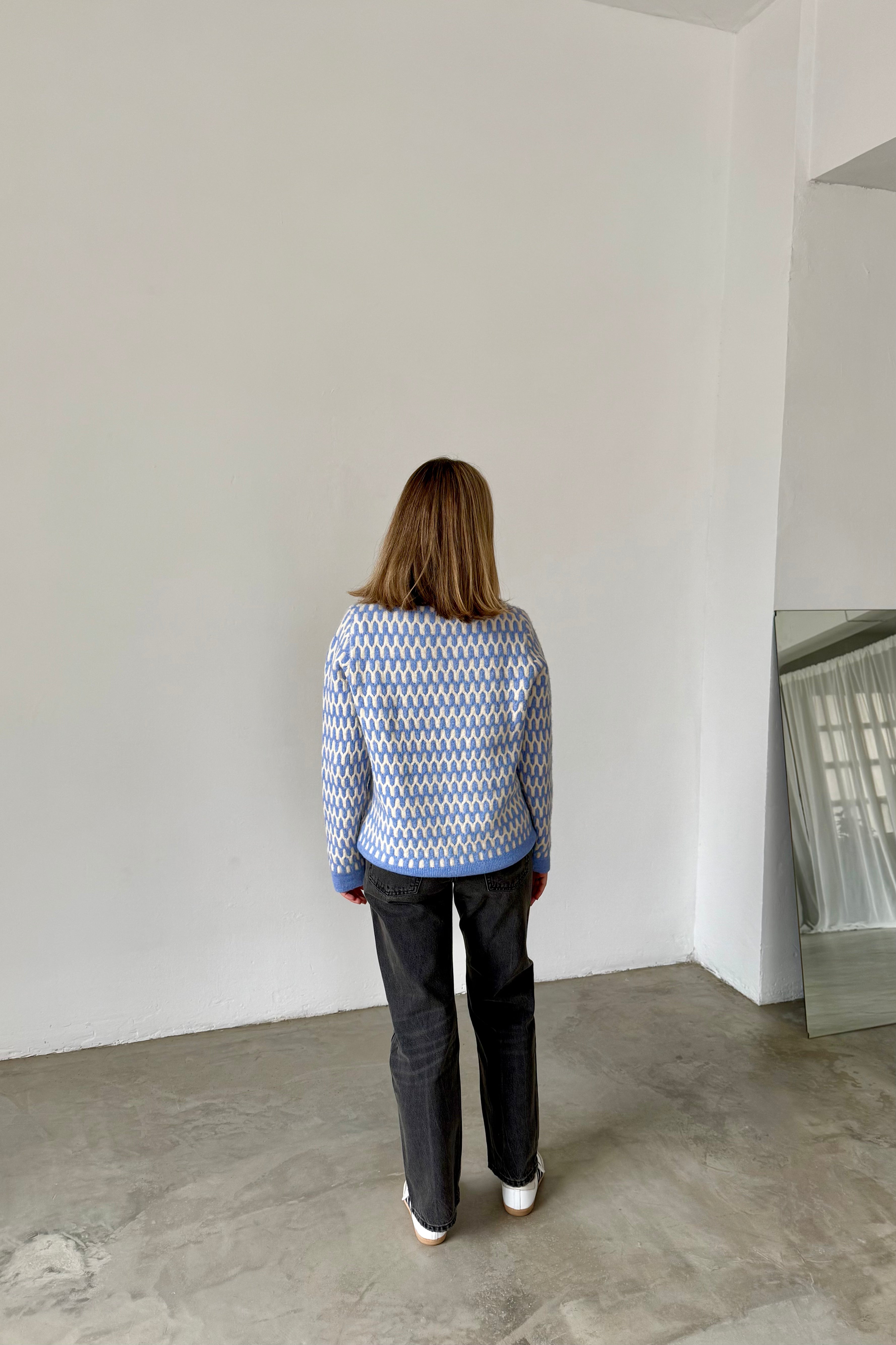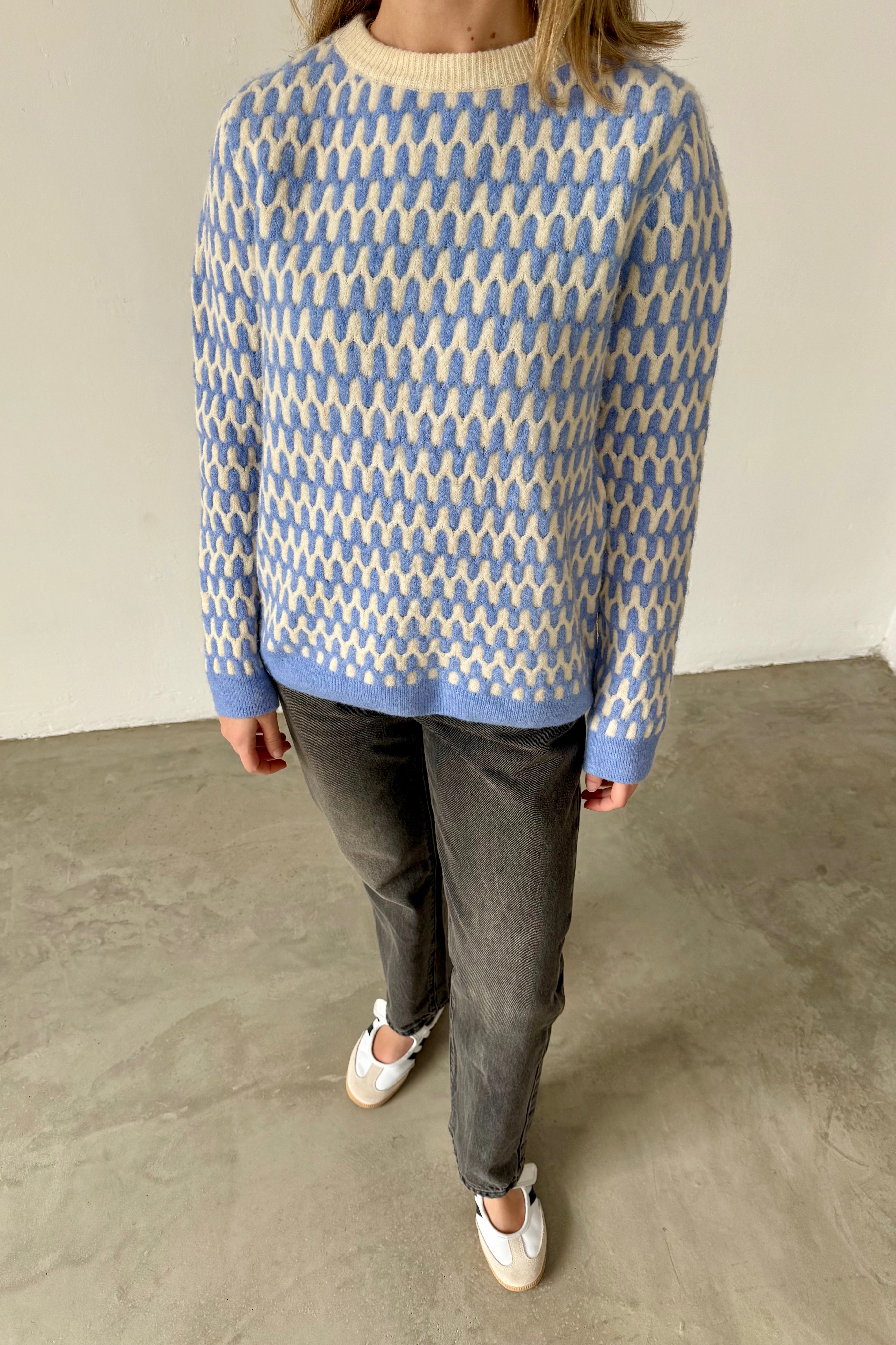 Blue and white patterned sweater