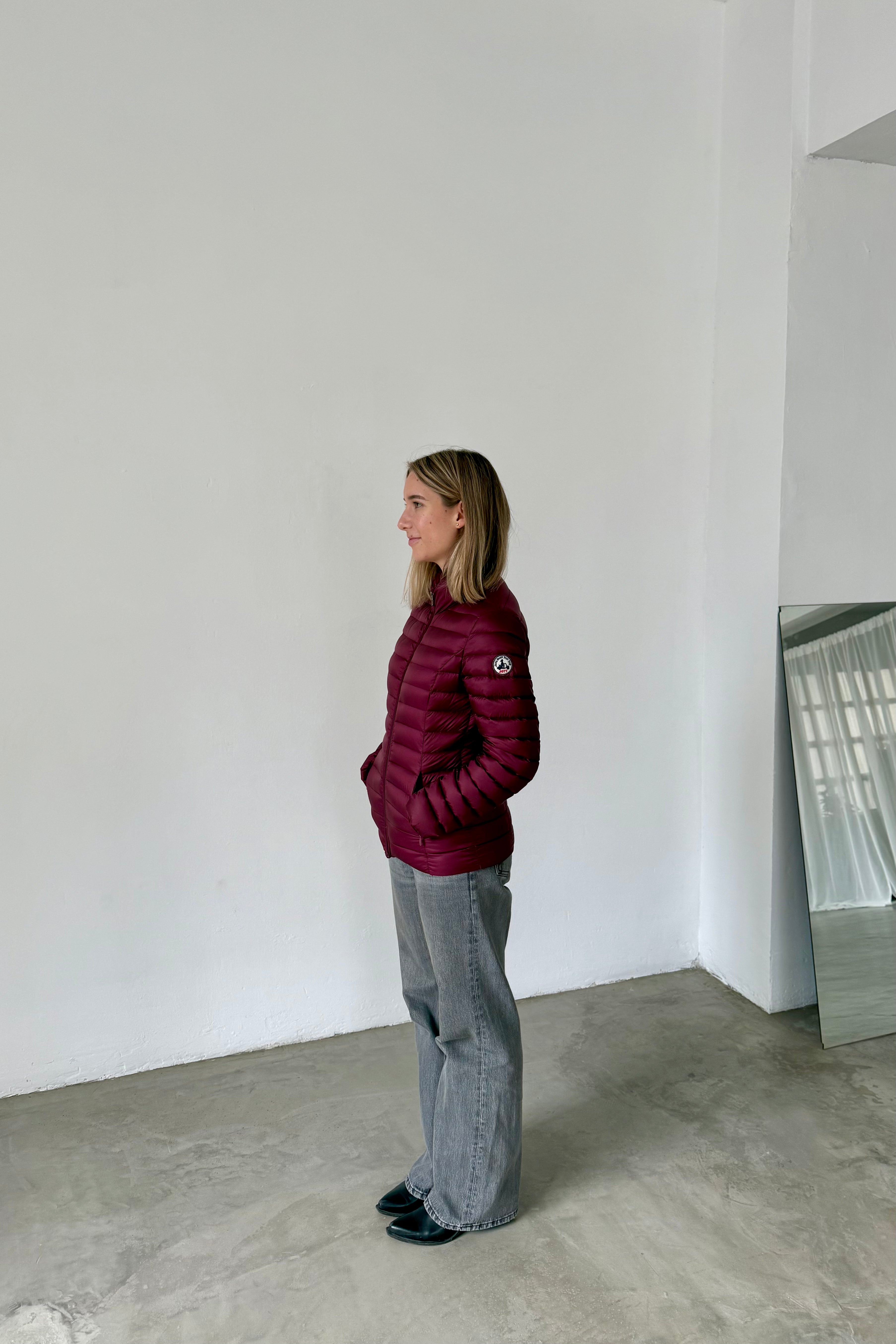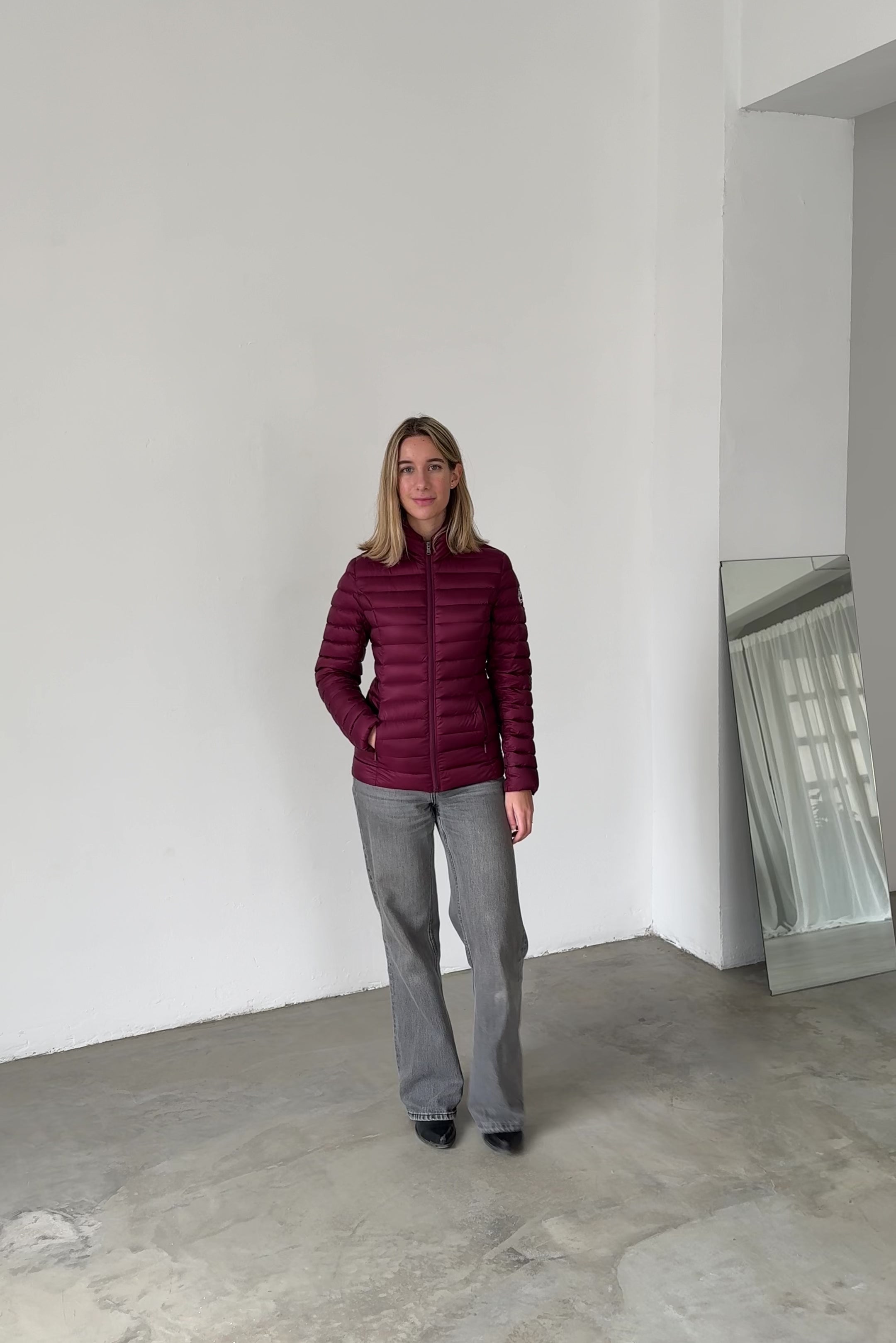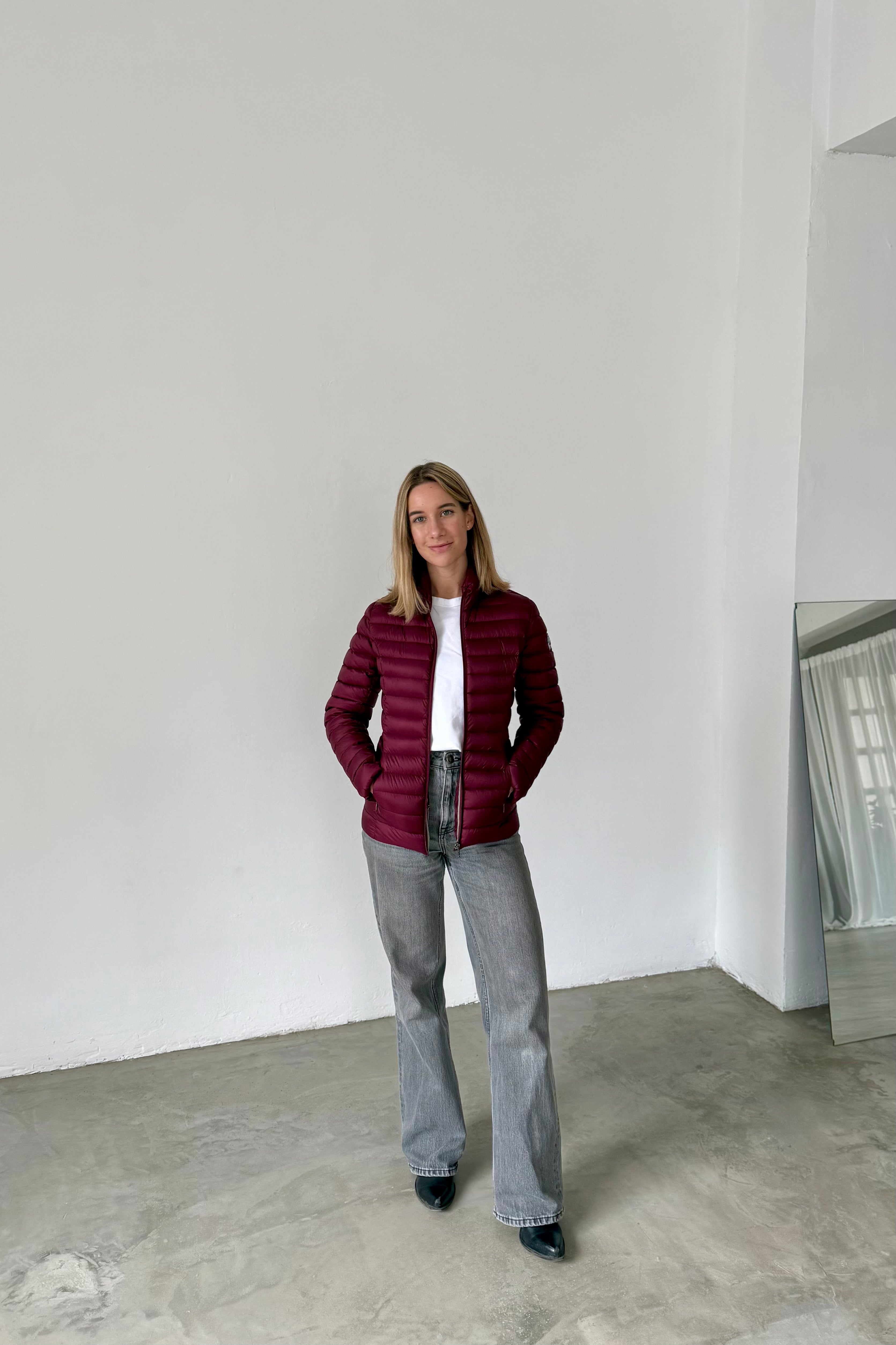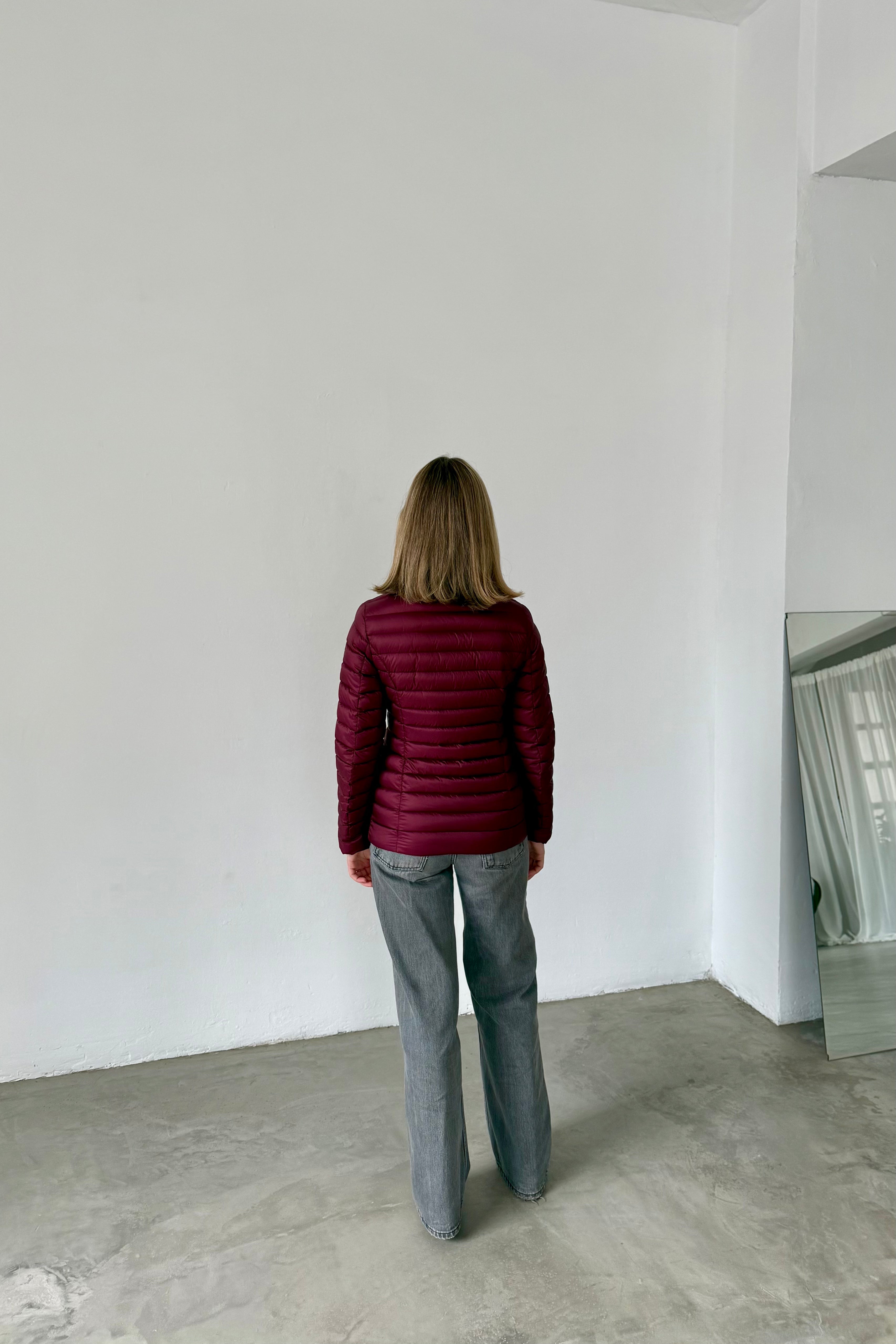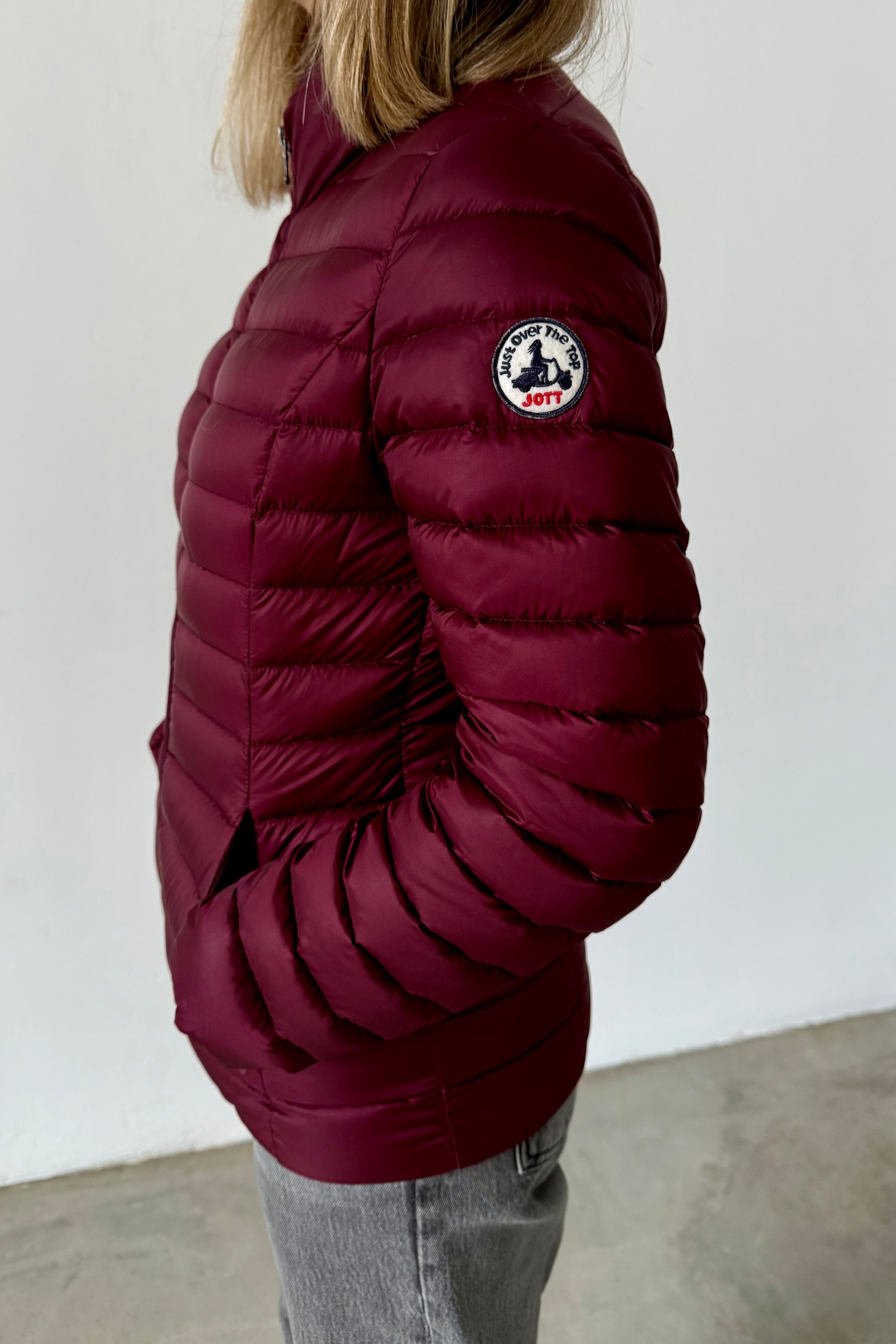 Lightweight padded jacket in burgundy. High collar, long sleeves, and front zip closure. Horizontal quilted construction with regular fit.