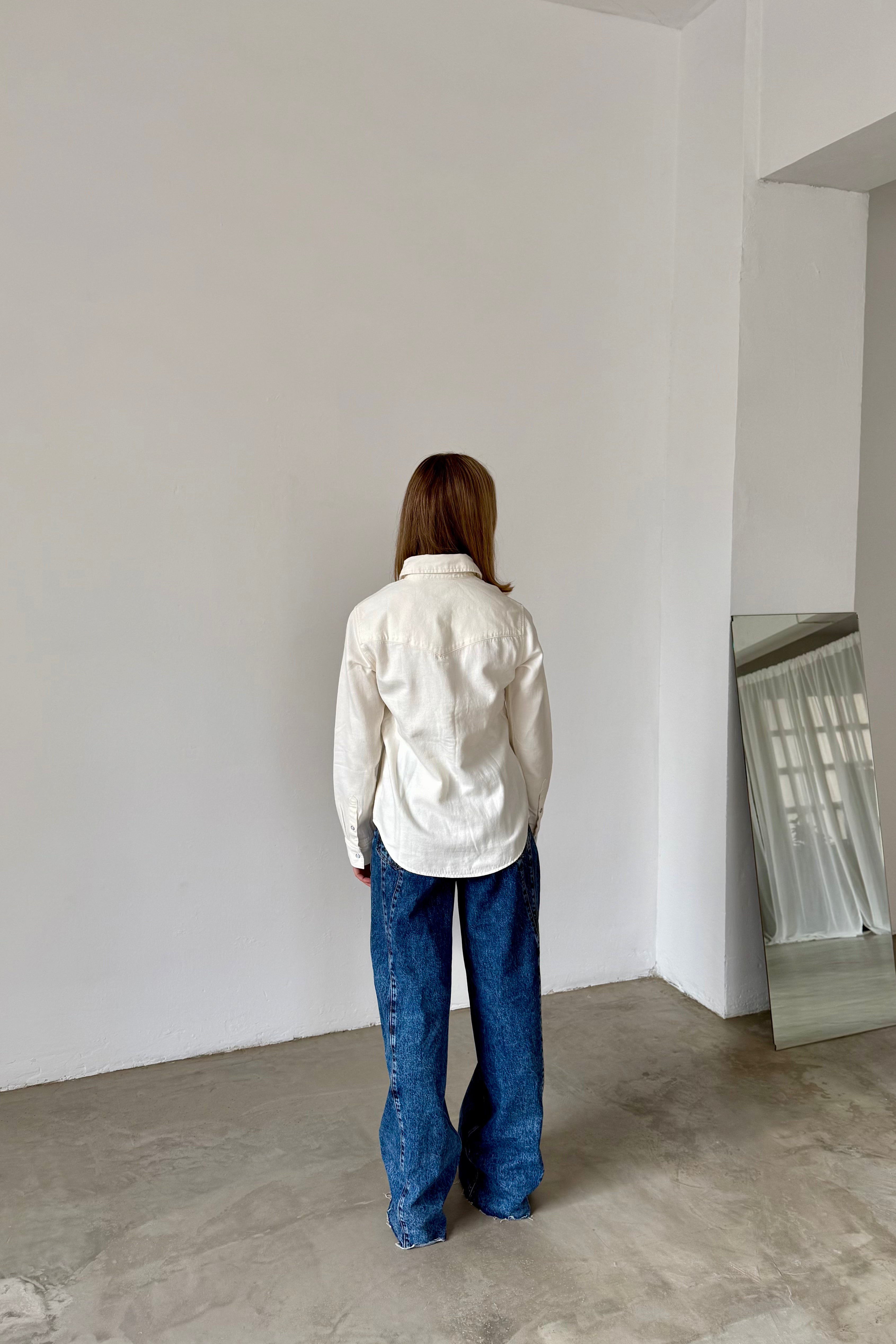 Wide-leg dark blue denim jeans with decorative front seam detailing. High-rise waist and wide legs with a frayed hem. A modern, flattering design that elevates any casual outfit.