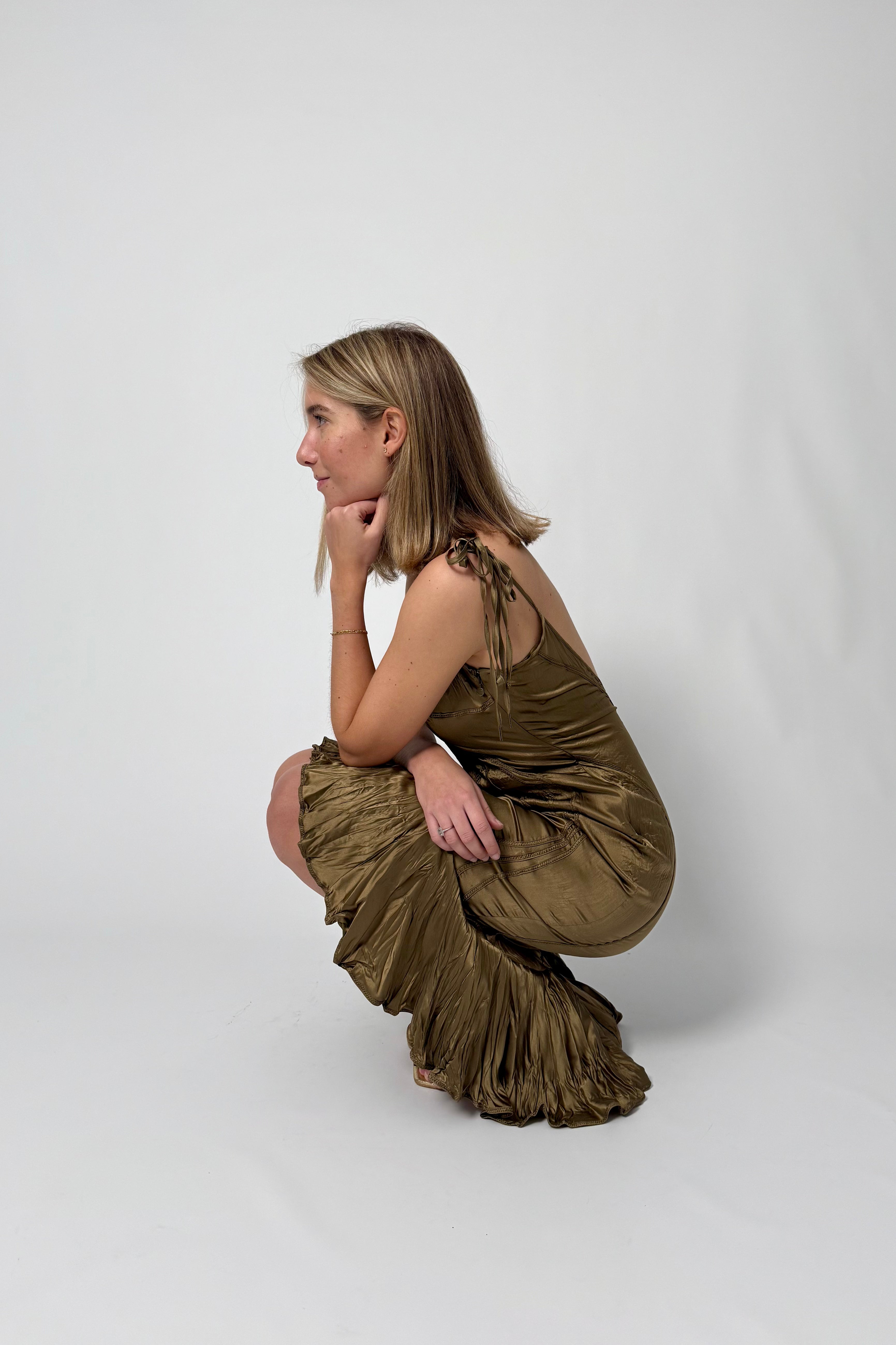 Midi dress in glossy satin silk fabric, in a brown tone. Wrap-style design with delicate straps and ruched detailing.