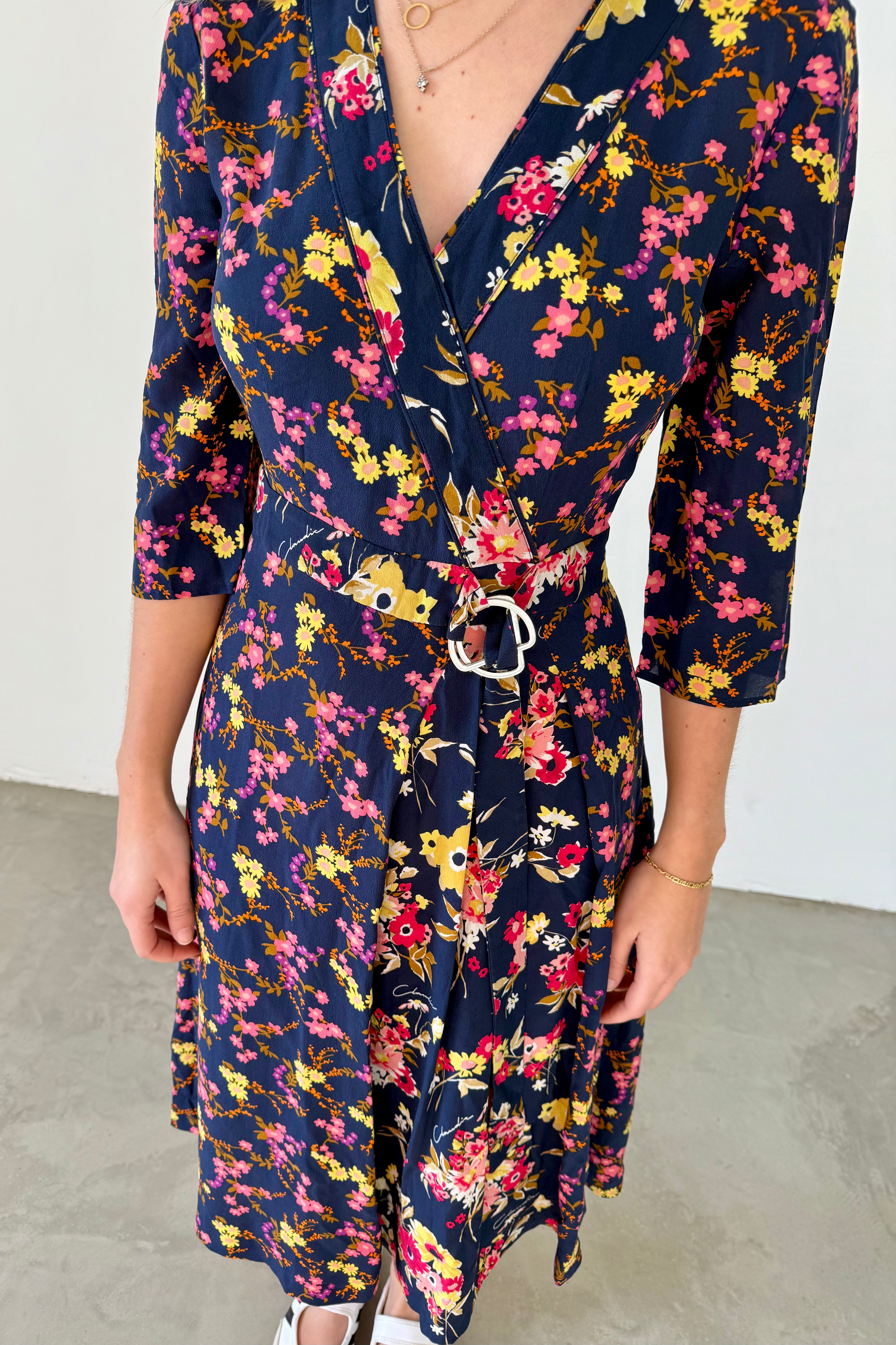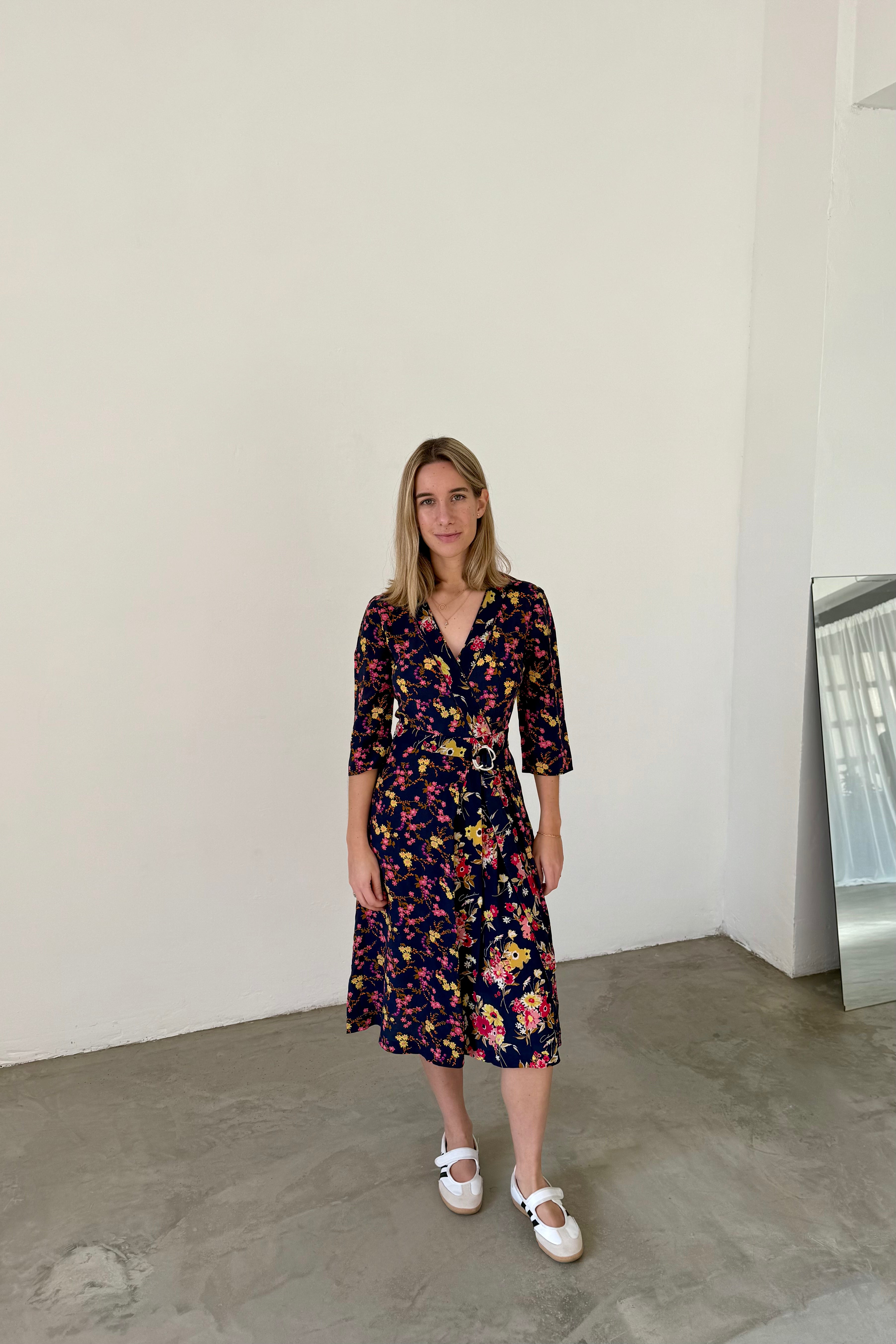 Navy blue midi dress with multicolour floral print. Wrap-style V-neckline, three-quarter sleeves, matching fabric belt, defined waist, and midi-length skirt with fluid drape. Lightweight, non-stretch fabric.