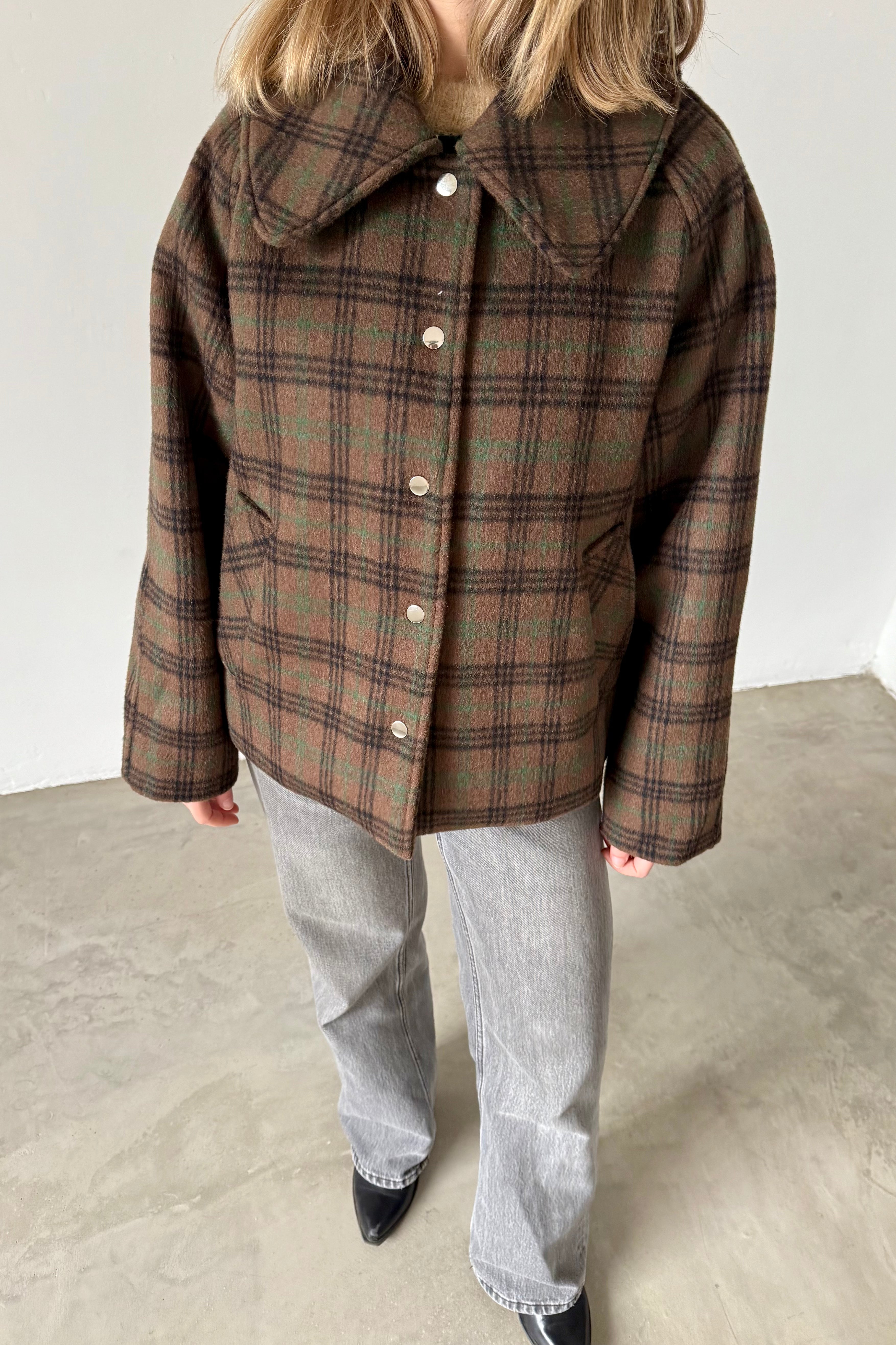 The short coat in khaki grey features a front button closure and two practical front pockets. The design includes an elegant wide collar and raglan sleeves for greater freedom of movement.