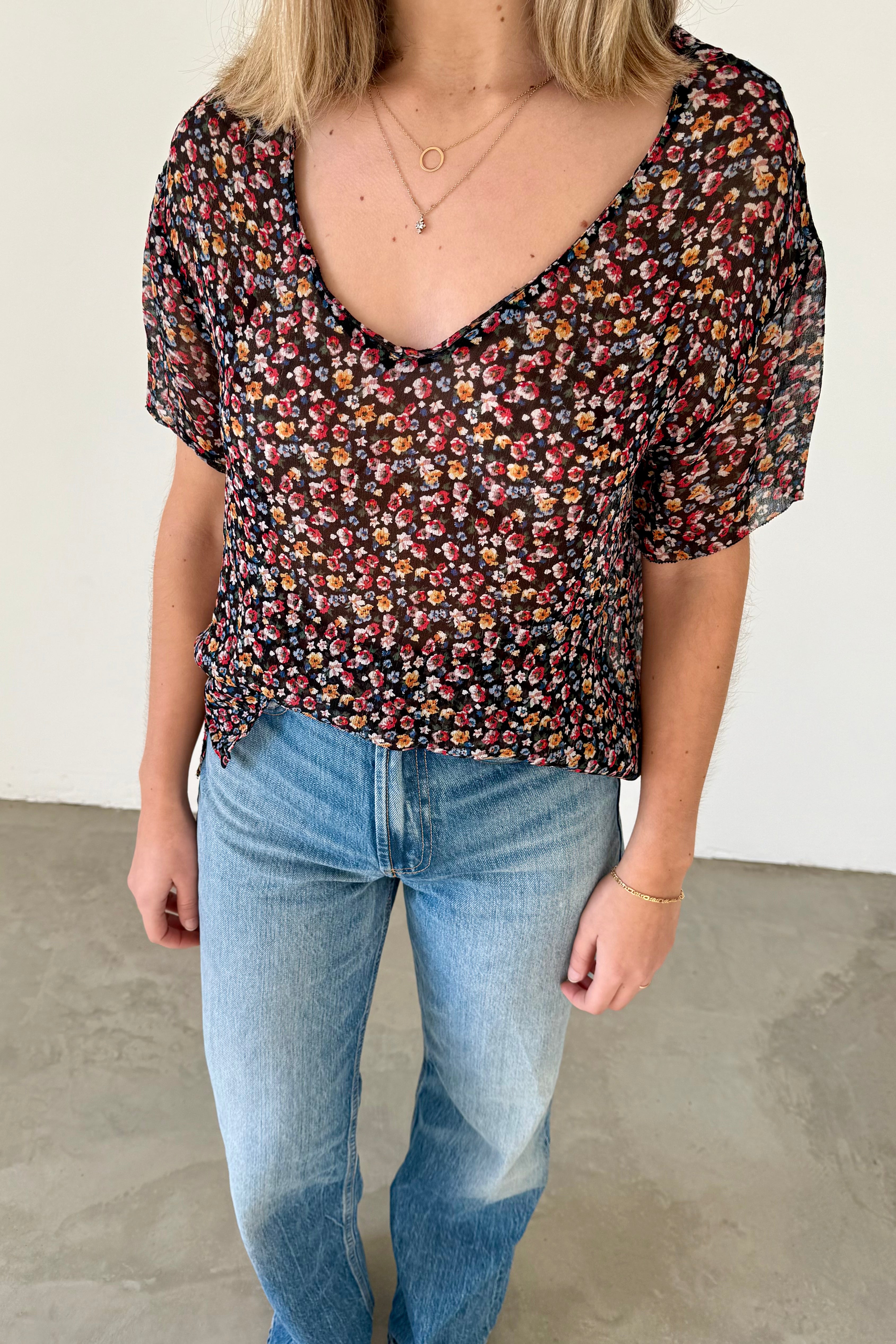 Printed blouse with multicolour floral motif on a black background. Short sleeves, V-neckline, straight cut, and semi-sheer fabric. Straight hem with no visible slits.