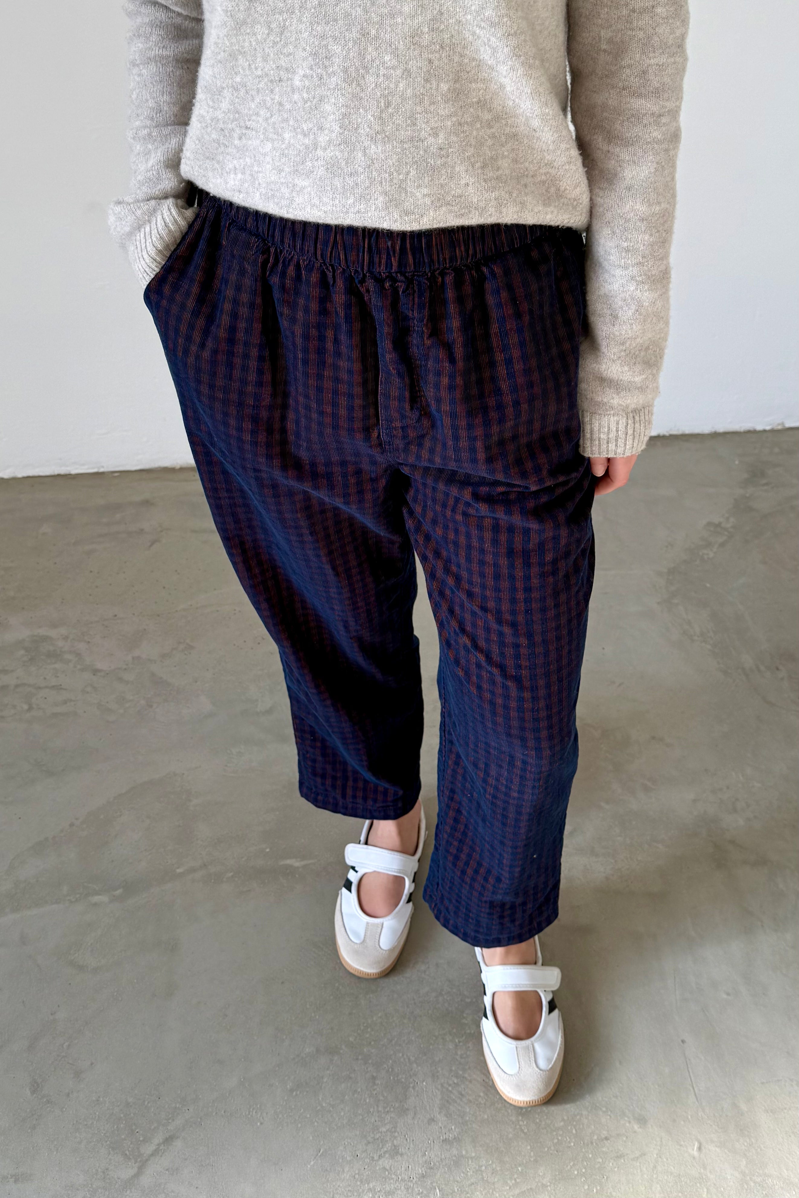 Check-pattern trousers by Indi&Cold in navy. Elastic waistband and straight leg. Ankle-length with lightweight construction.
