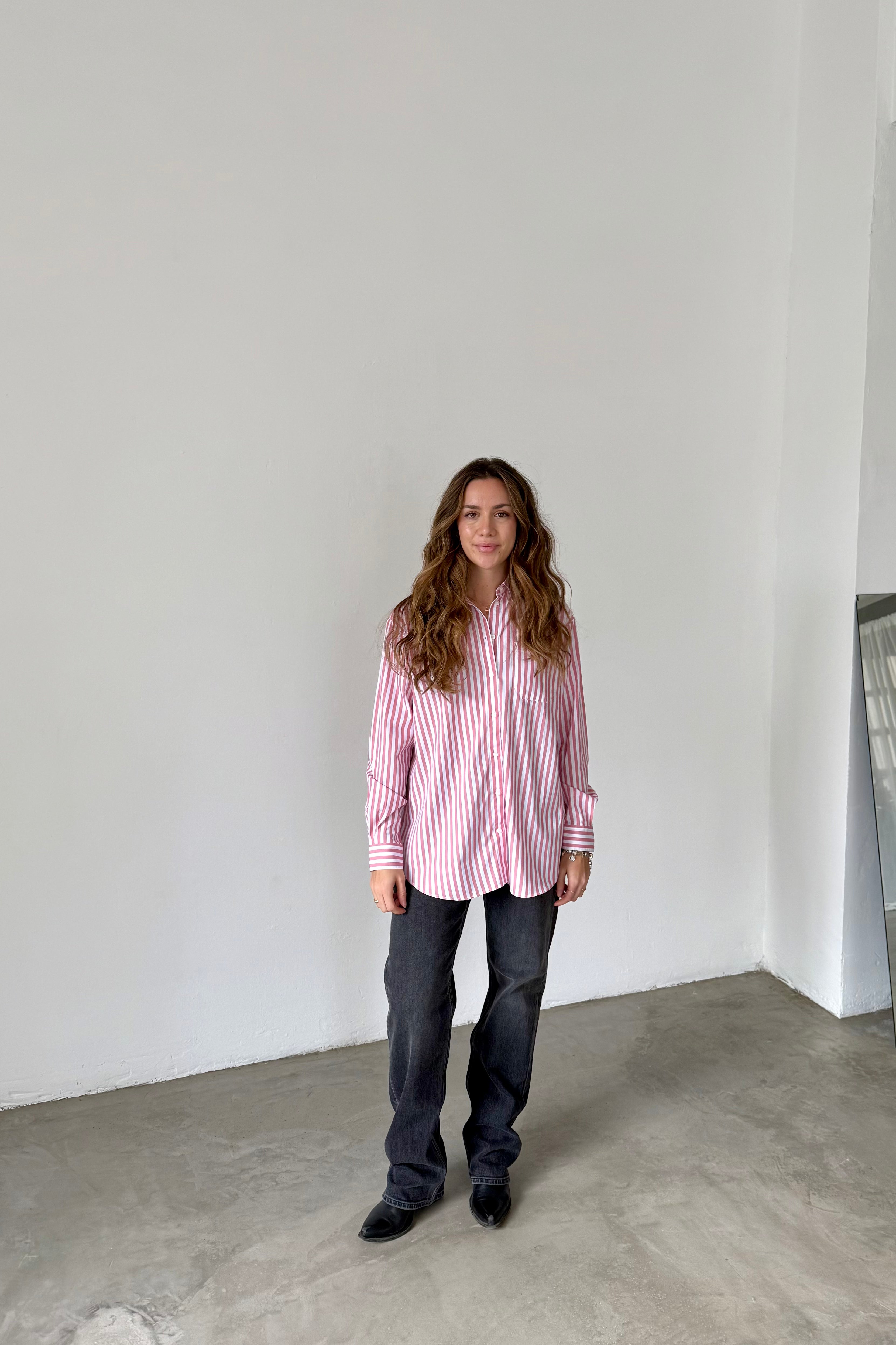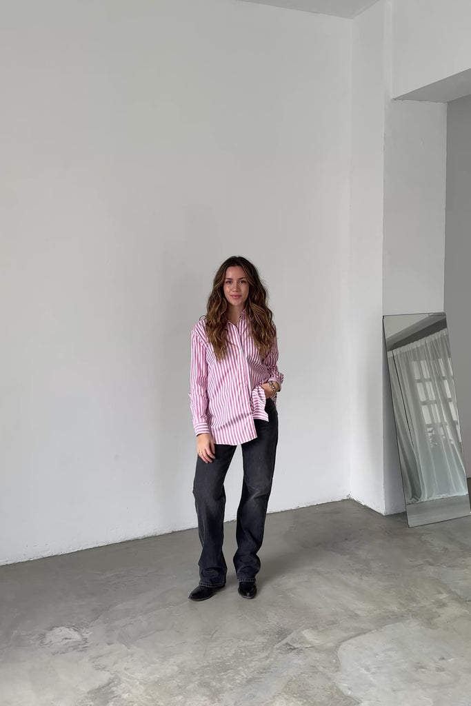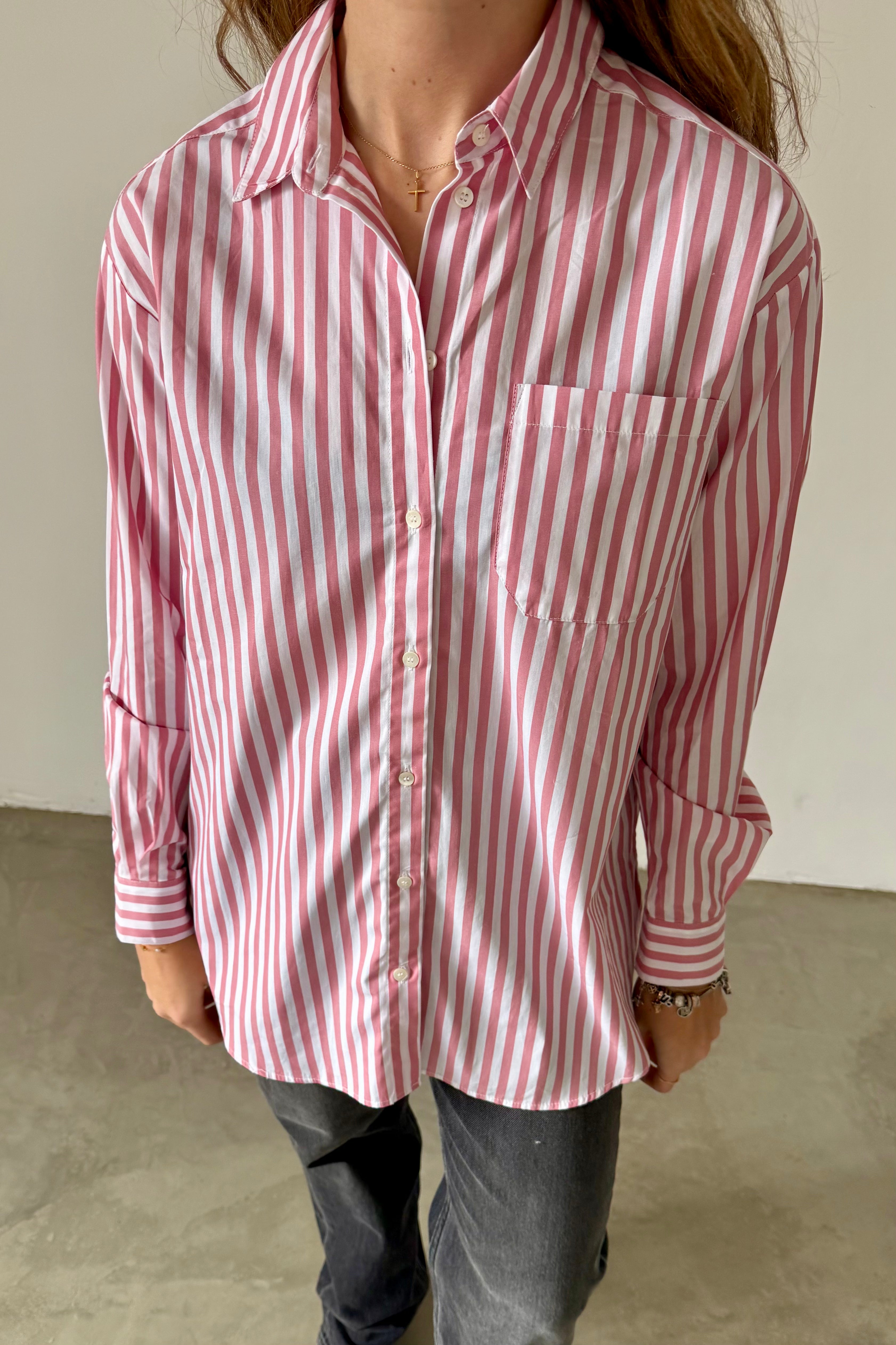 Sézane cotton poplin shirt with vertical stripes in pink and white tones. Relaxed fit with a chest pocket, classic shirt collar, and buttoned cuffs. A timeless essential that adds color and freshness to any look.