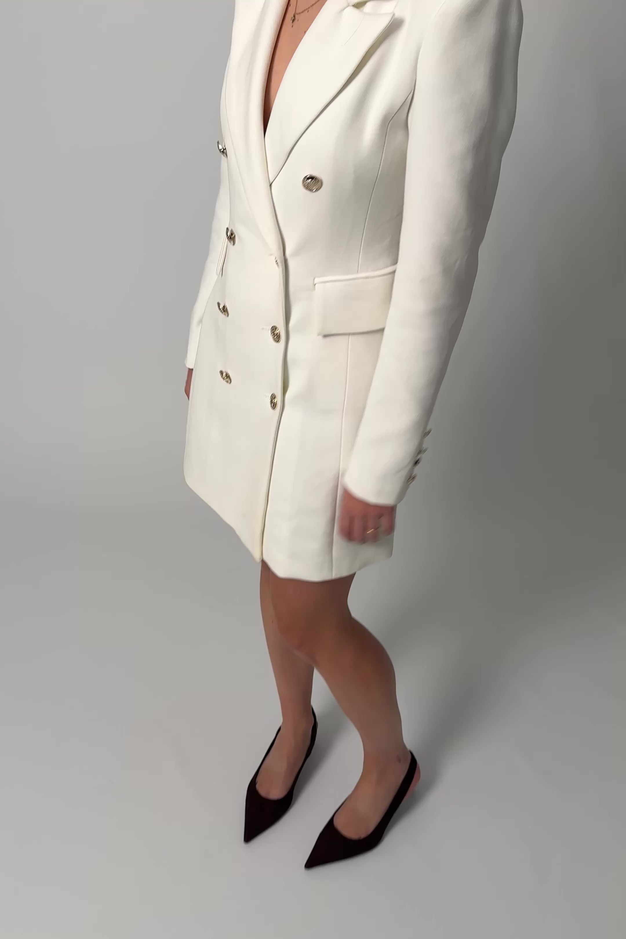 White blazer-style dress with gold buttons.