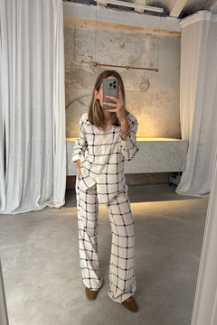 Long-sleeve shirt crafted from a lightweight fabric with an off-white base and a black check pattern. Features a straight cut, classic collar, front button fastening, and buttoned cuffs.