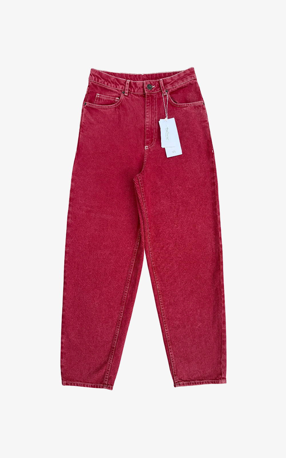 Pantalón vaquero en tono rojo lavado, de tiro alto y pierna recta. Confeccionado en algodón con textura denim suave y resistente. Diseño clásico con cinco bolsillos y cierre frontal de botón y cremallera.