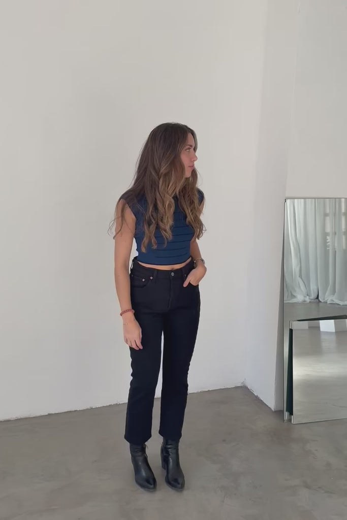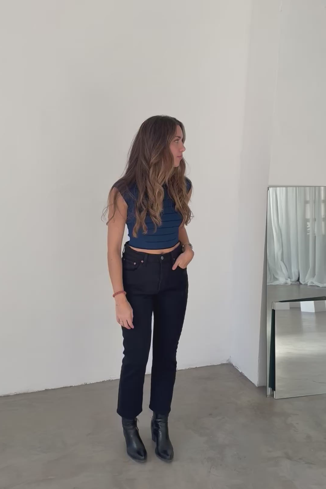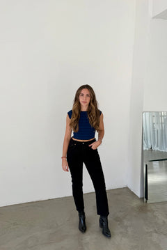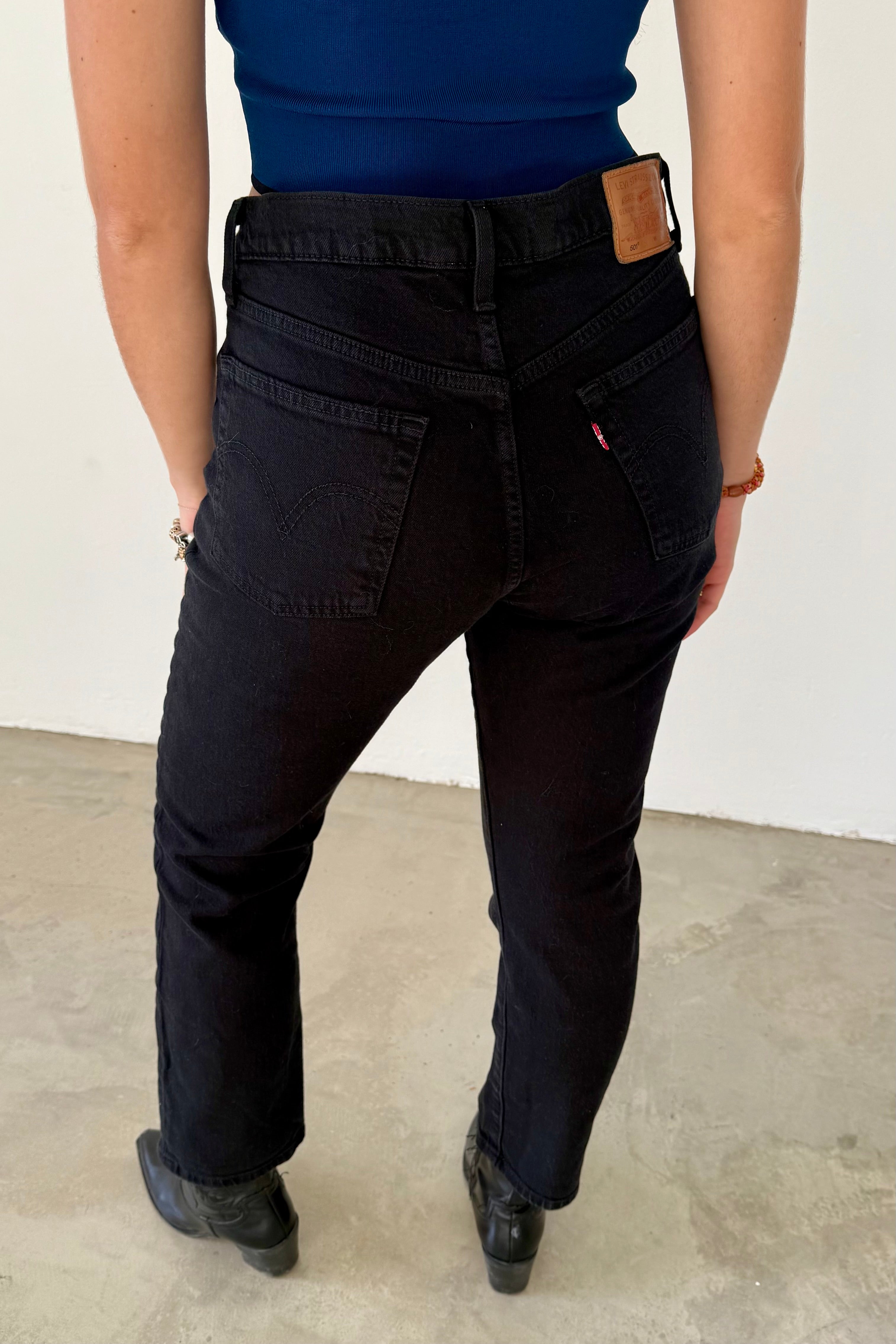 Black straight-leg denim jeans with a classic fit. Features a front button closure with a button fly, traditional five-pocket styling, and metal rivet detailing. Crafted from mid-weight rigid denim.