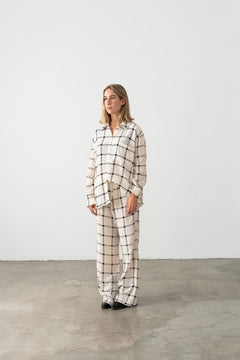 Straight-leg trousers crafted from a fluid fabric featuring a black check pattern on an off-white base. Designed with a fully elasticated waistband and a soft drape that falls to the ankle.
