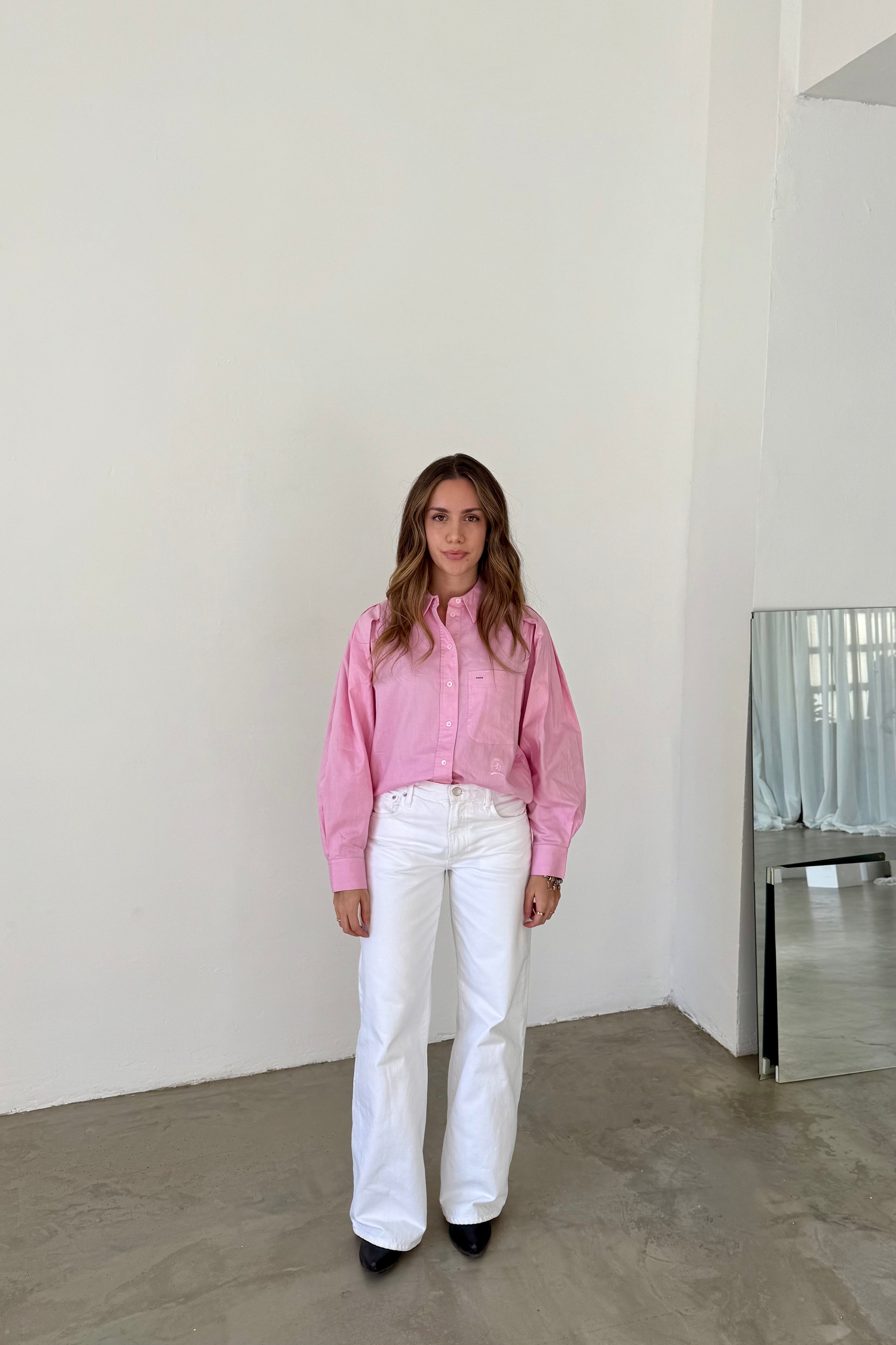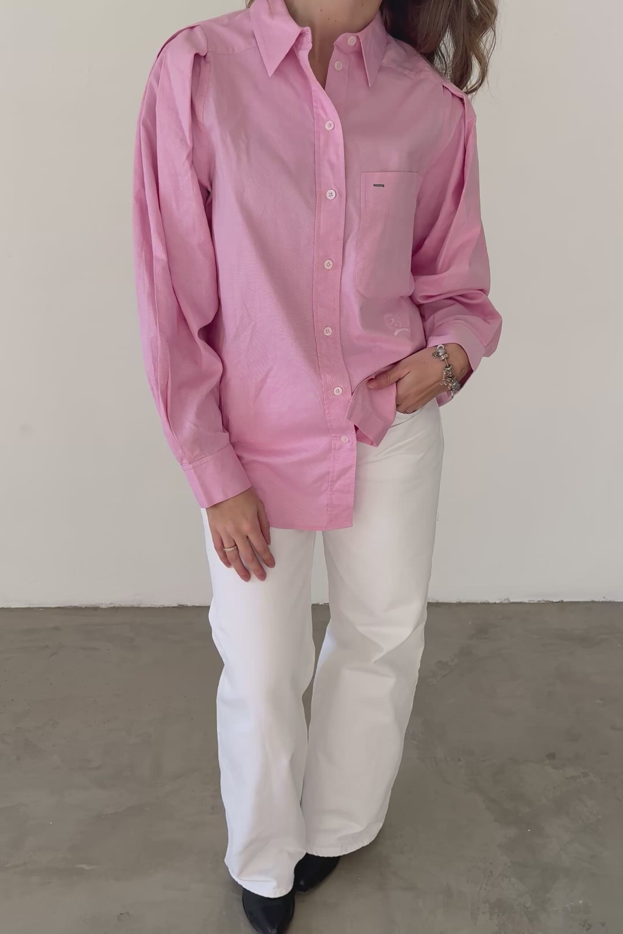 Pink cotton shirt with long sleeves and softly gathered shoulders that create a subtle lantern-style volume at the top. Straight cut with buttoned cuffs.