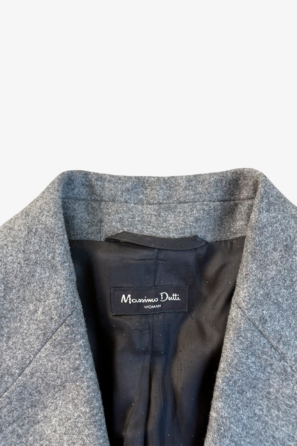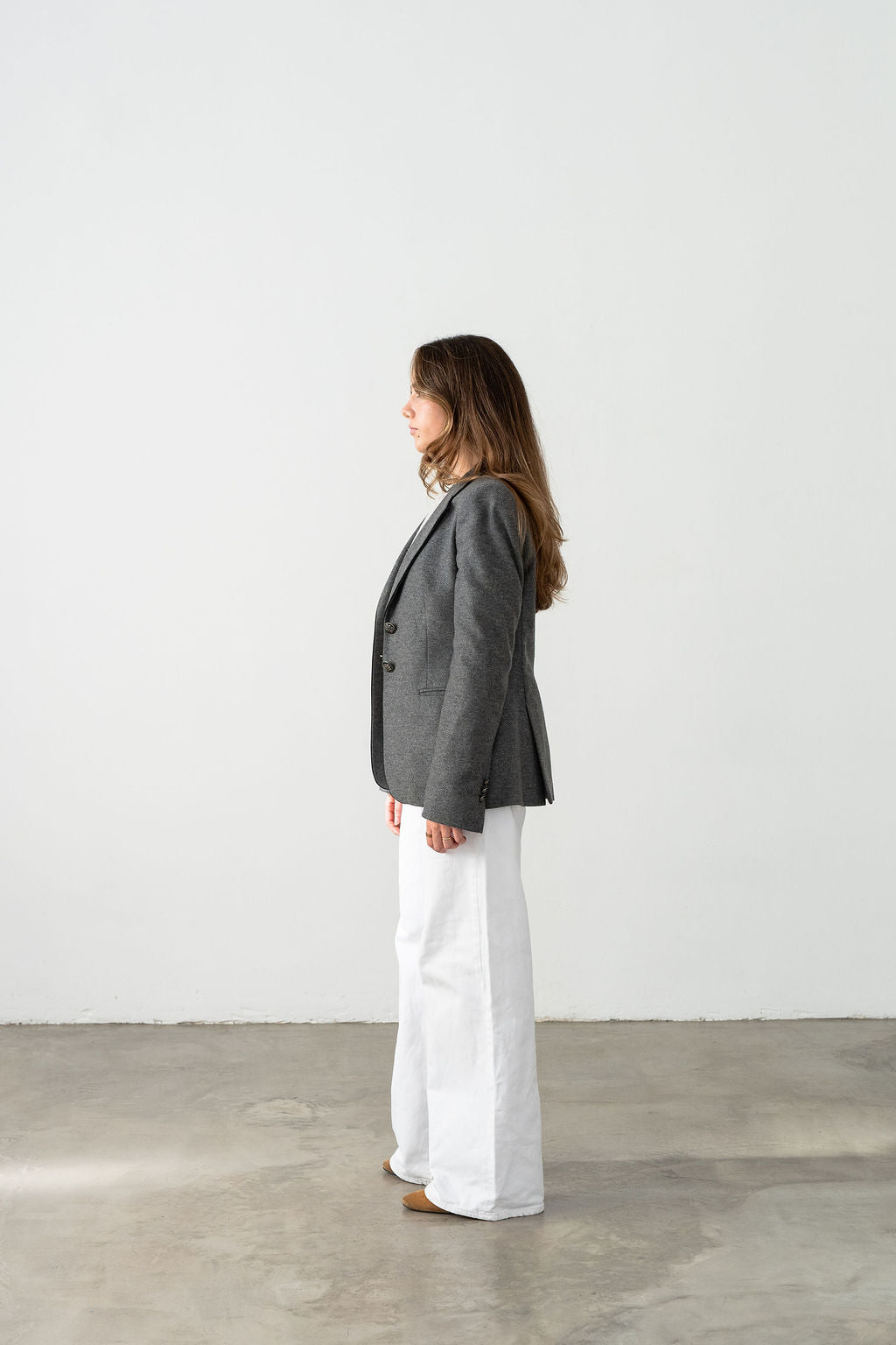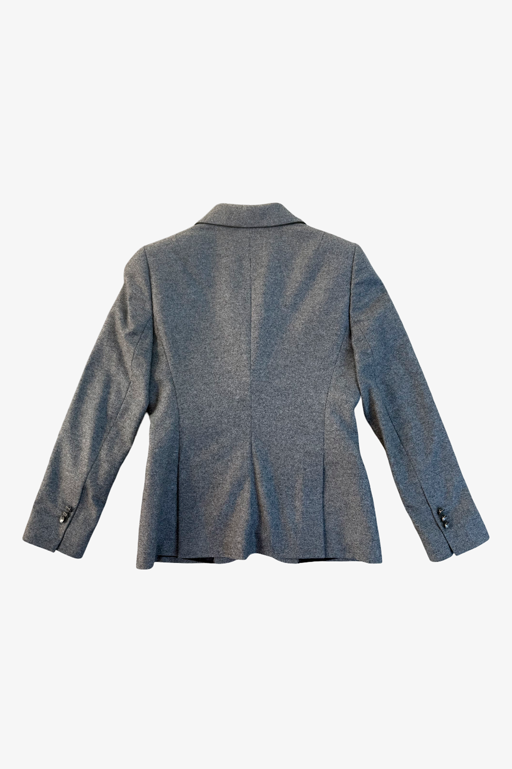 Grey blazer with classic lapel collar and two-button front closure. Flap pockets and tailored fit. Fully lined.