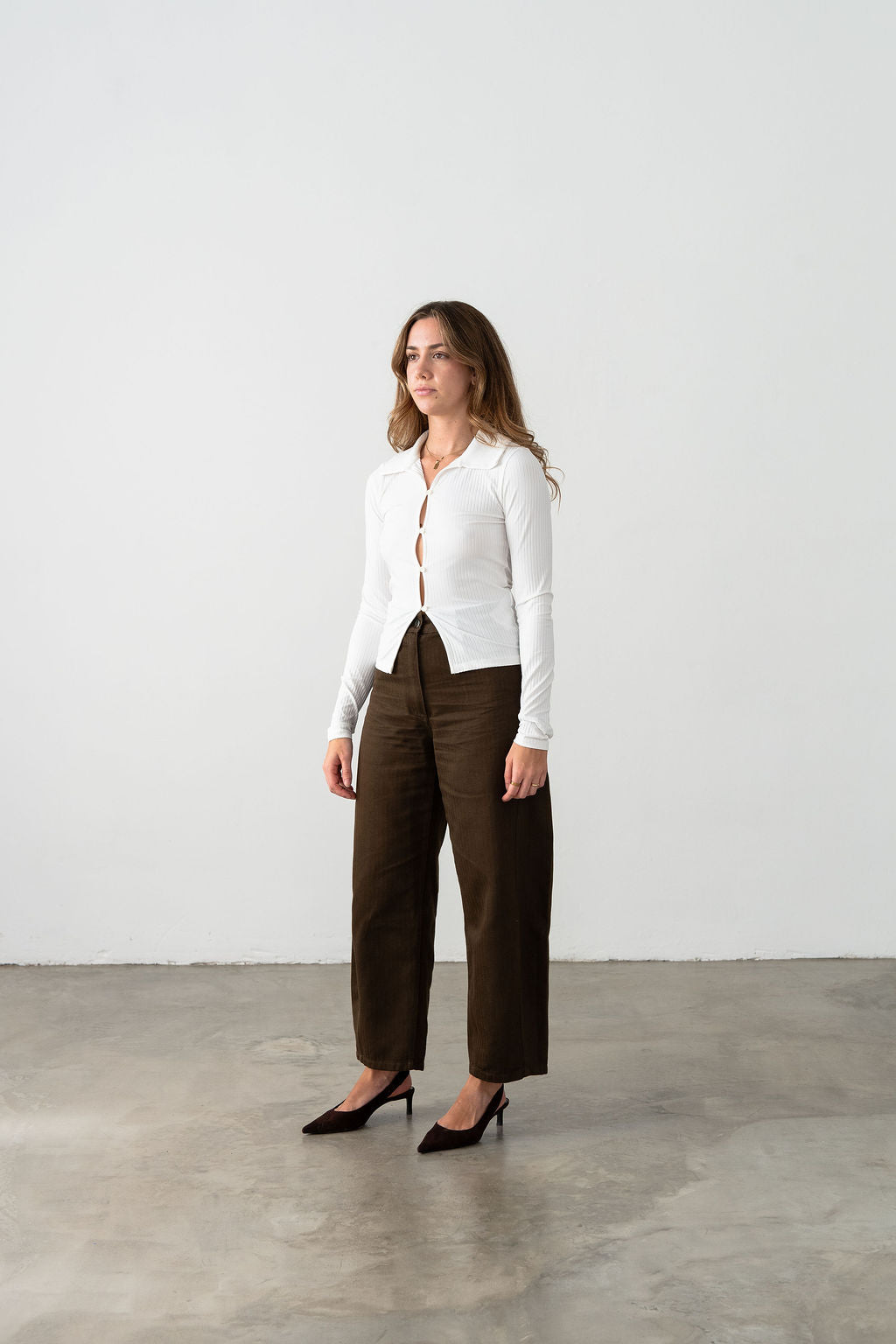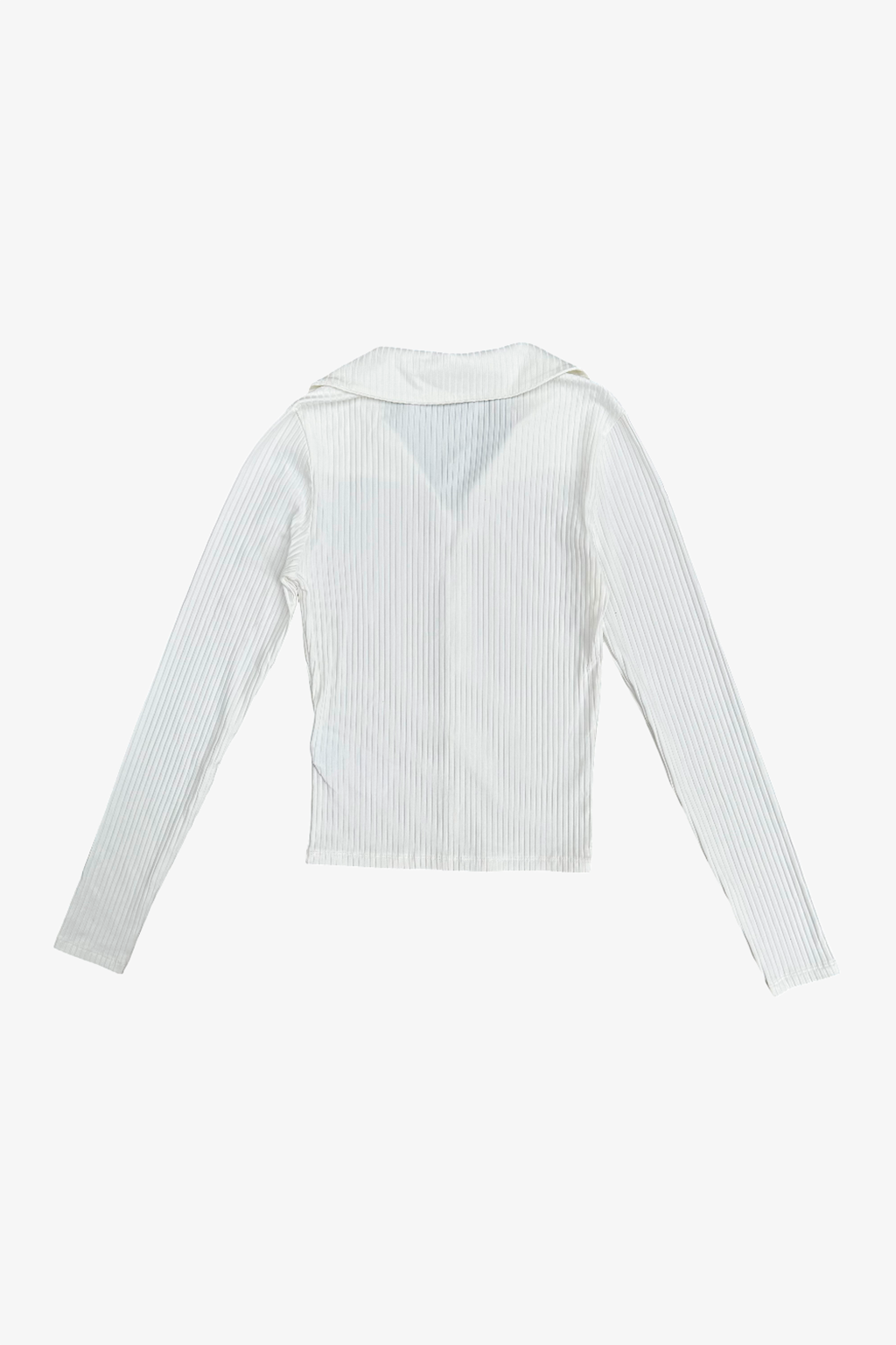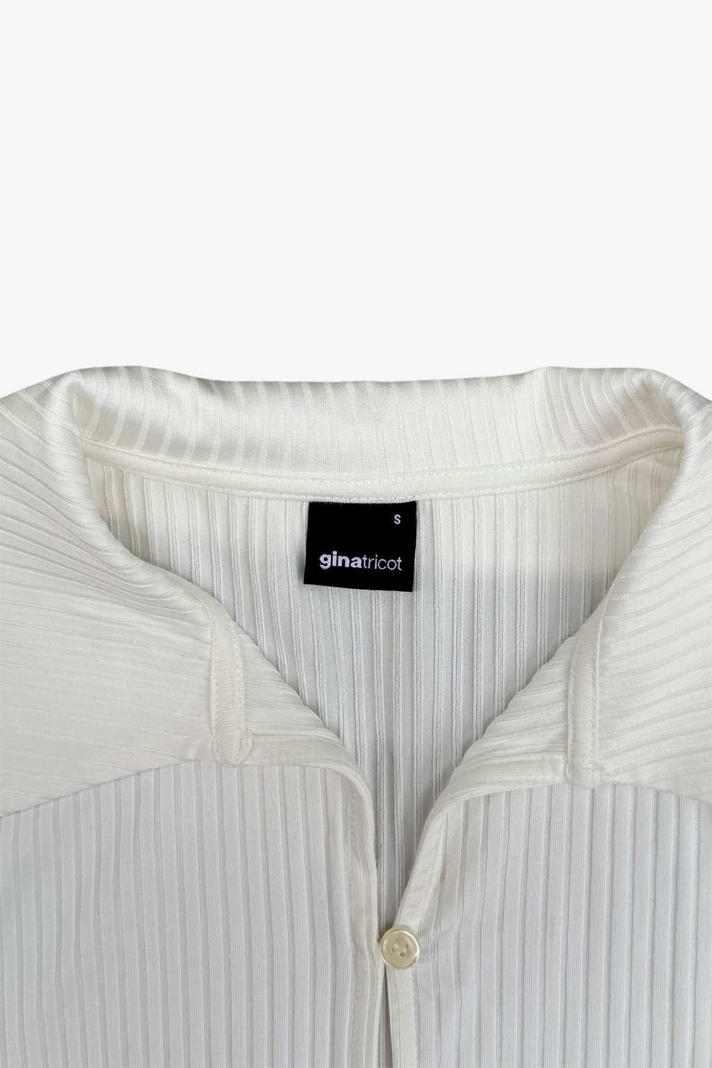 White ribbed knit shirt with a wide collar and button-front closure. The fitted cut flatters the figure, and the stretchy fabric provides comfort and freedom of movement. Perfect for pairing with jeans or skirts for a clean, contemporary look.
