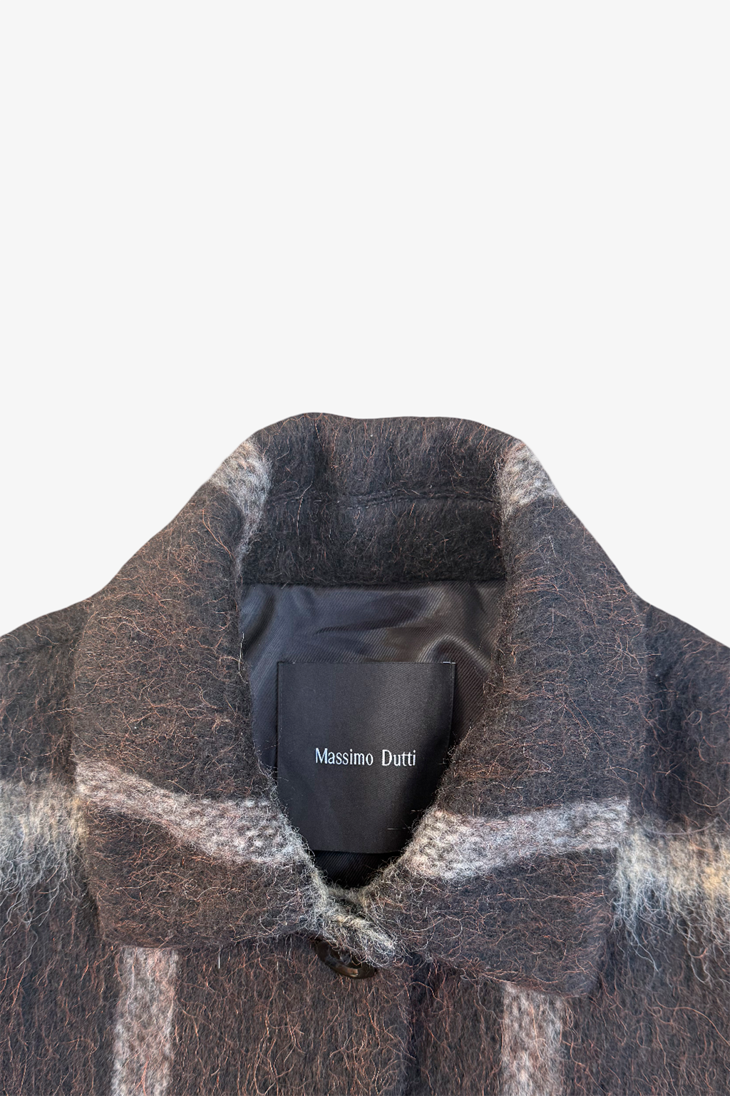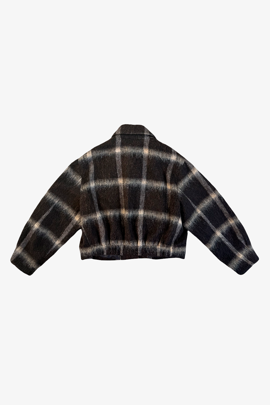 Short jacket crafted from a brushed wool blend. Structured design with a checkered pattern in shades of brown, gray, and beige. It features a classic lapel collar, a button-front closure, long straight sleeves, and discreet side pockets. The hem is straight.