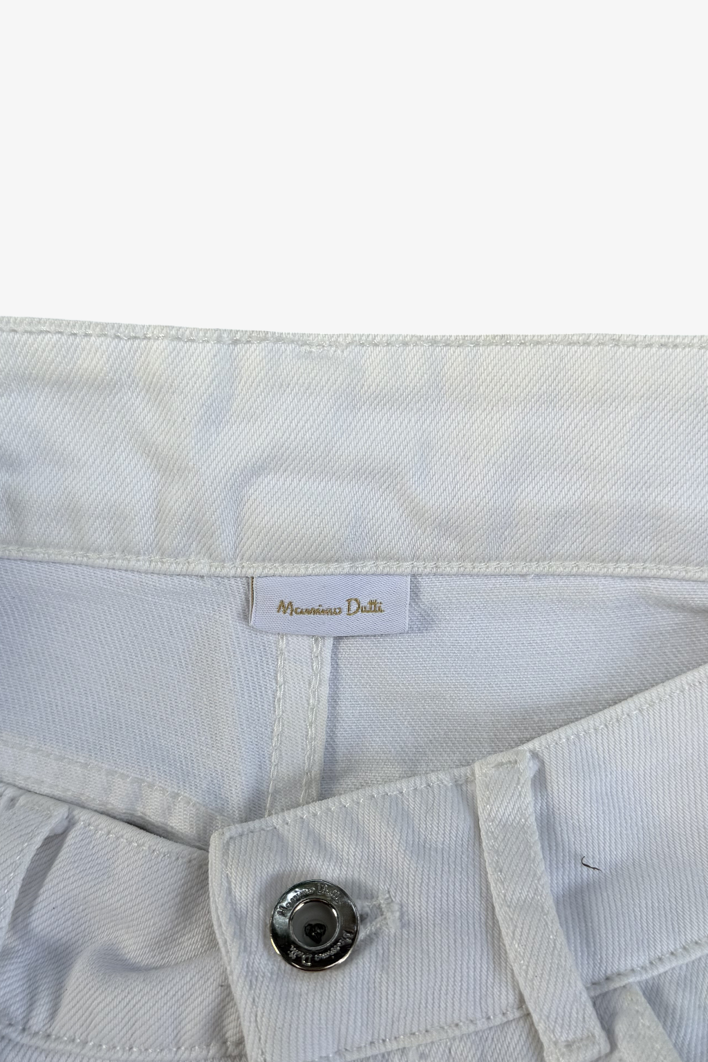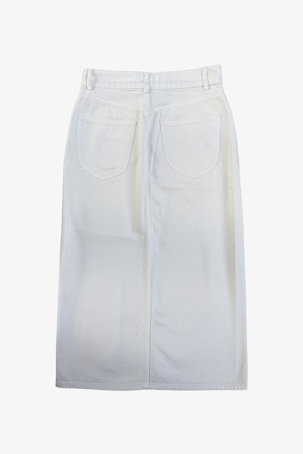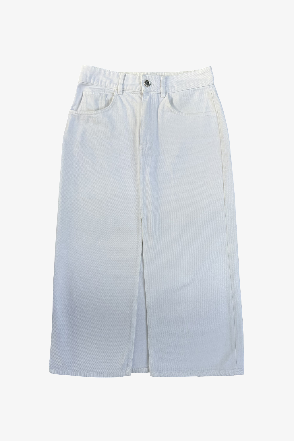 White denim midi skirt with a center front slit. High waist, zip and metal button fastening. Straight cut with a slightly flared hem and unlined.
