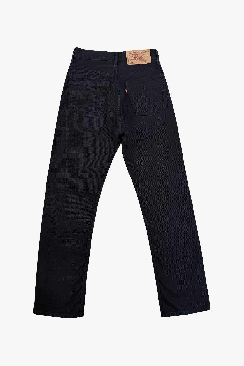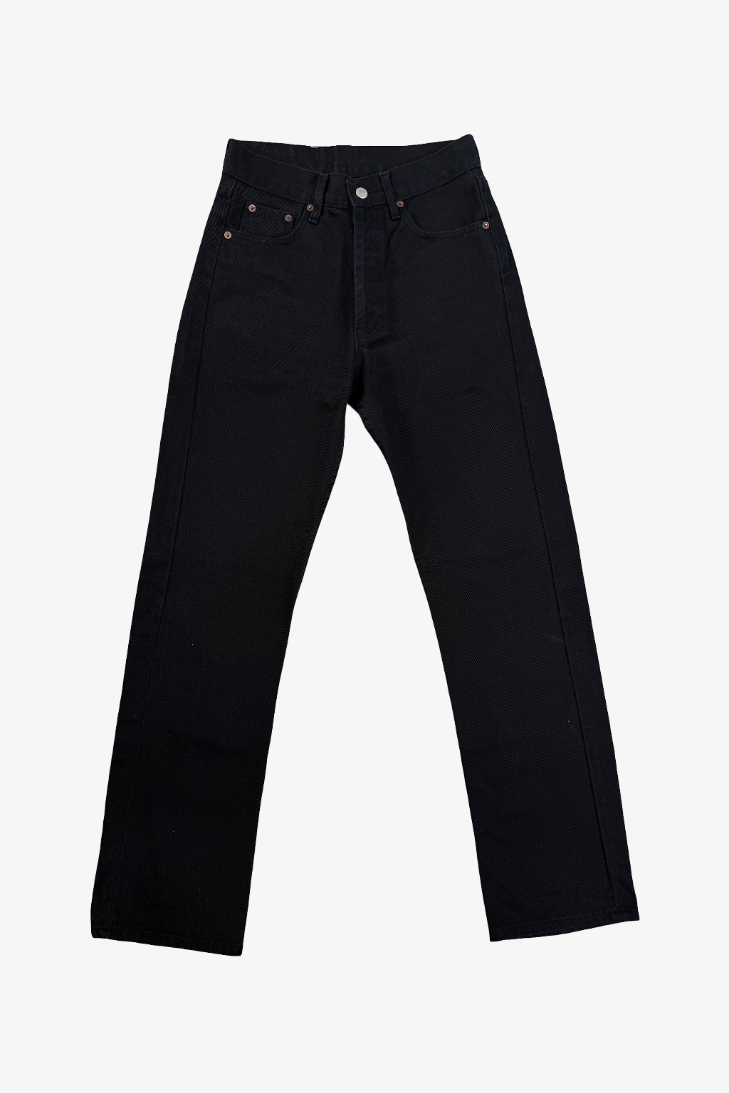 Long black jeans with a straight cut and high waist. Features a metal button and zip fastening, five pockets, and denim fabric.
