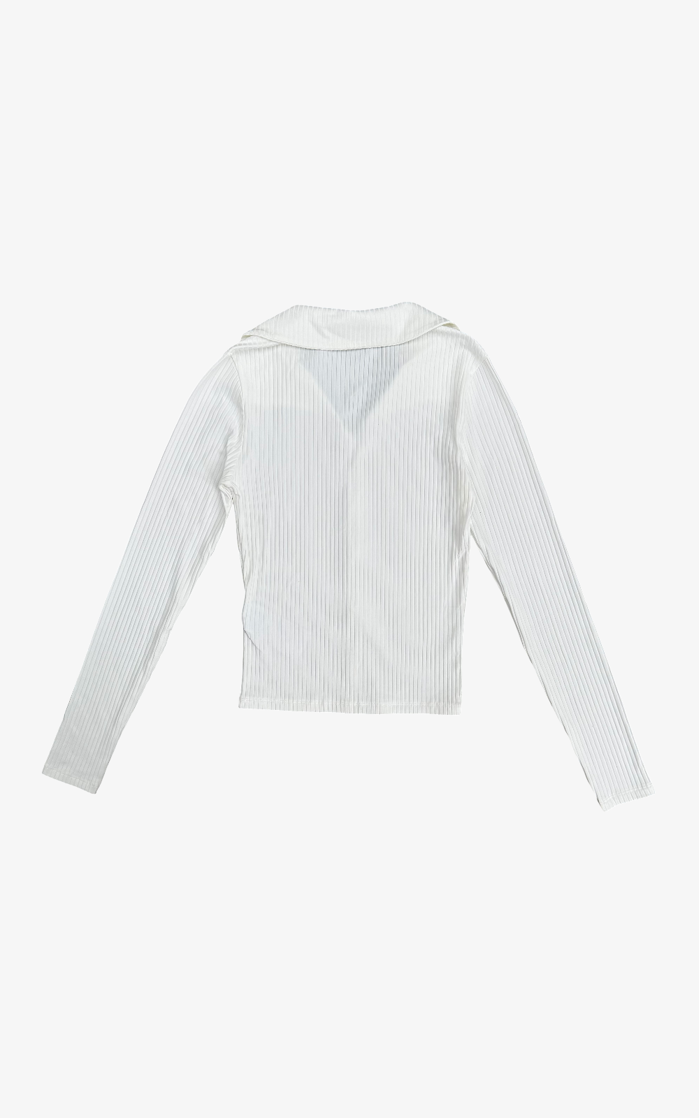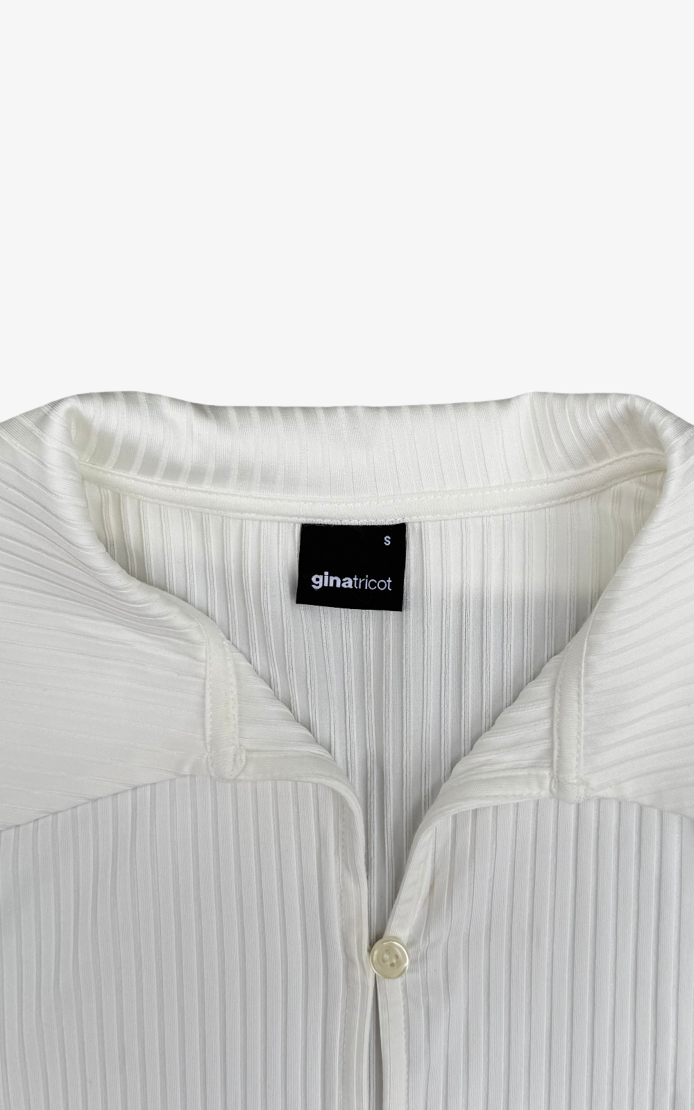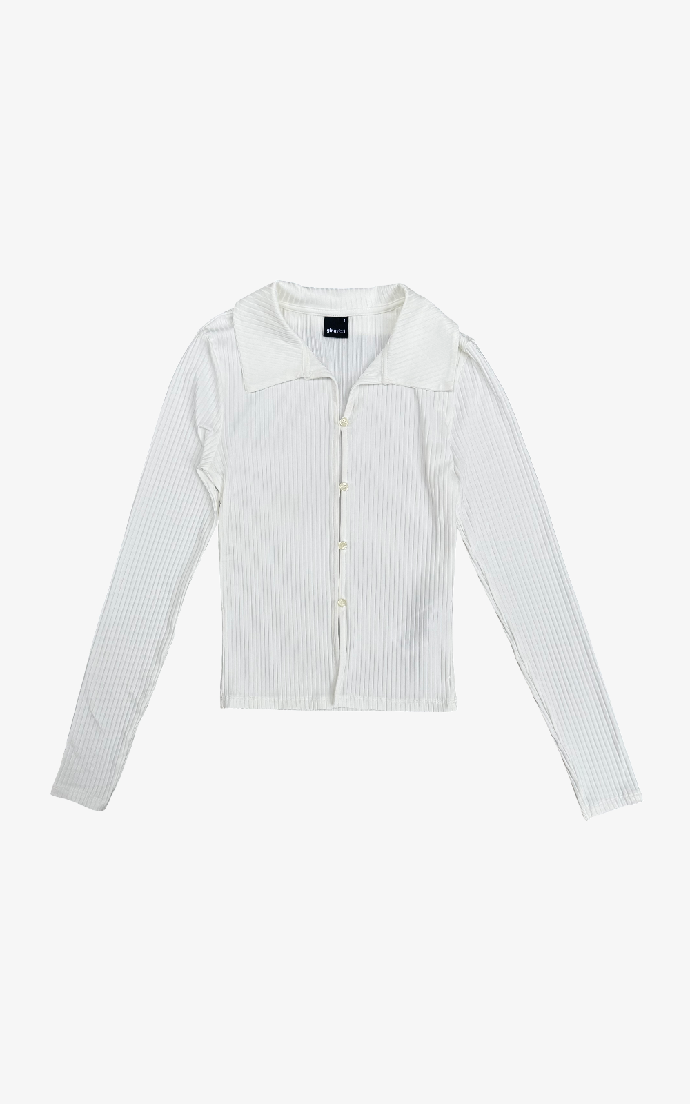 Camisa de punto acanalado en color blanco con cuello amplio y cierre de botones frontales. Corte ajustado que realza la silueta y tejido elástico que aporta comodidad y libertad de movimiento. Perfecta para combinar con jeans o faldas y lograr un look limpio y contemporáneo.
