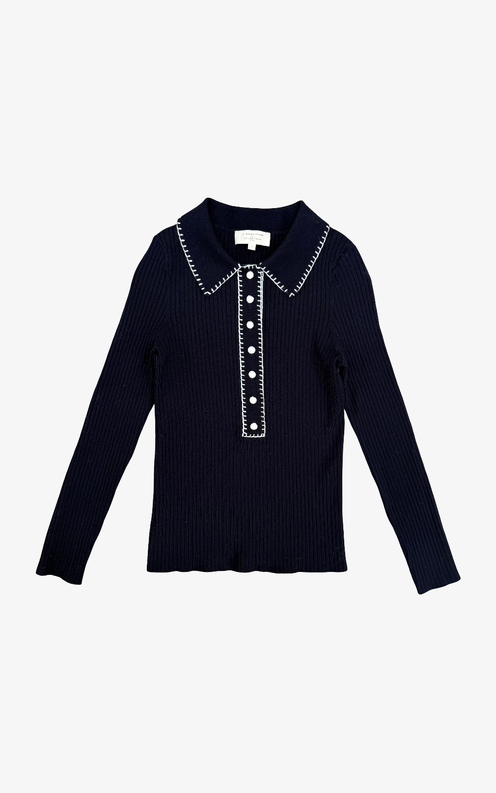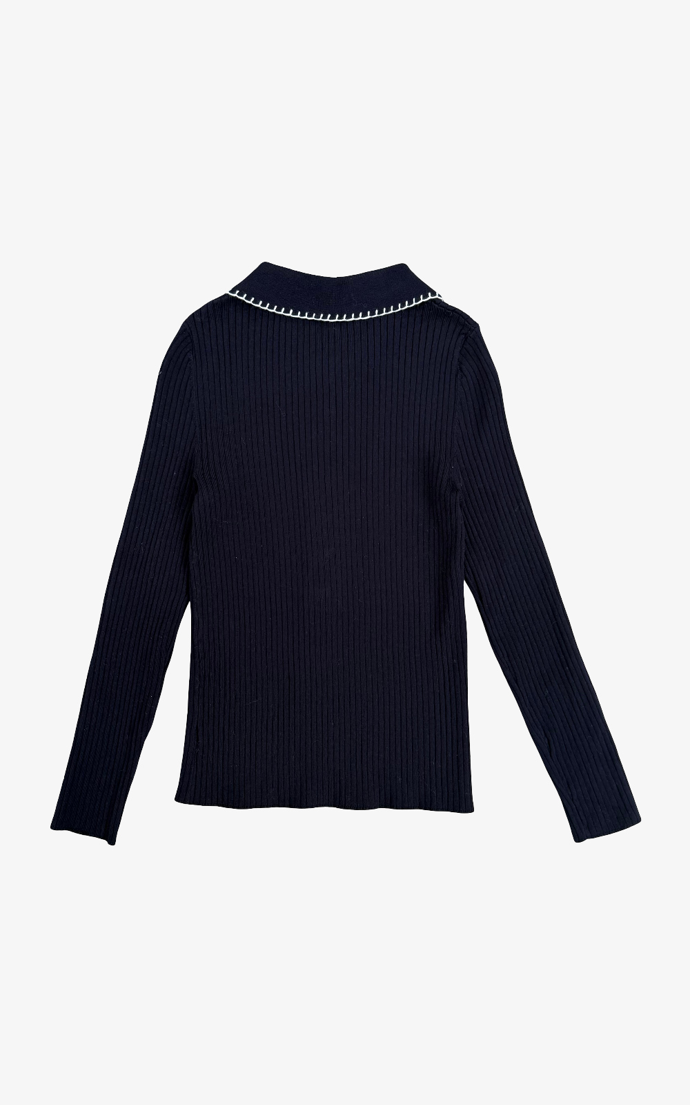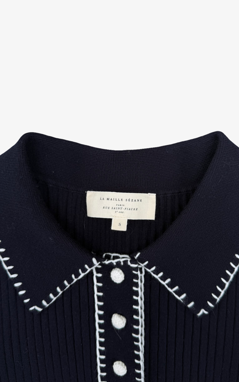 Jersey de punto fino negro con cuello camisero y tapeta de botones decorada con bordado en contraste blanco. Corte ajustado y manga larga. Una prenda elegante con un toque artesanal que eleva cualquier conjunto básico.