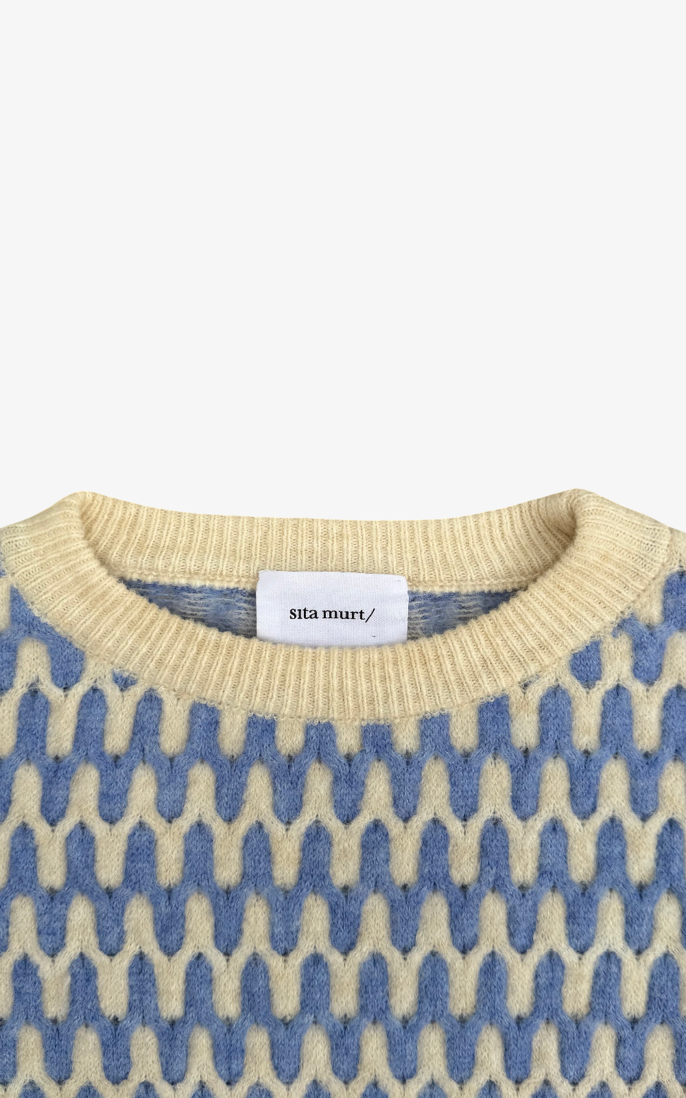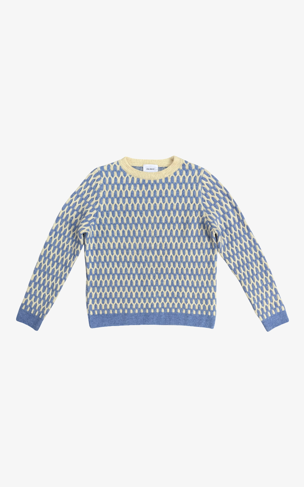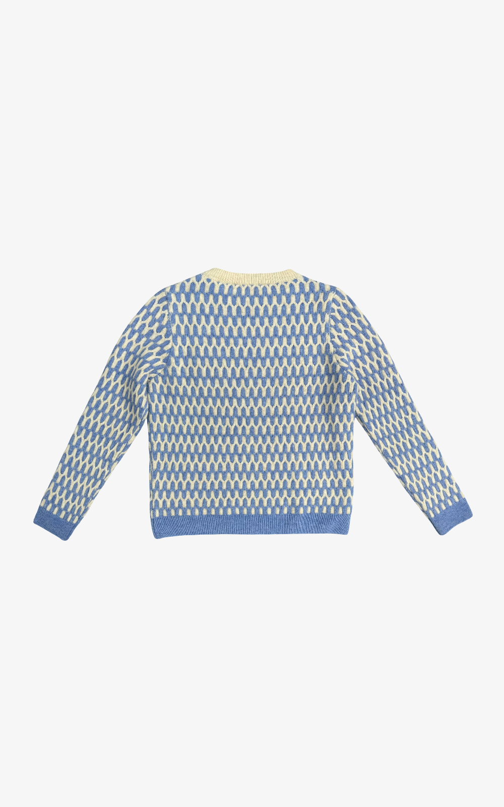 Jersey de punto en mezcla de tonos azul cielo y crudo, con diseño geométrico en relieve. Corte recto, cuello redondo y acabados en canalé. Tejido suave y cálido.
