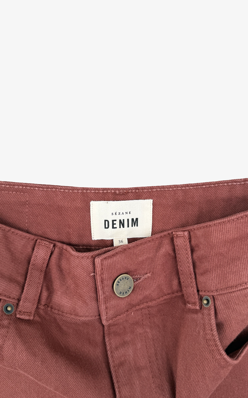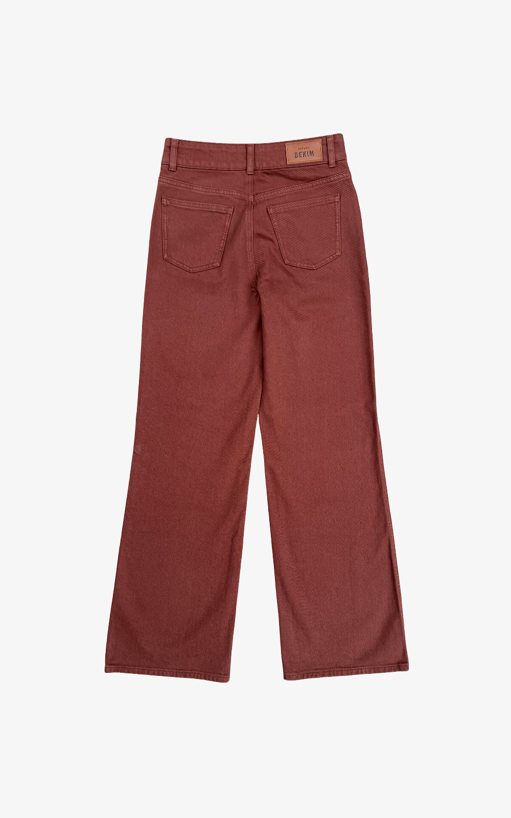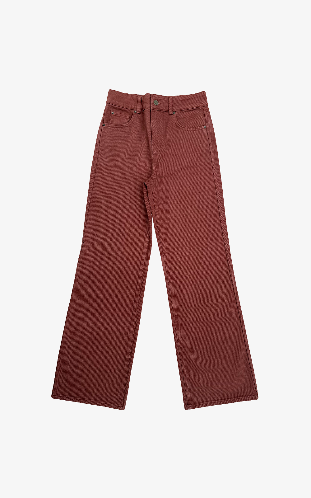 Pantalón denim en tono teja con corte recto y talle alto. Diseño clásico con cinco bolsillos y cierre de botón y cremallera.