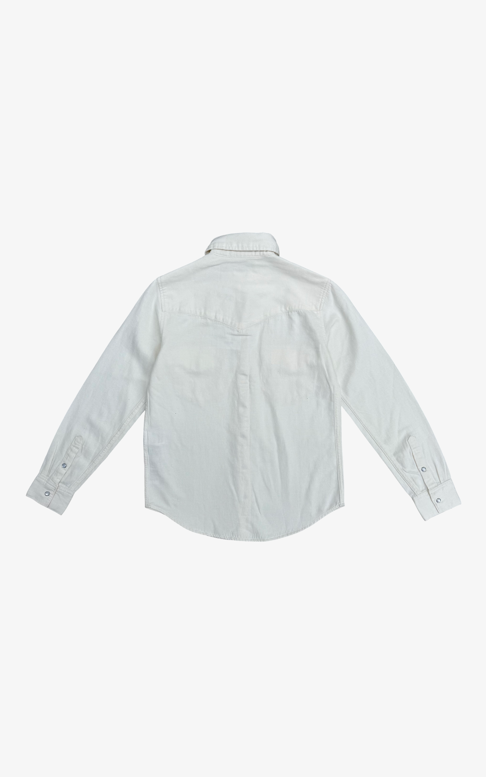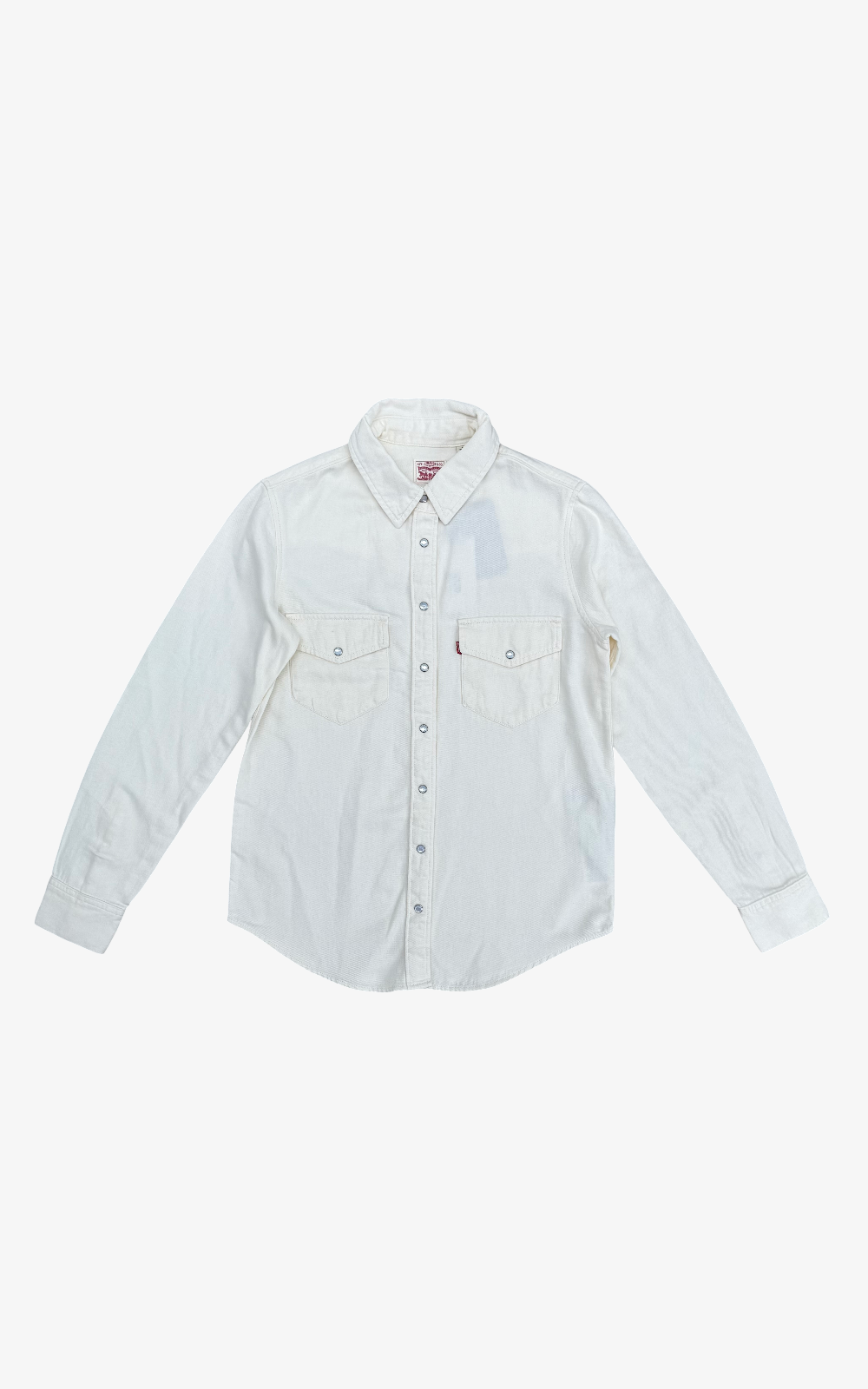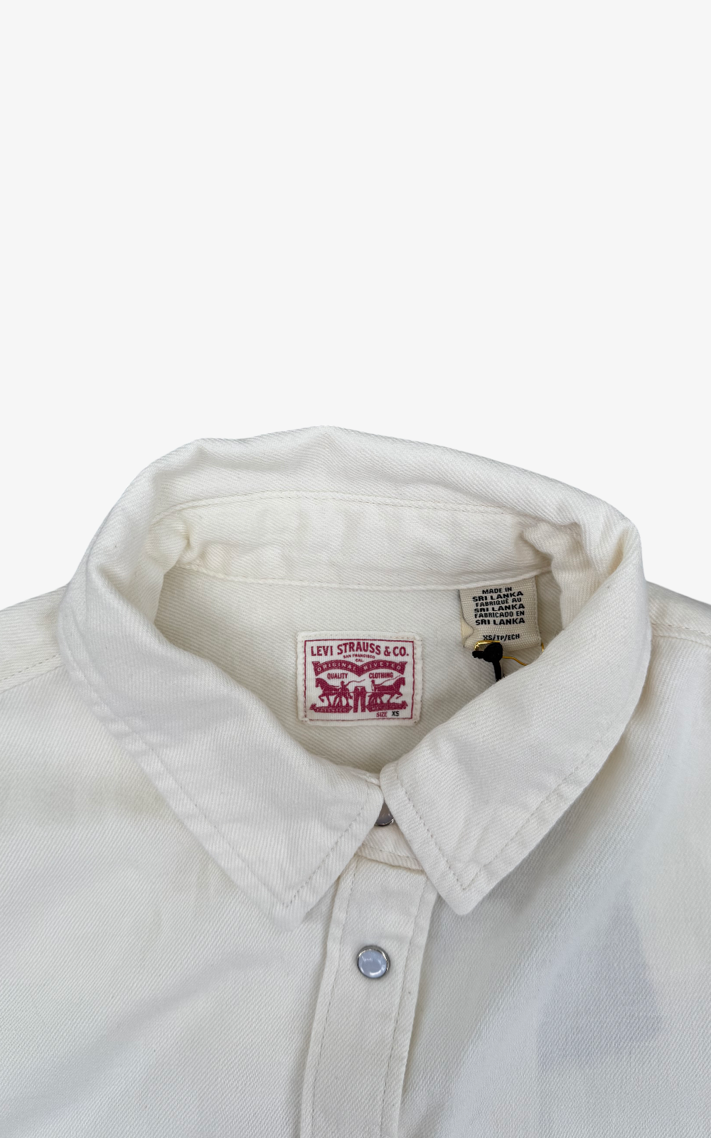 Camisa Levi’s de manga larga en tejido denim blanco crudo. Diseño clásico con bolsillos delanteros con solapa y botón a presión metálico. Corte recto con acabado ligeramente redondeado en el bajo. Ideal para llevar abierta o cerrada.