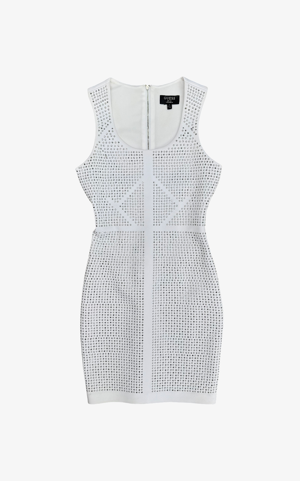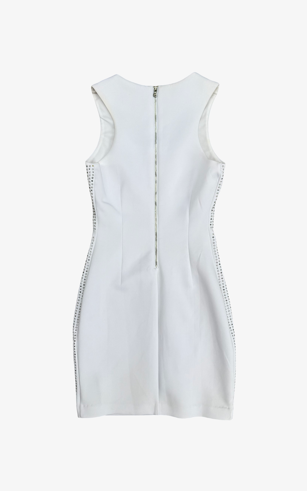 Vestido corto Guess en color blanco, corte entallado tipo bodycon. Diseño sin mangas, con escote redondo y aplicaciones metálicas en relieve que forman un patrón geométrico en todo el frontal. Cierre con cremallera trasera oculta. Tejido de punto elástico que realza la silueta.