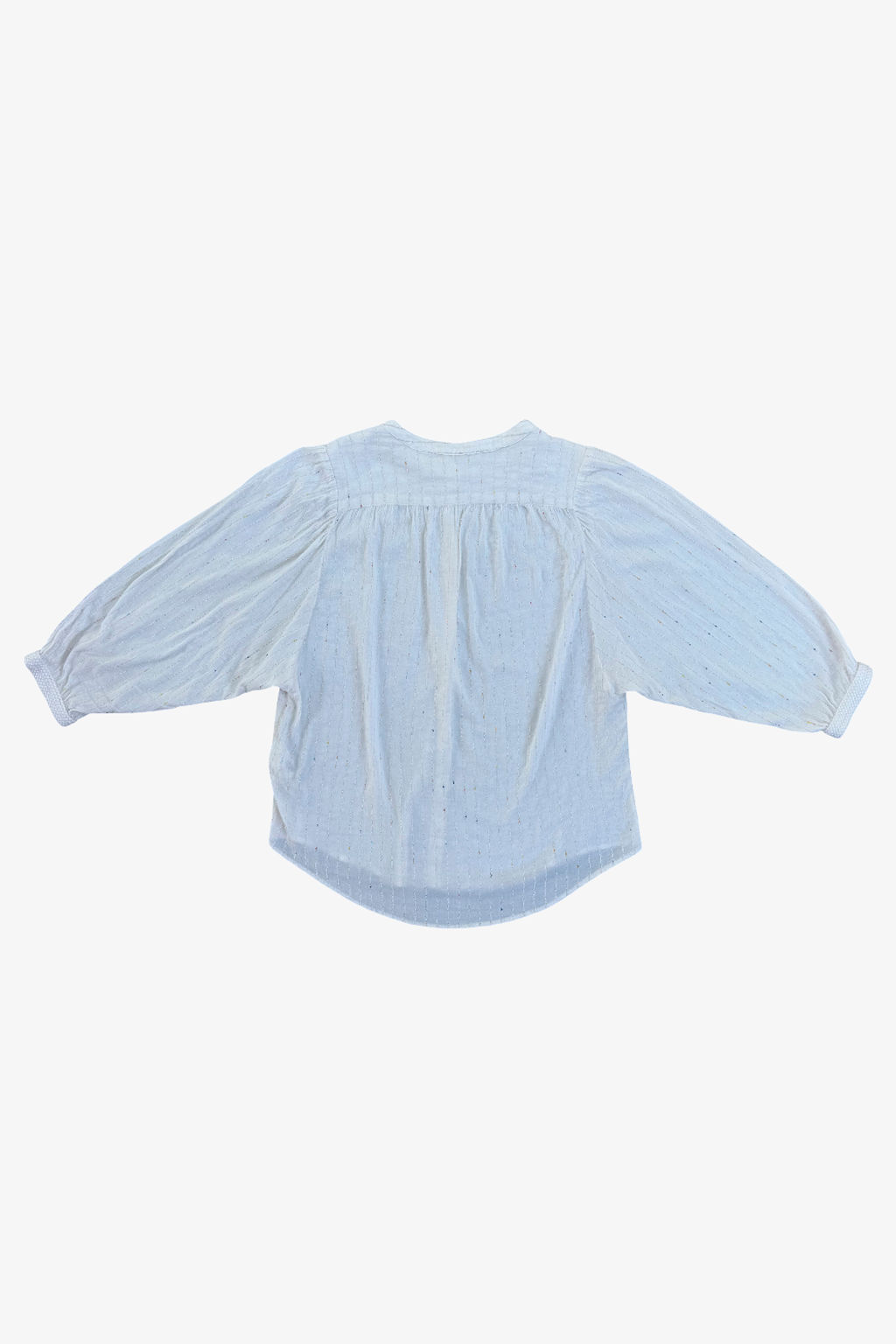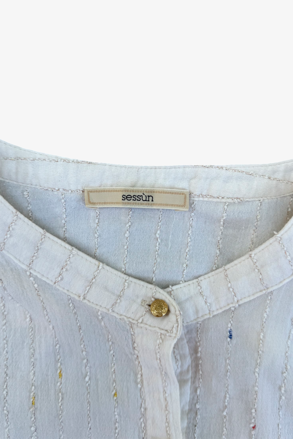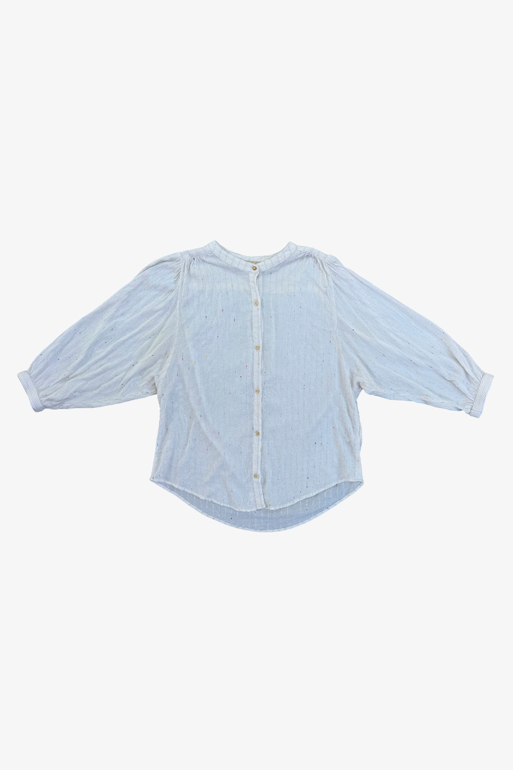 Blouse made of lightweight white fabric with fine multicolored threads that create a mottled effect. It features a simple round neckline, a button-front closure, and three-quarter puffed sleeves with narrow cuffs. A rounded hem with a loose fit. Loose fit.
