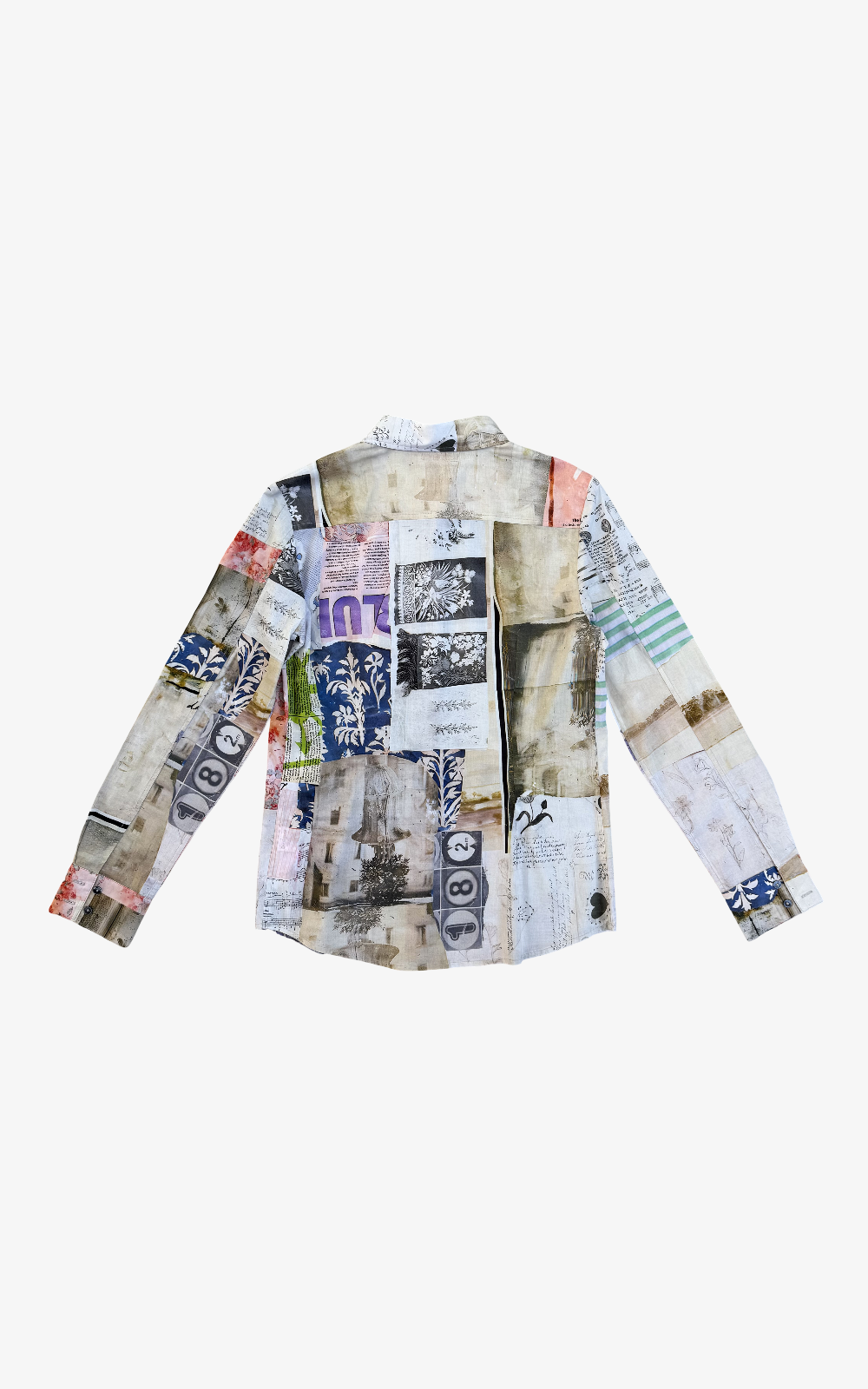 Camisa de manga larga con estampado patchwork de inspiración artística en tonos tierra, rosados y azulados. Cuello clásico, cierre de botones y diseño único con mezcla de texturas y motivos. Perfecta para quienes buscan un estilo creativo y distintivo.