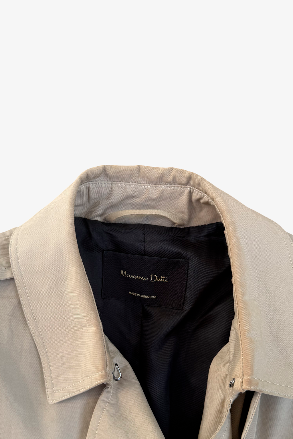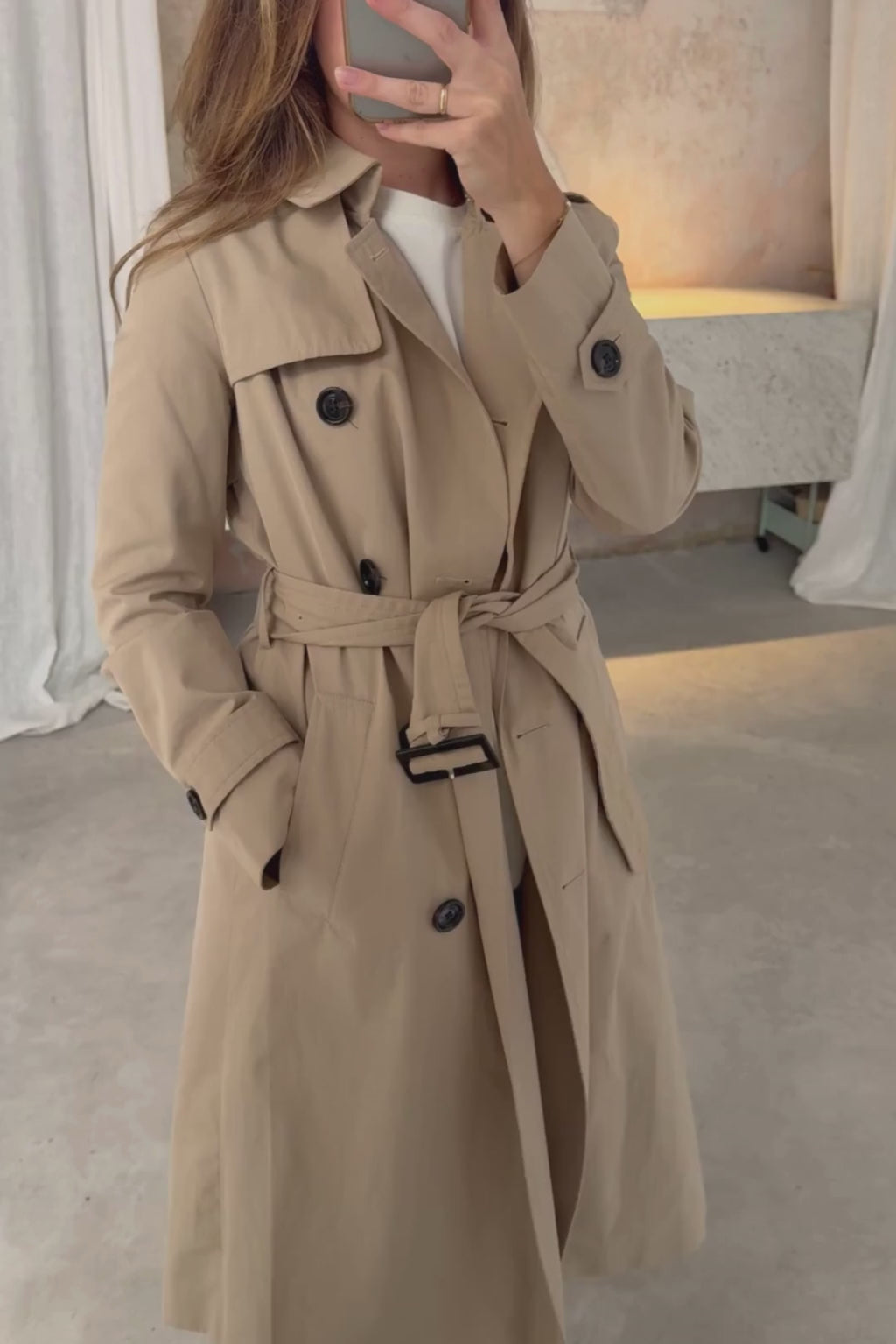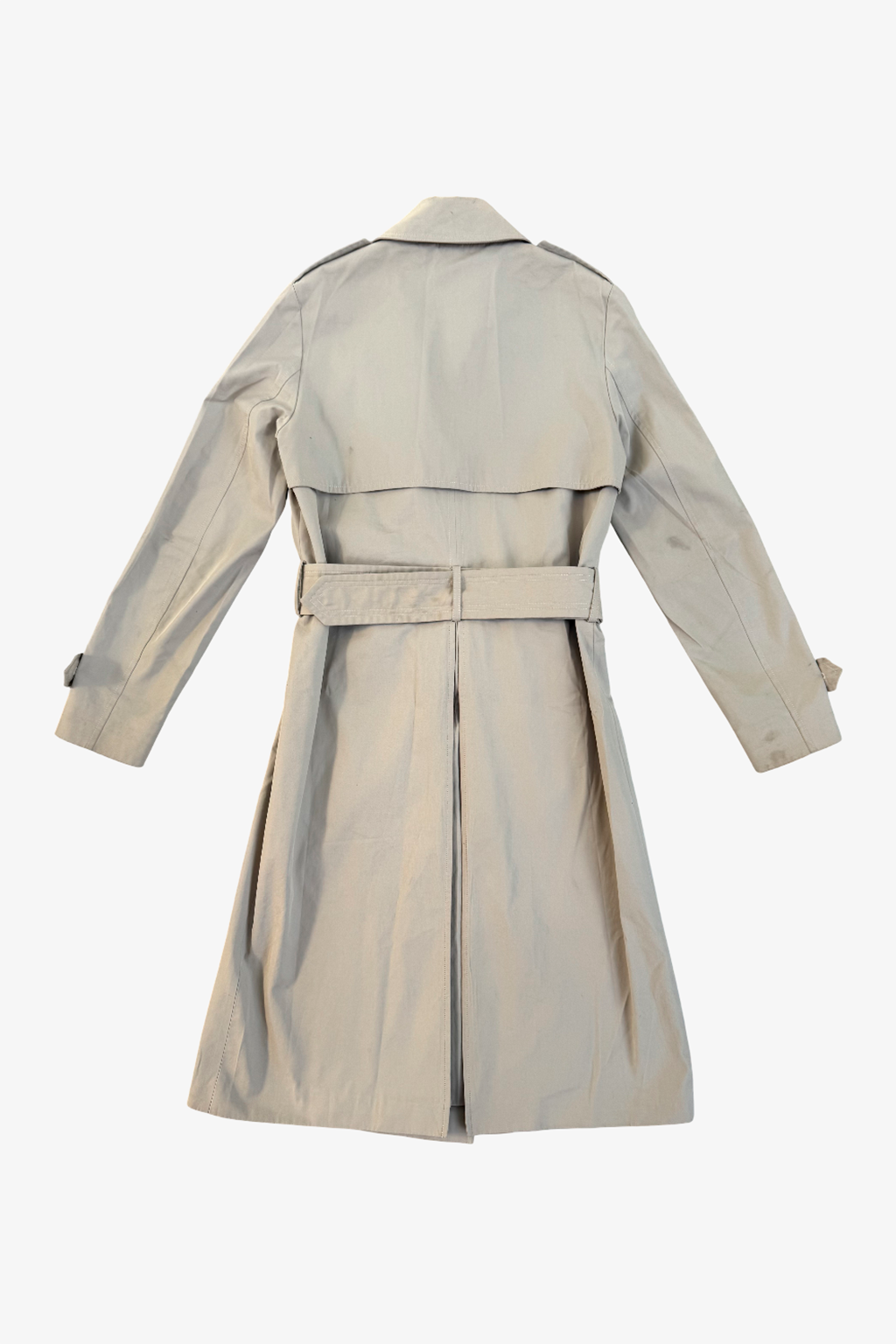 Classic double-breasted trench coat in beige with an adjustable waist belt. Features include plackets at the chest and shoulders, side pockets, and tabbed cuffs. Length falls below the knee.