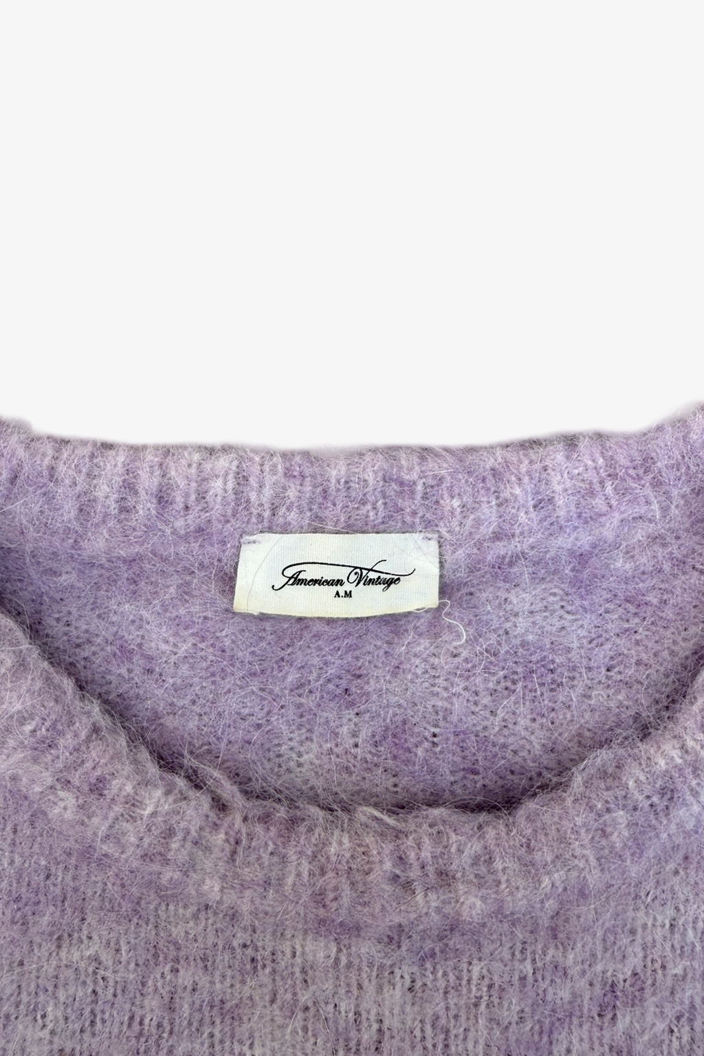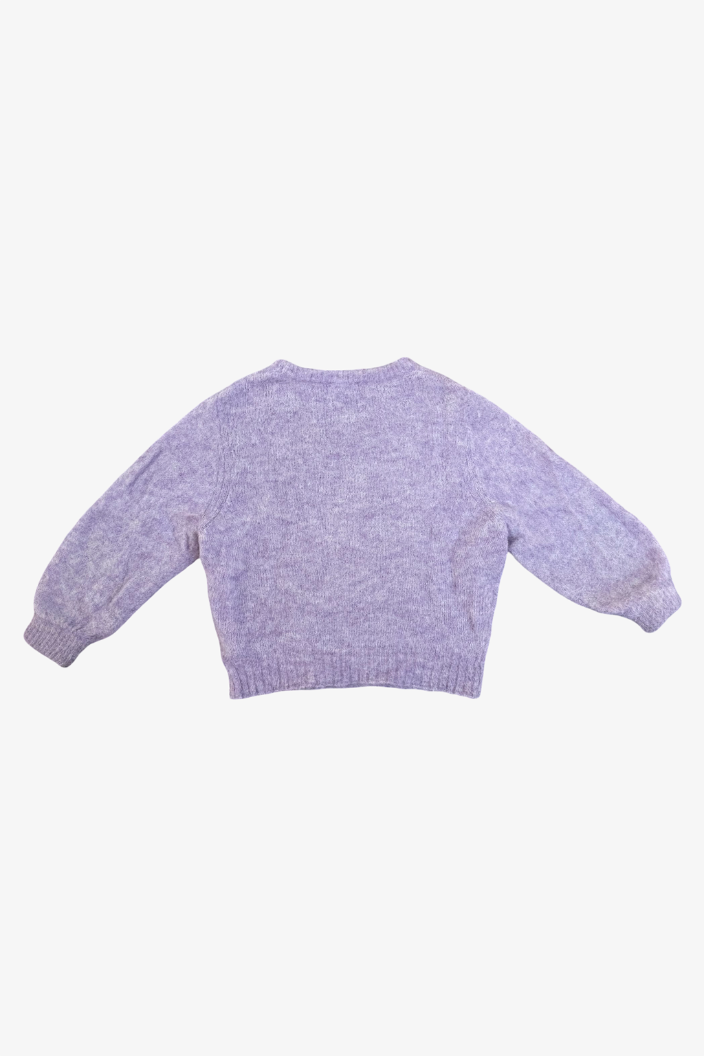 Lilac knit sweater. Made from a wool blend with a soft, lightweight texture. It features a round neckline, long sleeves with elastic cuffs, and a straight hem with a simple trim. It features a straight cut and a relaxed silhouette.