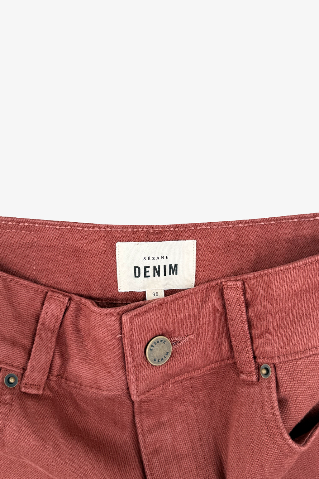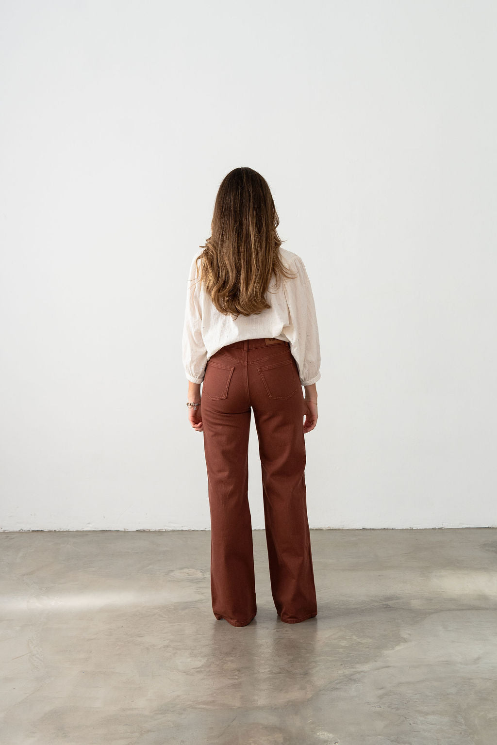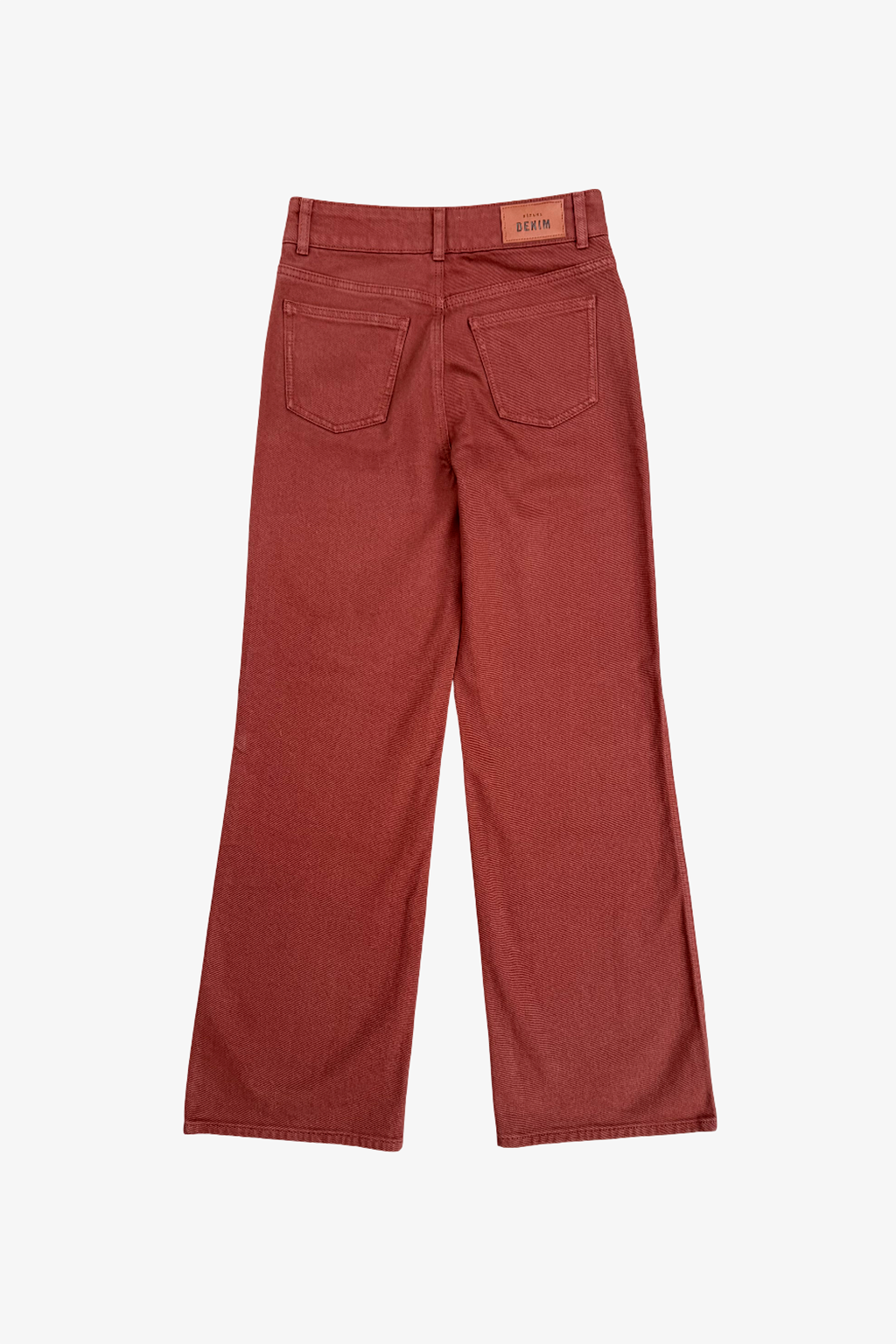Denim trousers in a terracotta tone with a straight cut and high waist. Classic design with five pockets and button and zip fastening.