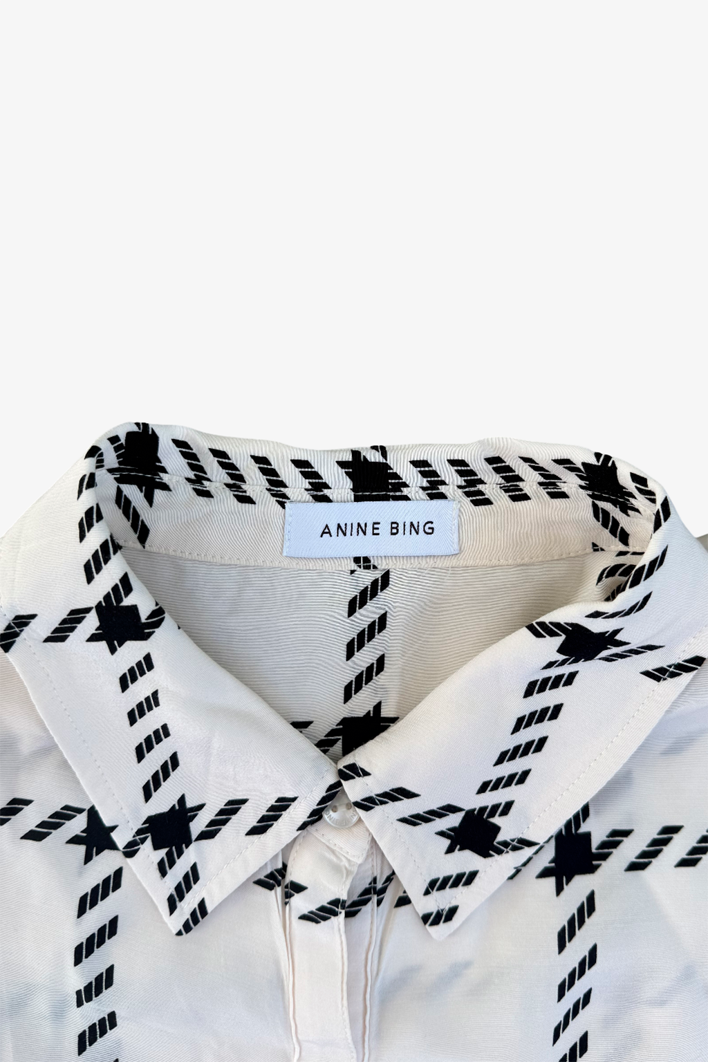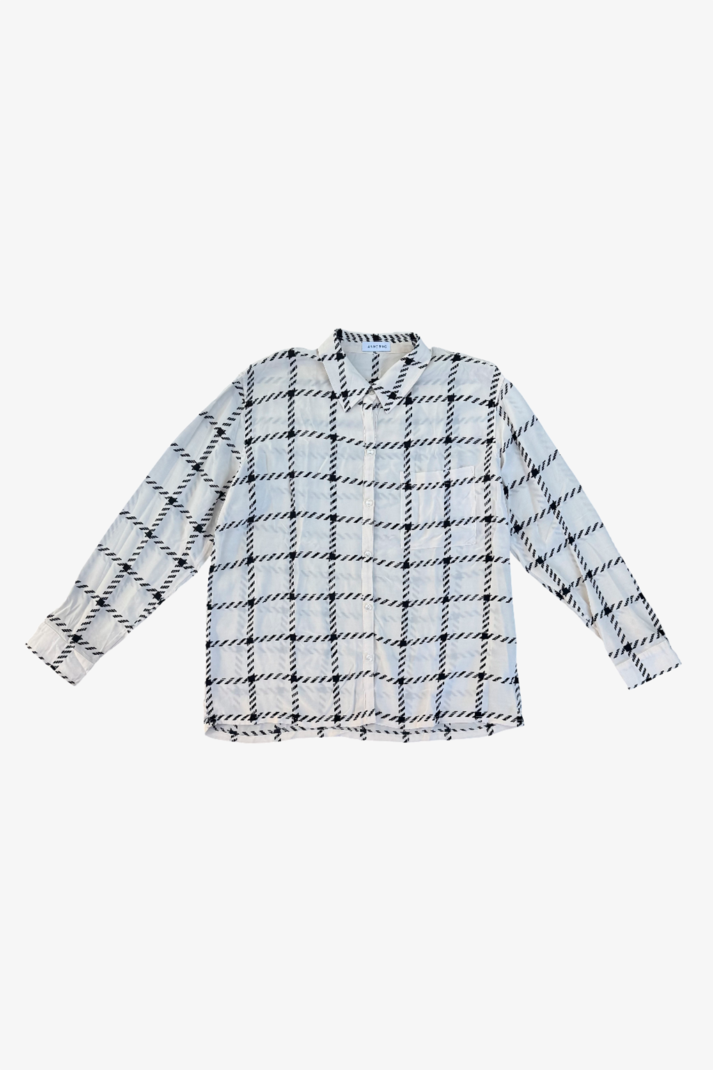 Long-sleeved shirt in a lightweight, off-white fabric with a black check pattern. Straight cut, classic collar, and button-front closure. Buttoned cuffs.