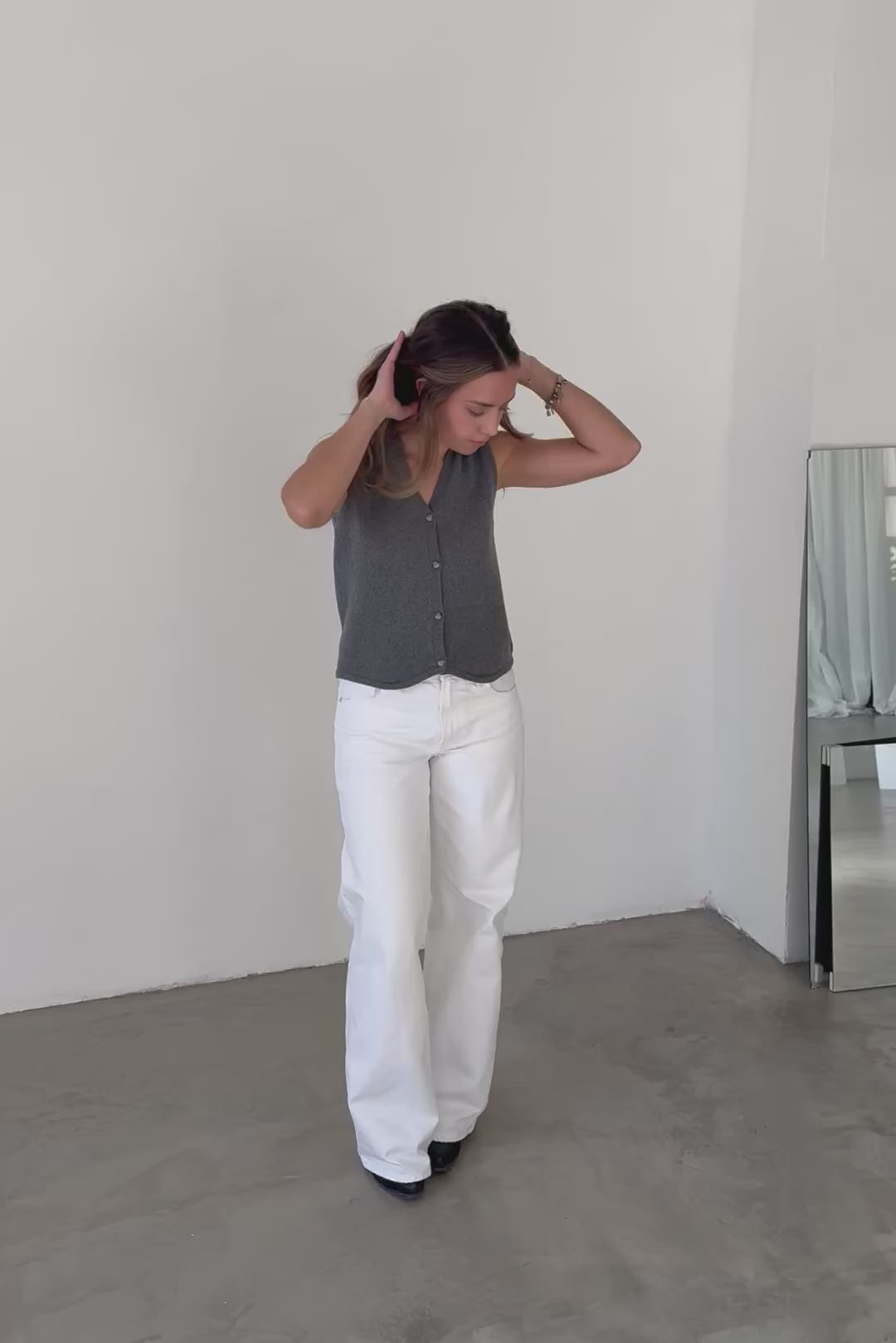 Chaleco de punto fino con botonadura frontal completa. Escote en V y sisas amplias. Tejido suave en color gris vigoré. Bajo recto sin canalé pronunciado. Silueta ligeramente holgada.