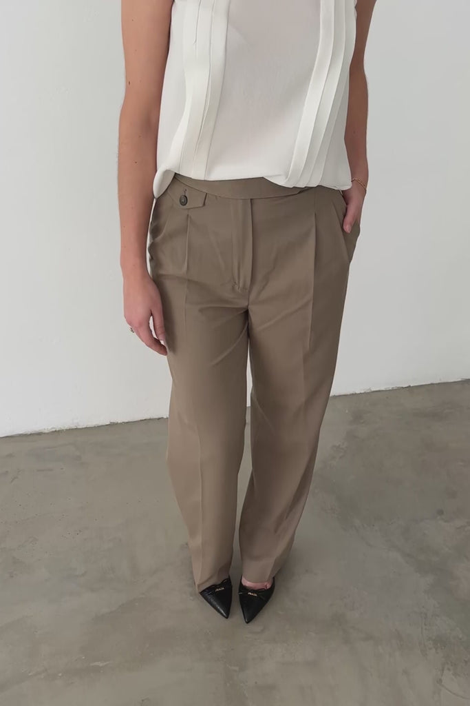 Finished with front pleats, side pockets, and subtle buttoned details at the waistband, they style effortlessly with crisp shirts, blouses, or fine knits for an elevated wardrobe essential.