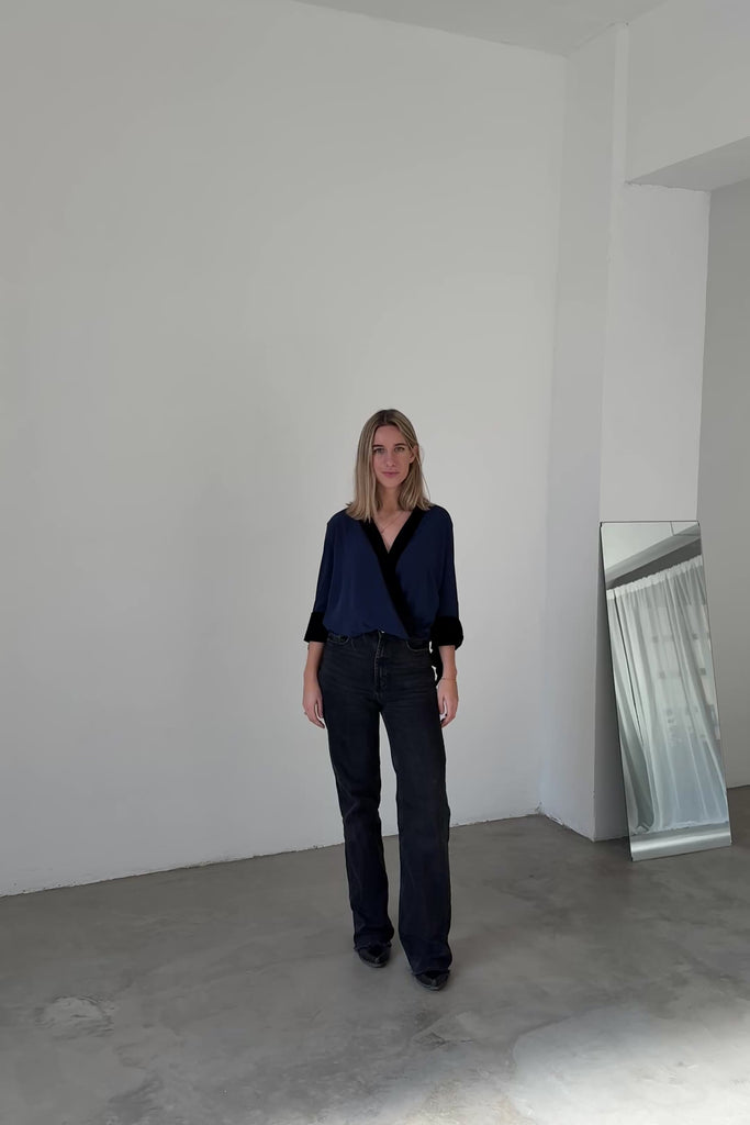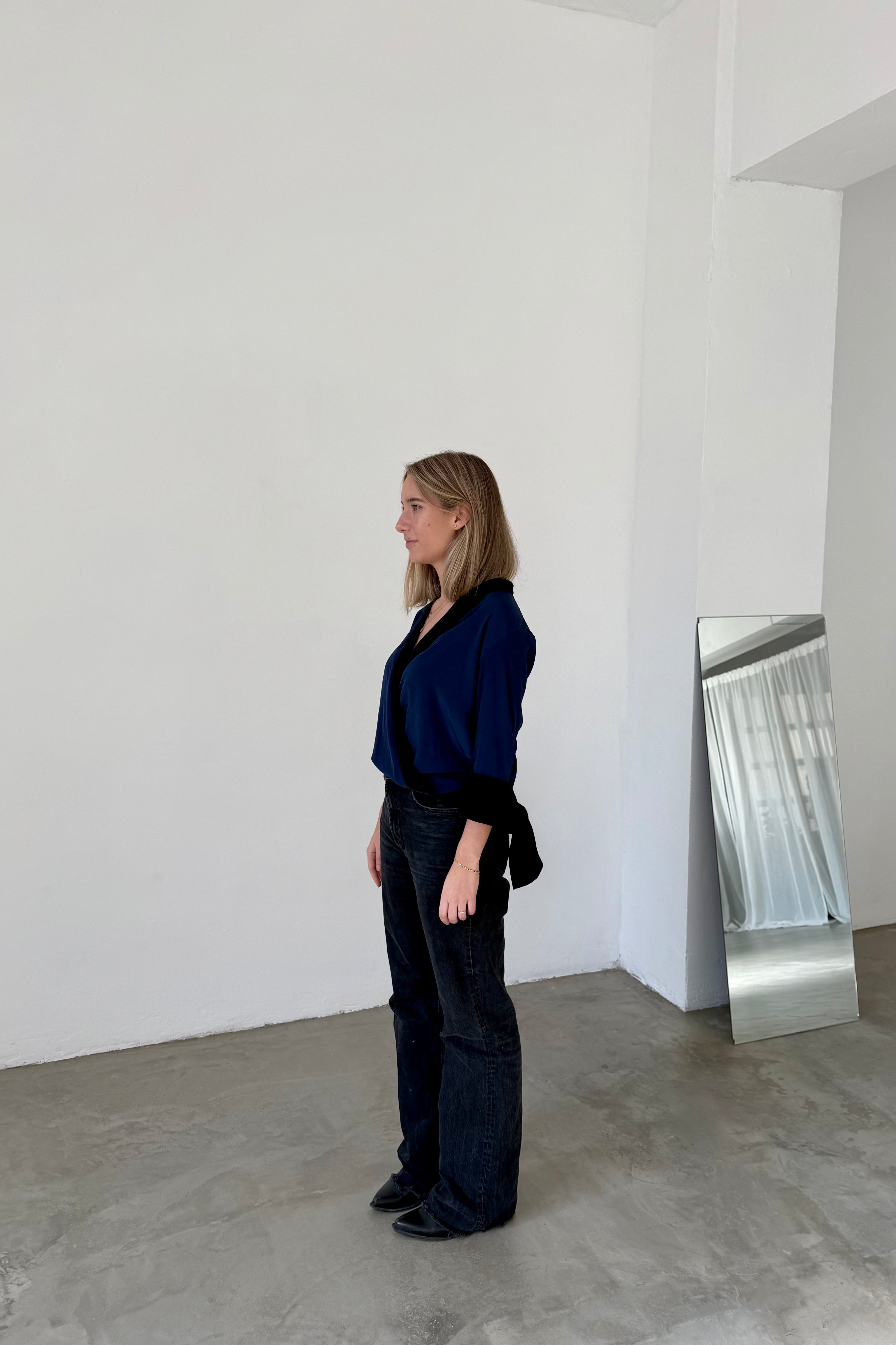 Blouse by Laagam in navy blue. Deep V-neckline with contrast trim detail. Long sleeves with straight, fluid construction.