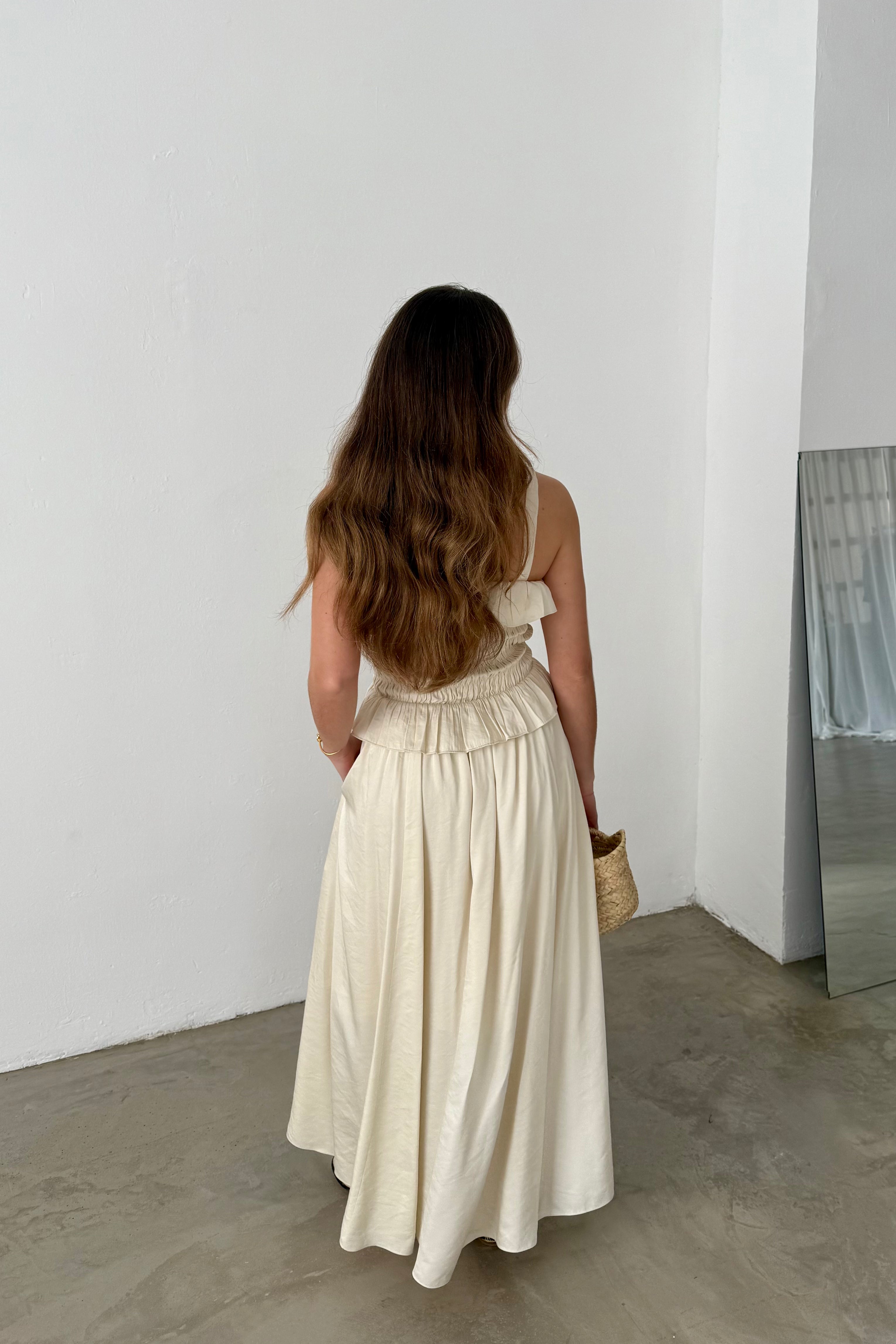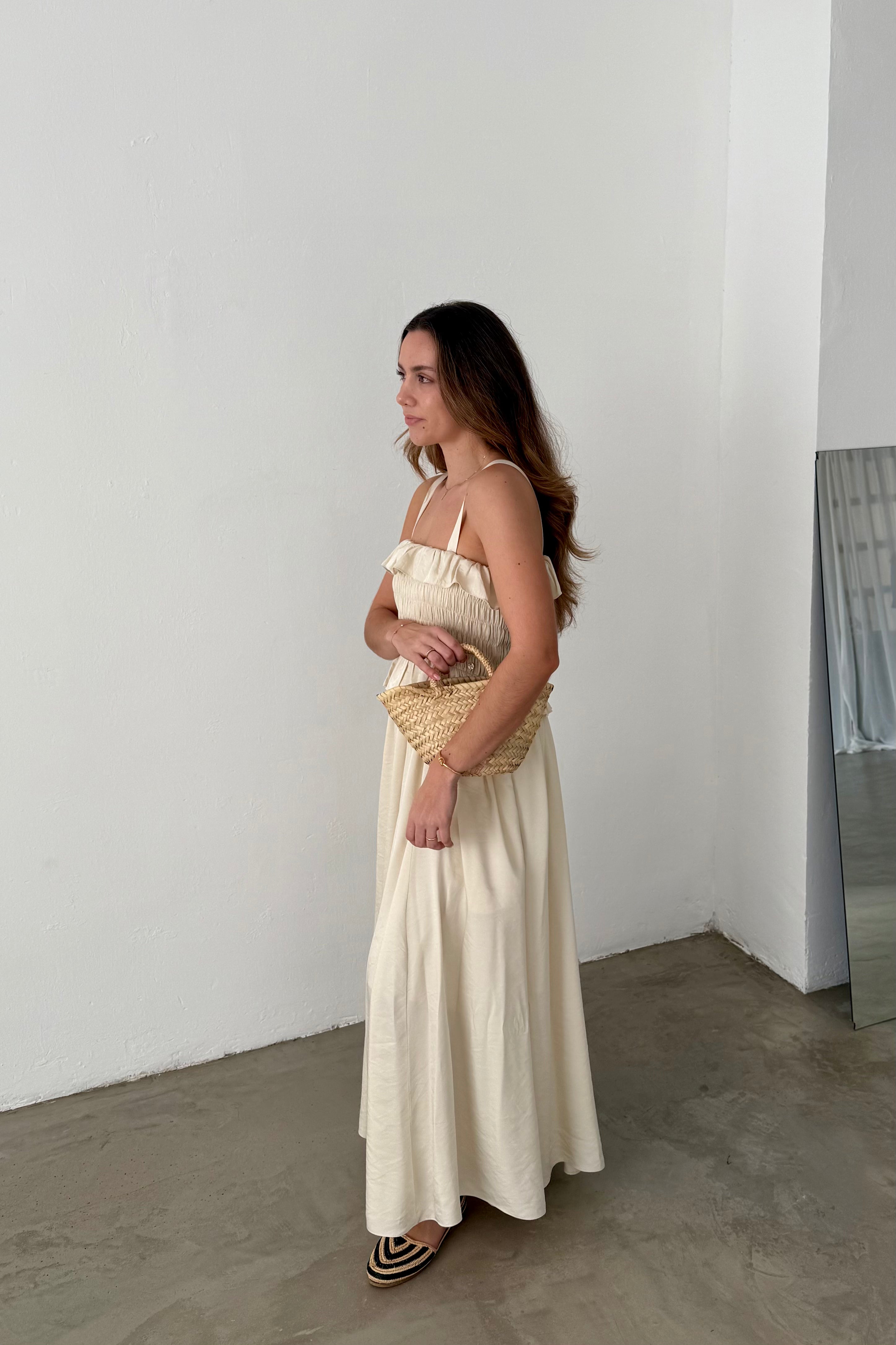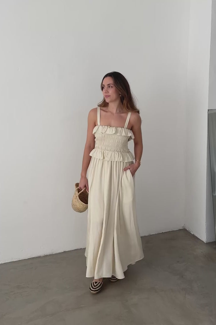 This Pedro del Hierro maxi dress is crafted from a light ivory fabric with a fluid, natural drape that enhances its feminine silhouette. The smocked bodice provides a fitted shape, while soft ruffles at the neckline and waist add delicate volume and texture.