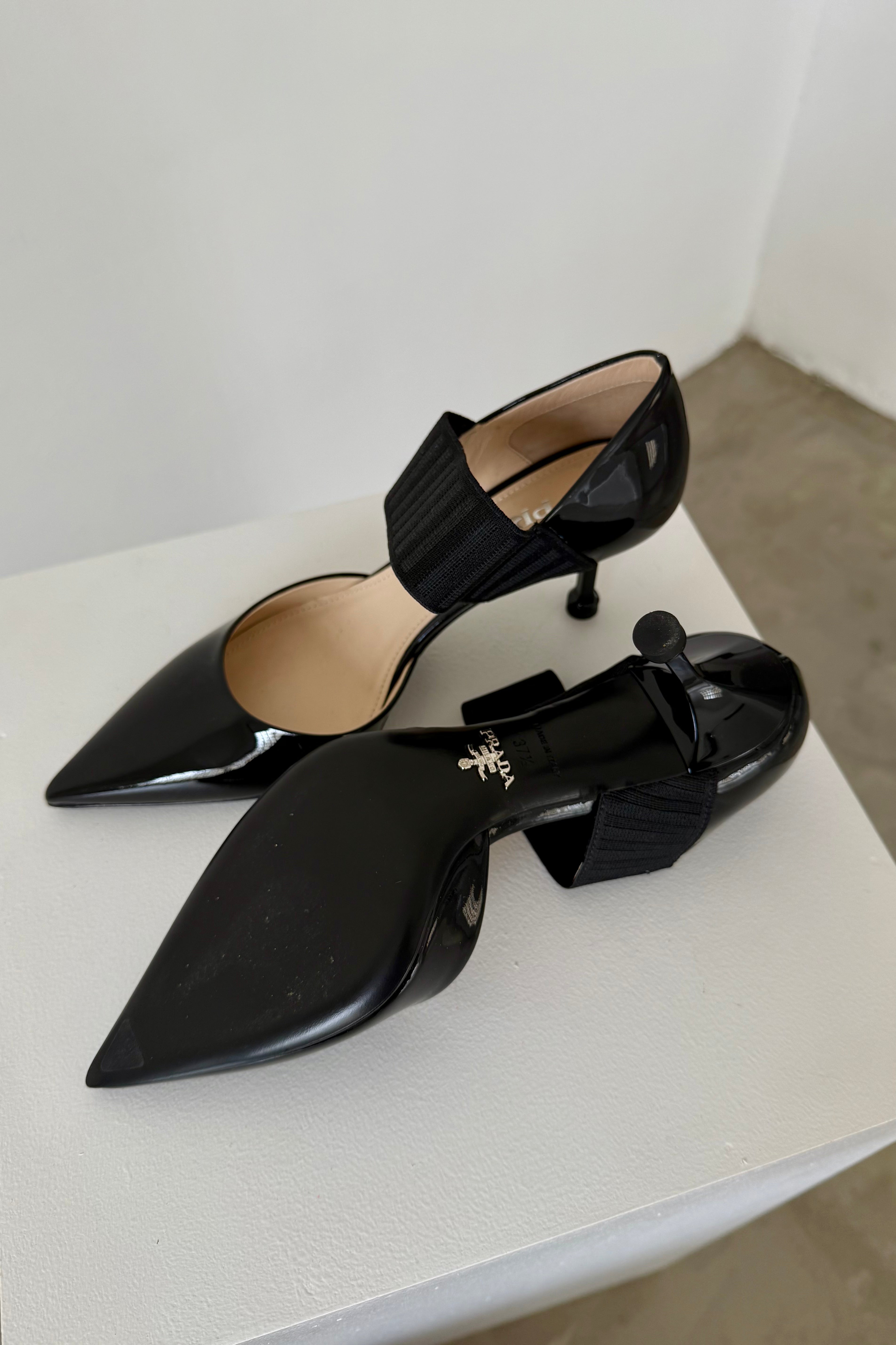 Prada Milano glossy black patent slingback heels featuring a sharply pointed toe and elasticated strap detail across the instep. The sculpted heel and sleek silhouette create a modern, architectural finish.
