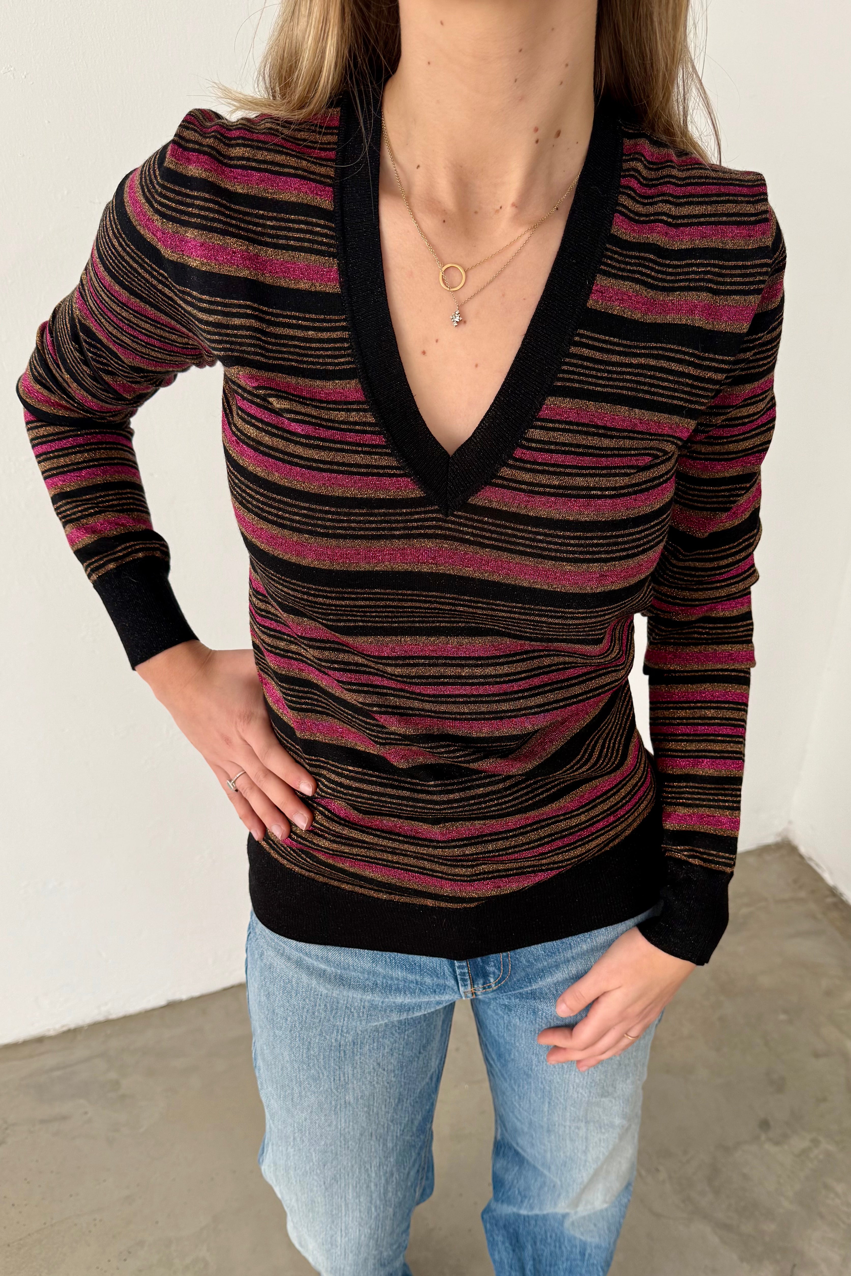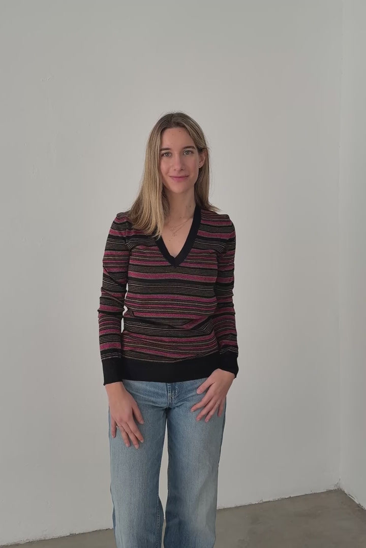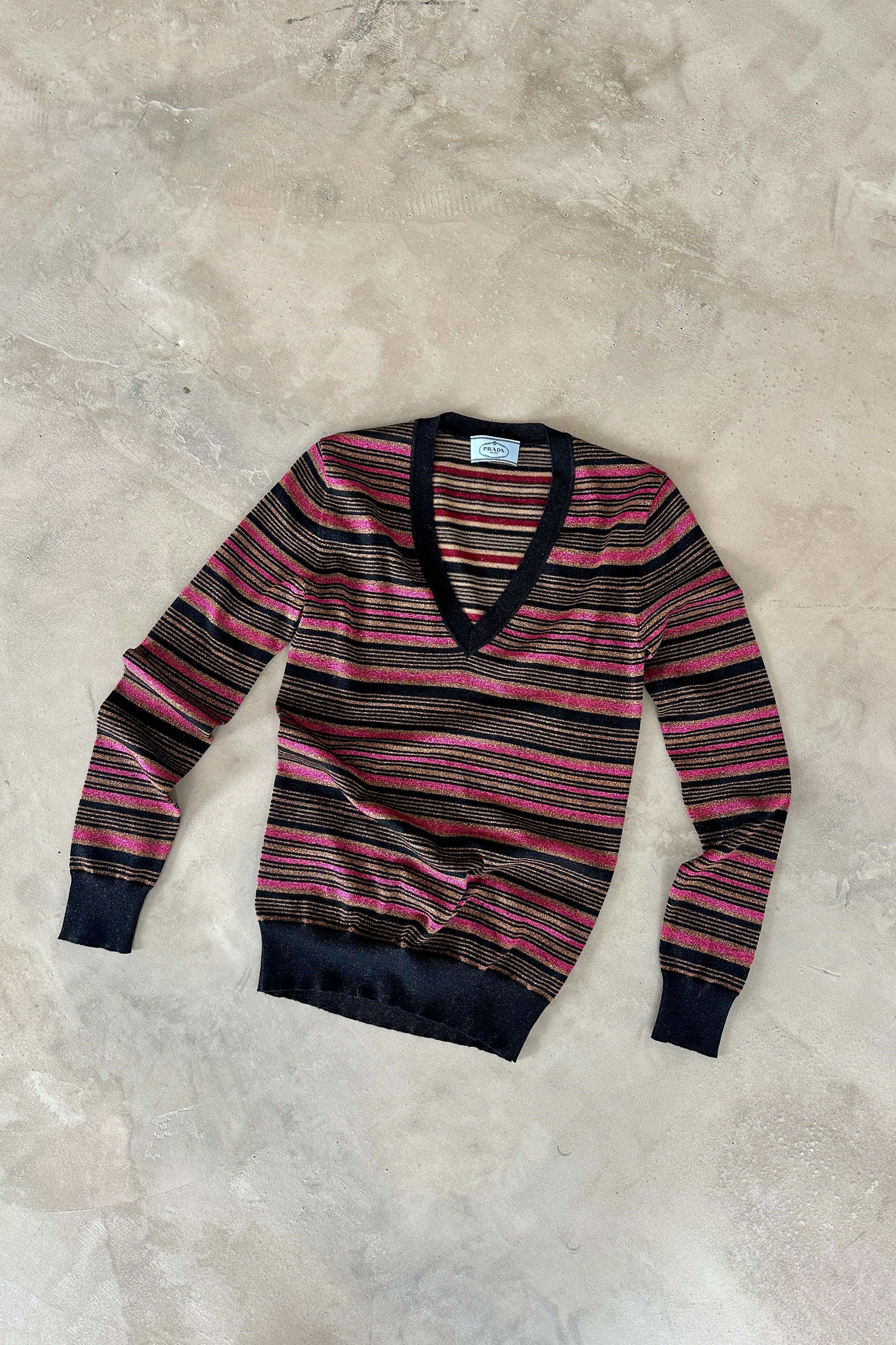 Elegant Prada Milano long-sleeve knit featuring multicolour stripes in black, pink and subtle metallic tones. The deep V-neckline adds refinement, while the fine knit texture provides lightweight comfort.