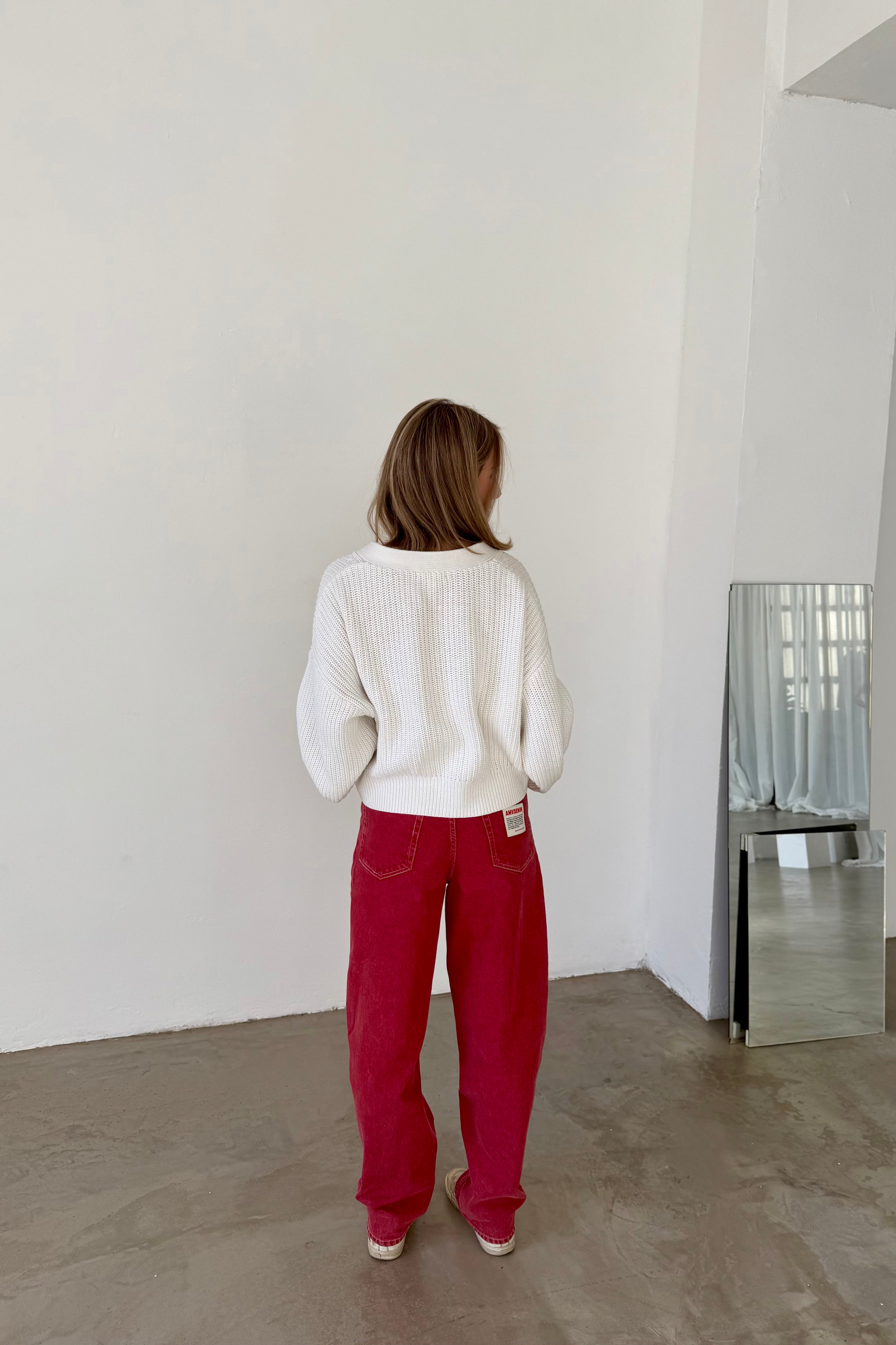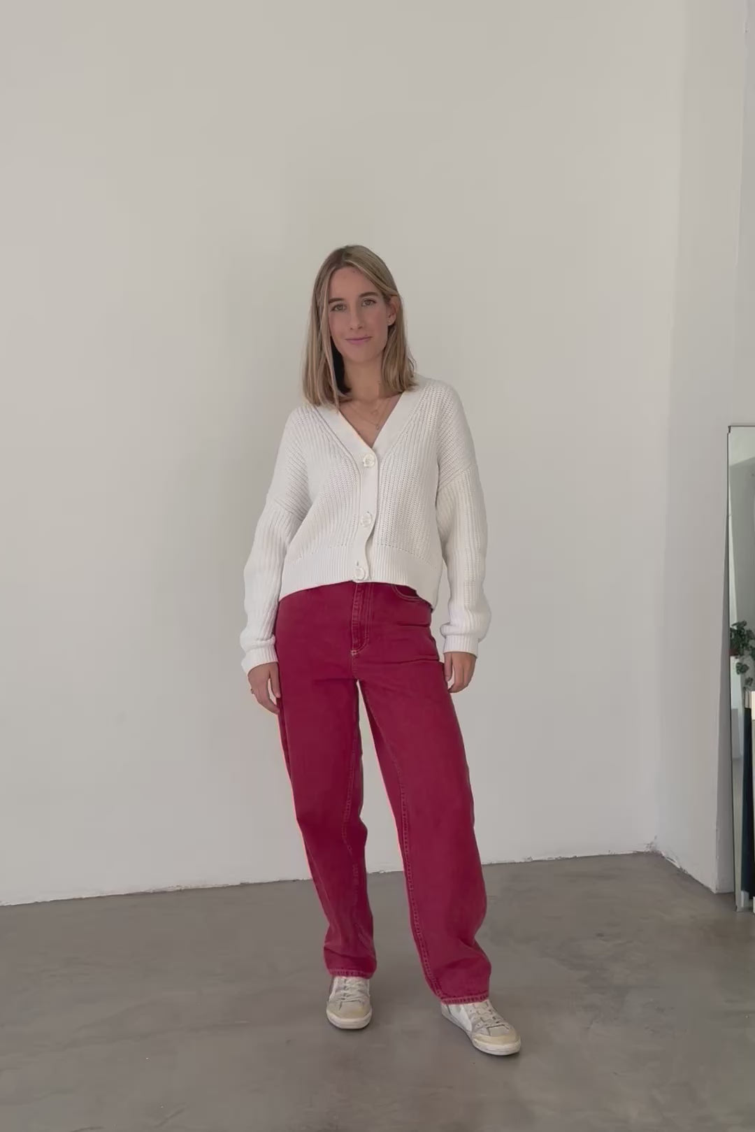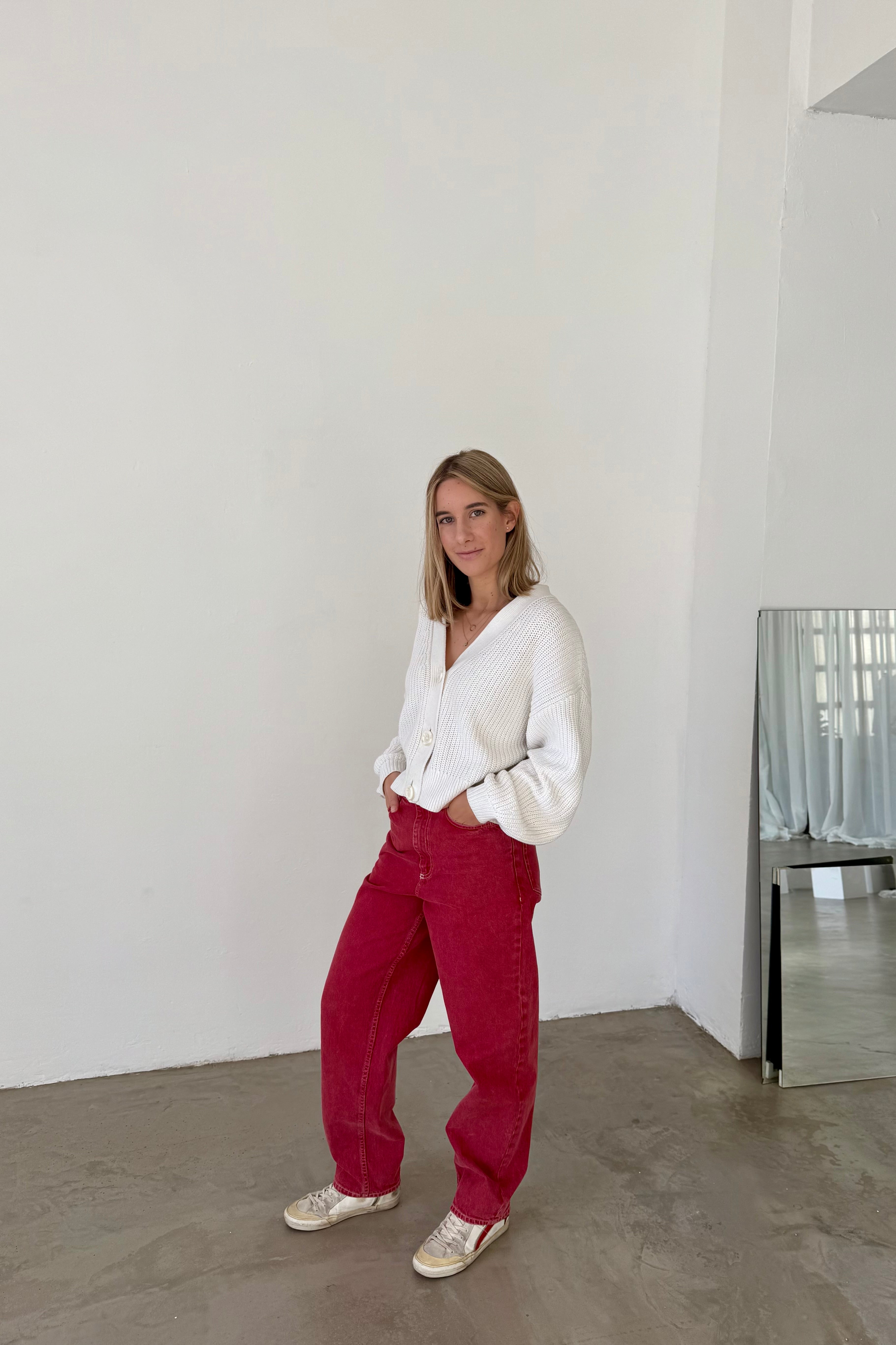 Washed red denim trousers with a high-rise waist and straight-leg cut. Crafted from durable yet soft cotton denim. Classic five-pocket design with a front button and zip closure.