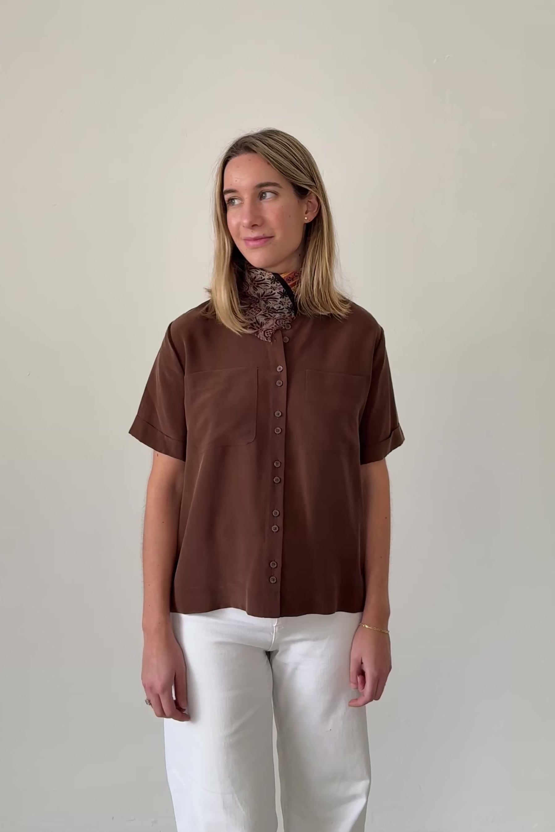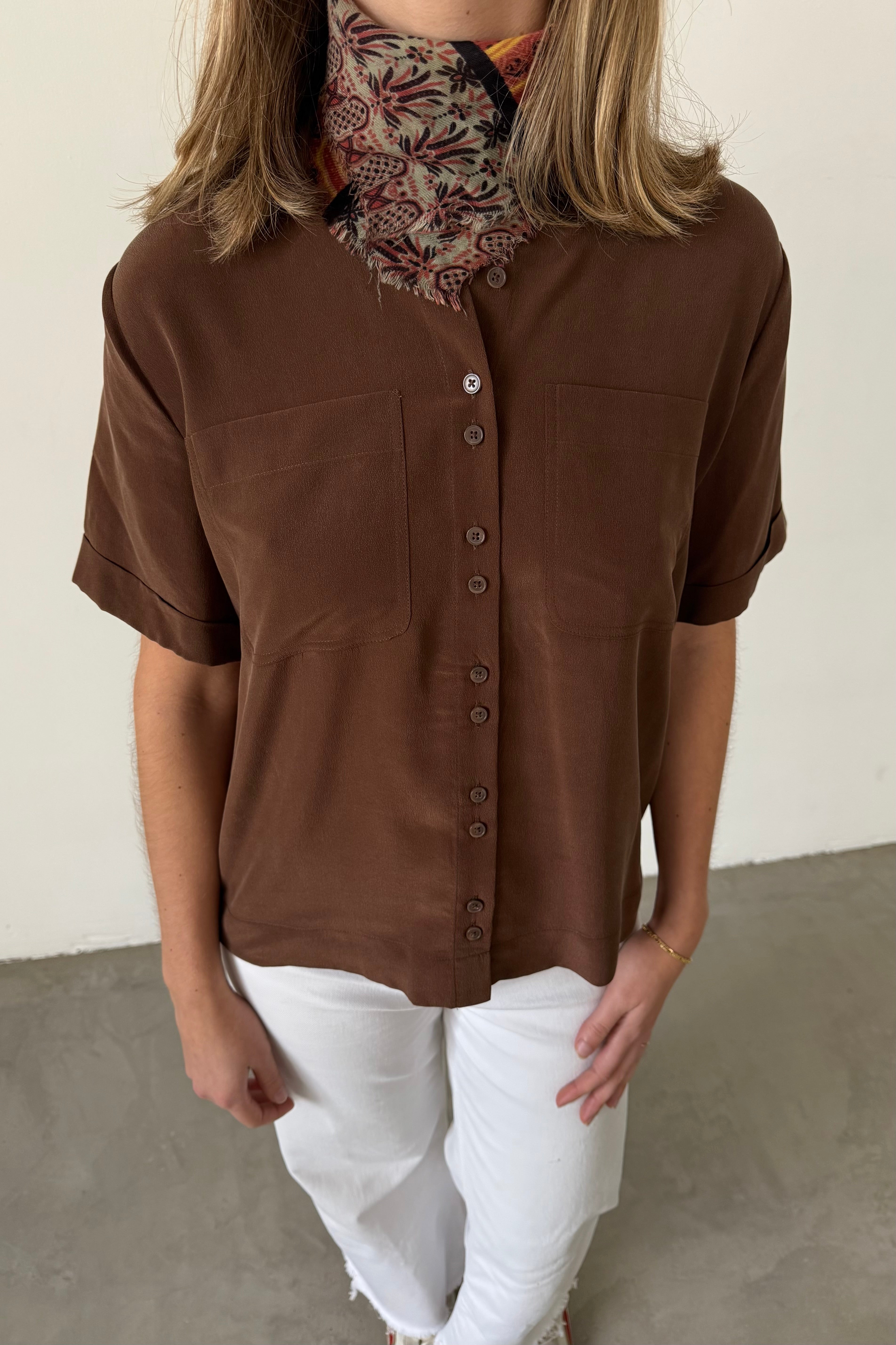 A Sézane short-sleeve blouse in a warm brown tone. Timeless, minimal, and versatile for everyday wear.
