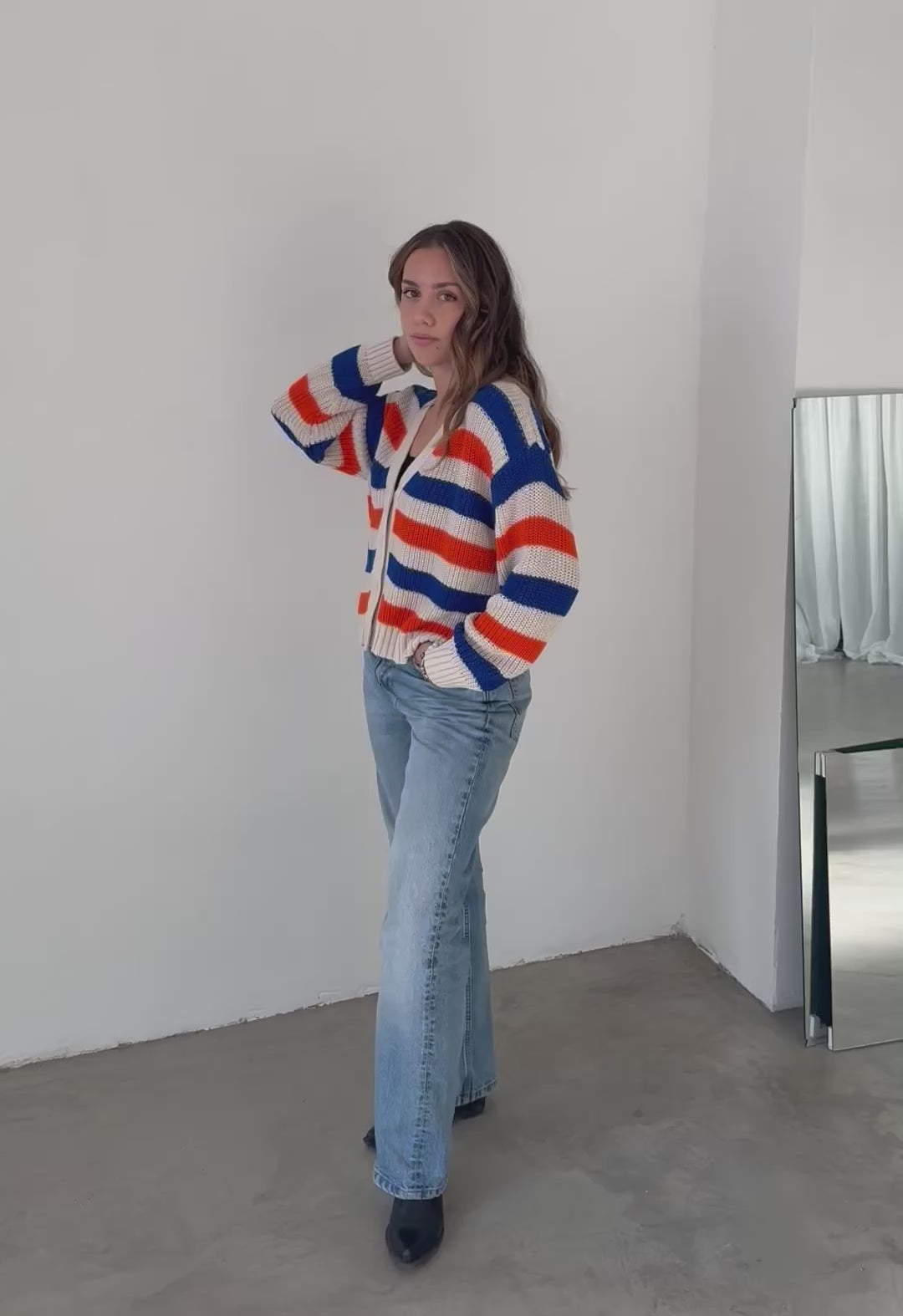 Chunky-knit cardigan with wide stripes in blue, orange, and ecru. Features a V-neckline and front button fastening with oversized buttons. Finished with wide ribbed cuffs and hem. Slightly cropped, relaxed silhouette.